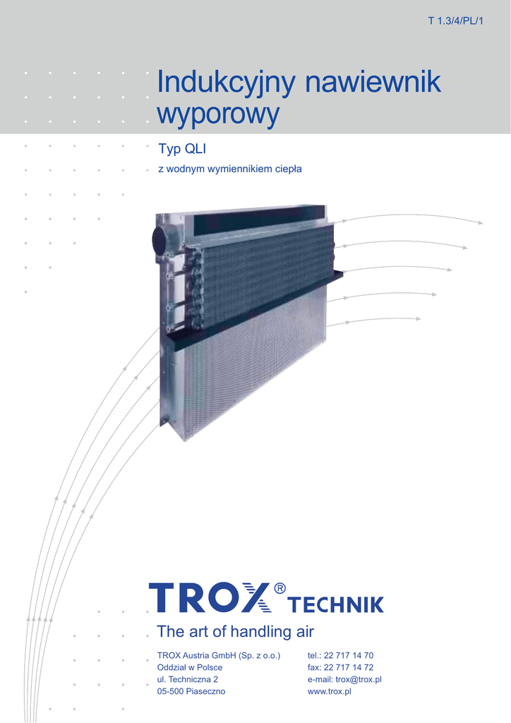 T 1.3/4/PL/1 Indukcyjny nawiewnik wyporowy Typ QLI z wodnym wymiennikiem ciepła The art of handling air TROX Austria GmbH (Sp. z o.o.) Oddział w Polsce ul. Techniczna 2 05-500 Piaseczno tel.: 22 717 14 70 fax: 22 717 14 72 e-mail: [email protected] www.trox.pl Opis Opis _______________________________________ 2 Konstrukcja · Wymiary · Materiały__________________ 3 Montaż_______________________________________ 4 Oznaczenia___________________________________ 5 Przegląd wydajności · Dane techniczne_____________ 6 Dane techniczne (od strony wody)_________________ 7 Informacje do zamawiania________________________ 8 Wygląd strugi w trybie chłodzenia Wygląd strugi w trybie ogrzewania bez powietrza pierwotnego Wygląd strugi w trybie ogrzewania z powietrzem pierwotnym Opis Indukcyjne nawiewniki wyporowe typu QLI z wymiennikiem ciepła stosowane w systemach klimatyzacji powietrznowodnej. Łączące ze sobą zalety nawiewnika wyporowego z korzyściami energetycznymi, jakie wynikają z zastosowania wody jako głównego nośnika chłodu. Wymagana ilość świeżego powietrza pierwotnego nawiewana jest poprzez okrągły przewód z dyszami. Powietrze wtórne indukowane z pomieszczenia do urządzenia przeciągane jest przez wodny wymiennik ciepła, gdzie jest ochładzane lub podgrzewane. W strefie mieszania nawiewnika QLI powietrze wtórne miesza się z pierwotnym a następnie zostaje nawiane do pomieszczenia przez perforowaną płytę i kratkę umieszczoną w obudowie osłony podokiennej. Uwaga ! W przypadku urządzenia bez tacki na skropliny temperatura wody chłodzącej musi być tak dobrana aby nie spadła poniżej temperatury punktu rosy pomieszczenia. 2 Ze względu na swoją zwartą konstrukcję nawiewniki wyporowe typu QLI szczególnie zalecane są do montażu na ścianie pod oknami za dodatkową osłoną przestrzeni podokiennej. Urządzenia stosowane mogą być w nowych budynkach i w obiektach modernizowanych. Wygląd osłony podokiennej może być dostosowany do aranżacji wnętrza z zachowaniem odpowiednich odległości, jak przedstawia rysunek na stronie 4. Dodatkowe straty ciśnienia kratki montowanej w obudowie podokiennej urządzenia powodować mogą zmniejszenie indukcji powietrza z pomieszczenia, dlatego wolny przekrój kratki powinien być ≥ 50%. Kratka indukcyjna zamontowana u góry : W= 150 mm Kratka indukcyjna zamontowana z boku : H= 250 mm Kratka nawiewna : H= 350 mm Konstrukcja · Wymiary · Materiały Konstrukcja Materiały Indukcyjny nawiewnik wyporowy typu QLI z wodnym wymiennikiem ciepła, obudową zawierającą nawiewną płytę perforowaną, kanałem powietrza pierwotnego z zamontowanymi dyszami nawiewnymi (dostępne różne wielkości dysz) oraz króćcem powietrza pierwotnego. Wymiennik ciepła może być wyposażony wariantowo dla systemu 2-rurowego w przyłącza dla wody lodowej lub ciepłej, systemu 4-rurowego w przyłącza dla wody lodowej i ciepłej. Na życzenie urządzenie może być dostarczone z tacką na kondensat, wspornikami do montażu ściennego i/lub podłogowego. Obudowa i perforowana płyta przednia wykonane z blachy stalowej ocynkowanej, kanał powietrza pierwotnego z zamontowanymi dyszami wykonany z blachy stalowej. W wersji standardowej obudowa jest galwanizowana, na życzenie może być lakierowana na czarno RAL 9005 (stopień połysku 70%). Kanał powietrza pierwotnego lakierowany na RAL 9005. Wymiennik ciepła wykonany z aluminiowych żeber, wężownica wykonana z miedzi. Wymiary w mm LN1) LA LB LC 900 940 883 975 1200 1240 1183 1275 1500 1540 1483 1575 1) LN = Nominalna długość wymiennika Widok Y WHL 195 139 195 139 172 Widok X WVL 172 ) 729 729 Kanał z dyszami Przyłącze wody G 1/2 ” gwint zewnętrzny 258 tylko dla systemu 4-rurowego 258 Kanał powietrza pierwotnego Wymiennik ciepła Tacka na kondensat (opcja) Wsporniki do montażu na ścianie (opcja) Śruby dla montażu ściennego lub podłogowego Wsporniki do montażu na podłodze (opcja) Obudowa Nawiewna płyta perforowana (dwa środkowe przyłącza tylko dla systemu 4-rurowego) Typ WVL LC LA 108 108 Typ WVL Typ WVR LB Typ WHL LC LA Typ WHL Typ WHR LB 3 Montaż Opcje montażu Typ WHR/L Typ WVR/L Typ WVR/L (Przyłącze wody z prawej lub lewej) (Przyłącze wody z prawej lub lewej) (Przyłącze wody z prawej lub lewej) min. 70 min. 70 min. 70 Osłona zewnętrzna (poza dostawą) Osłona zewnętrzna (poza dostawą) Osłona zewnętrzna (poza dostawą) Mocowanie (poza dostawą) Wsporniki ścienne Wsporniki podłogowe Mocowanie (poza dostawą) Śruby do mocowania na ścianie i/lub podłodze Mocowanie podłogowe Mocowanie ścienne 2 6.5 18 40 6 38 2 6.5 16.5 40 18 40 6.5 50 A 58 Typ A WVR / L 60 WHR / L 146.5 Na życzenie, mogą być dostarczone dodatkowe 2 wsporniki do montażu ściennego i/lub podłowego z wkrętami. 4 80 50 6.5 100 60 16.5 8 80 Oznaczenia Oznaczenia ∆t L w K: Różnica temp. pomiędzy pomieszczeniem t R a strugą t L ∆t Pr w K: Różnica temp. (pomieszczenie a powietrze pierwotne) ∆t W w K: Różnica temperatury wody: zasilanie a powrót ! . Pr Q Pr t Pr . t WRK Q WK . t WVH Q WH ∆t RWV w K: Różnica pomiędzy powietrzem w pomieszczeniu a temperaturą wody zasilającej ∆p t t WRH !WH w Pa: Strata ciśnienia po stronie powietrza pierwotnego t WVK !WK ∆p W w kPa: Strata ciśnienia po stronie wody tR w °C: Temperatura pomieszczenia t WVK w °C: Temperatura wody zasilającej - chłodzenie t WRK w °C: Temperatura wody powrotnej - chłodzenie t WVH w °C: Temperatura wody zasilającej - grzanie vL ∆t L . Q ges !Zul 100 t WRH w °C: Temperatura wody powrotnej - grzanie w °C: Temperatura powietrza pierwotnego t Pr FW . Q WH w . Q WK w . Q ges w . Q Pr w . QS w 1.5 m m 1,5 : Współczynnik korygujący dla wartości przepływu wody Wat: Moc grzewcza od strony wody Wat: Moc chłodnicza od strony wody . . Wat: Moc całkowita chłodzenie/grzanie QPr +QS Wat: Moc powietrza pierwotnego chłodzenie/grzanie Wat: Obciążenie termiczne . . po stronie wody. . (dl