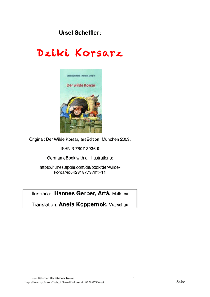 Ursel Scheffler: Dziki Korsarz Original: Der Wilde Korsar, arsEdition, München 2003, ISBN 3-7607-3936-9 German eBook with all illustrations: https://itunes.apple.com/de/book/der-wildekorsar/id542318773?mt=11 Ilustracje: Hannes Gerber, Artà, Mallorca Translation: Aneta Koppernok, Warschau Ursel Scheffler, Der schwarze Korsar, https://itunes.apple.com/de/book/der-wilde-korsar/id542318773?mt=11 1 Seite Dziki Korsarz 5. Dziki Korsarz (Der wilde Korsar) "Piraci! Piraci! ", alarmowali o świcie strażnicy na murach miejskich. Ale zbójcy już szturmowali ląd. Zabrali wszystko, co wydawało im się cenne. Nawet niektórych silnych żeglarzy. Rzucali palące się smolne pochodnie na statki, które cumowały w porcie i podpalali domy. Gdy przybyli żołnierze sułtana, rejwach już minął. Łodzie piratów oddaliły się. Pościg nie był możliwy, bo flota się paliła. 7. Minął ponad rok, aż to nadmorskie miasto wróciło do normalności po napadzie. Wtedy sułtan przygotował się do kontrataku. Przed urzędem dla chętnych w porcie tłoczyli się odważni mężczyźni, którzy chcieli polować na piratów. Wśród nich był też dziesięcioletni chłopiec. Nazywał się Mojżesz. Piraci porwali jego ojca. 2 Ursel Scheffler, Der schwarze Korsar, https://itunes.apple.com/de/book/der-wilde-korsar/id542318773?mt=11 Seite 8./9. Teraz chciał go szukać. "Polowania na piratów? Ty? Hahaha!", krzyknął kapitan portu pogardliwie. "Potrzebujemy dorosłych mężczyzn! Nie małych, mizernych malców i brzdąców. Kapujesz? " 10. Nieznajomy (Der Fremde) "Nie złość się, mój chłopcze!" wyszeptał głos za Mojżeszem. "Możesz polować ze mną na Czarnego Korsarza!" "Nie słyszałeś, jak mnie nazwał?" powiedział Mojżesz ze smutkiem. "Mały i mizerny!" "Mam plan, w którym ważne jest, że ktoś jest tak mały, jak ty. Umiesz wspinać się i żeglować?" "Jako syn rybaka nauczyłem się żeglować wcześniej niż chodzić. I na maszt wspinam się szybciej niż małpy. " "Więc jesteś dokładnie tym, kogo szukam! Chodź ze mną! " Nieznajomy poszedł z Mojżeszem do szałasu z łodziami na klifie i powiedział: "Mam na imię Ali. Jestem kupcem. I mam z Korsarzem pewne niedokończone sprawy. On napadł i splądrował trzy z moich statków handlowych. Jestem zrujnowany. " 11. "A ja mam na imię Mojżesz. Czarny Korsarz zabrał mojego ojca!", powiedział Mojżesz. "Znam kryjówkę pirata! Mieszka w zamku na wyspie Tortuga." "Czy mój ojciec jest tam uwięziony?" "Całkiem możliwe," powiedział nieznajomy. "Będę Ci więc towarzyszył," odpowiedział Mojżesz. 13. I plany (Der Plan) Ali wyciągnął mapy i plany. Ursel Scheffler, Der schwarze Korsar, https://itunes.apple.com/de/book/der-wilde-korsar/id542318773?mt=11 3 Seite Rozłożył mapę morza i wskazał na wyspę, która miała kształt żółwia. "Tu ukrywa się ten złoczyńca. Wokół wyspy są niebezpieczne rafy. Twierdza jest praktycznie nie do zdobycia. Tam przechowuje swoje łupy." "A jak chcesz się tam dostać?" Mojżesz zapytał zaciekawiony. "Podstępem. i przy pomocy kogoś, kto jest wystarczająco mały, żeby wspiąć się do maleńkiego okna z tyłu wieży w tej twierdzy! " Mojżesz wziął głęboki oddech. "A jaki jest twój plan?" "Potrzebuję tylko Ciebie i proszku nasennego, który mam tutaj." Wskazał na woreczek przy pasie. "Za trzy dni są urodziny Dzikiego Korsarza. Piraci będą świętować je hucznie, jak co roku. Ale nie długo! Chodź ze mną! Po drodze wyjaśnię ci wszystko! " 17. Na Wyspie Piratów (Auf derr Pirateninsel) Wiatr wiał mocno w żagle. Już koło południa Ali i Mojżesz dotarli do wyspy Tortuga. Wyglądała naprawdę na dziką i niezamieszkaną. Schowany za skałami Ali zarzucił kotwicę. 18. Obaj płynęli do brzegu. Po niebezpiecznej wspinaczce dotarli do tylnej strony starej twierdzy. Ponad gęstymi liśćmi drzew był widoczny mały otwór w ścianie wieży. 4 Ursel Scheffler, Der schwarze Korsar, https://itunes.apple.com/de/book/der-wilde-korsar/id542318773?mt=11 Seite "To okno wentylacyjne spiżarni!" szepnął Ali. "Nie zmieszczę się. próbowałem już. Zrobisz to?" Mojżesz skinął głową z przekonaniem. 19 Ali wręczył mu woreczek z proszkiem na sen i szepnął: "Wsyp wszystko do dużej beczki wina." Sprytnie jak jaszczurka Mojżesz wspiął się wysoko po ścianie i wślizgnął się do okienka. Ali obserwował go z niepokojem. 22 Trwało nieskończenie długo zanim Mojżesz wrócił. "Uff, było blisko", sapnął. "Miałem już wsypać proszek do beczki, jak przyszedł kucharz. Na szczęście, brał cebulę a nie wino! " "Sprytny chłopak!" powiedział Ali. "Proszek na pewno zadziała! " "I co teraz zrobimy?" zapytał Mojżesz. "Najgorsze, co można: Poczekamy!" westchnął Ali. "Nawet jeśli jest to trudne!" 23 Święto piratów (Das Piratenfest) W końcu nadszedł świt. Z ukrycia w koronie drzewa Ursel Scheffler, Der schwarze Korsar, https://itunes.apple.com/de/book/der-wilde-korsar/id542318773?mt=11 5 Seite Mojżesz i Ali obserwowali, jak piraci przenieśli beczkę wina z twierdzy i zaczęli świętować. Pachniało pieczonym dzikiem i rybą z grilla. "Opróżnijcie beczkę za moje zdrowie!", wykrzyknął Czarny Korsarz i poczęstował się w pierwszej kolejności. 24 Piraci napełniali kubki i dzbanki i wznosili toasty na jego cześć. Ale nie wyglądali na zmęczonych. Hałasowali i wydzierali się. 25 "Zdaje się, że proszek nie działa!" Mojżesz szeptał z niepokojem. "Piraci znoszą więcej niż inni," uspokoił go Ali. Wreszcie ziewnął jeden pirat. Potem kolejny i jeszcze jeden. 27 Była prawie północ, gdy ostatni zasnęli. W końcu zapadła cisza. 28 Stara twierdza (Die alte Festung) "Teraz potrzebujemy kluczy," wyszeptał Ali. "Wiszą one na pasie Dzikiego Korsarza" Bezszelestnie jak kot przekradł się Mojżesz do miejsca, gdzie było ognisko. Złapał klucze i pobiegł szybko z powrotem. "Teraz musimy dostać się do twierdzy!" ponaglał Ali. "Tajemne we
