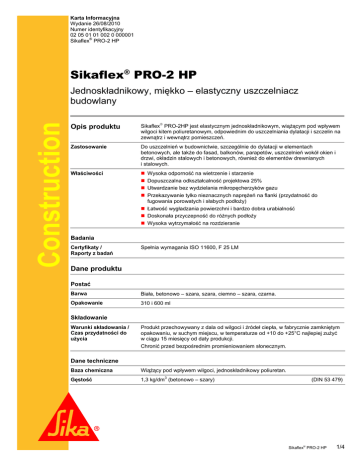 Karta Informacyjna Wydanie 26/08/2010 Numer identyfikacyjny 02 05 01 01 002 0 000001 Sikaflex® PRO-2 HP Sikaflex® PRO-2 HP Construction Jednoskładnikowy, miękko – elastyczny uszczelniacz budowlany Opis produktu Sikaflex PRO-2HP jest elastycznym jednoskładnikowym, wiążącym pod wpływem wilgoci kitem poliuretanowym, odpowiednim do uszczelniania dylatacji i szczelin na zewnątrz i wewnątrz pomieszczeń. Zastosowanie Do uszczelnień w budownictwie, szczególnie do dylatacji w elementach betonowych, ale także do fasad, balkonów, parapetów, uszczelnień wokół okien i drzwi, okładzin stalowych i betonowych, również do elementów drewnianych i stalowych. Właściwości Wysoka odporność na wietrzenie i starzenie Dopuszczalna odkształcalność projektowa 25% Utwardzanie bez wydzielania mikropęcherzyków gazu Przekazywanie tylko nieznacznych naprężeń na flanki (przydatność do fugowania porowatych i słabych podłoży) Łatwość wygładzania powierzchni i bardzo dobra urabialność Doskonała przyczepność do różnych podłoży Wysoka wytrzymałość na rozdzieranie Badania Certyfikaty / Raporty z badań Spełnia wymagania ISO 11600, F 25 LM Dane produktu Postać Barwa Biała, betonowo – szara, szara, ciemno – szara, czarna. Opakowanie 310 i 600 ml Składowanie Warunki składowania / Czas przydatności do użycia Produkt przechowywany z dala od wilgoci i źródeł ciepła, w fabrycznie zamkniętym opakowaniu, w suchym miejscu, w temperaturze od +10 do +25°C najlepiej zużyć w ciągu 15 miesięcy od daty produkcji. Chronić przed bezpośrednim promieniowaniem słonecznym. Dane techniczne Baza chemiczna Wiążący pod wpływem wilgoci, jednoskładnikowy poliuretan. Gęstość 3 1,3 kg/dm (betonowo – szary) (DIN 53 479) Sikaflex® PRO-2 HP 1/4 Czas naskórkowania ~60 ÷ 120 minut (w +23°C, 50% w.w.) Szybkość utwardzania ~2 ÷ 3 mm na dobę (w +23°C, 50% w.w.) Możliwość odkształcenia 25% Wymiary szczeliny Minimalna szerokość 10 mm / Maksymalna szerokość 40 mm Stabilność 0 mm, bardzo dobra Temperatura użytkowania -40°C÷+70°C Emisja LZO/VOC emisja LZO/VOC < 30g/l USGBC Klasyfikacja LEED Sikaflex® PRO 2 HP materiał zgodny z regułami LEED (Leadership in Energy & Environmental Design) Section EQ (Indoor Environmental Quality), Credit 4.1: Low – Emitting Materials: Sealants, Primers, Adhesives; Credit 4.2: Low – Emitting Materials: Paints & Coatings SCAQMD Method 304-91. (DIN EN ISO 7390) Właściwości mechaniczne Wytrzymałość na rozdzieranie ~7 N/mm (w +23°C, 50% w.w.) (DIN 53 515) Twardość Shore A ~25 po 28 dniach (w +23°C, 50% w.w.) (DIN 53 505) Moduł sprężystości E (DIN EN ISO 8340) W +23°C, 50% wilg. wzgl. W -20°C ~0,3 N/mm² przy wydłużeniu 100% ~0,6 N/mm² przy wydłużeniu 100% Wydłużenie przy zerwaniu ~800% (w +23°C, 50% w.w.) Powrót poodkształceniowy >80% (w +23°C, 50% w.w.) (DIN 53 504) (DIN EN ISO 7389 B) Informacje o systemie Szczegóły aplikacji Zużycie / projektowanie szczeliny Szerokość szczeliny należy dobrać w ten sposób, aby wypełnienie mogło przenieść jej ruchy. Szerokość szczeliny powinna wynosić od 10 do 40 mm. Proporcja szerokości do głębokości wypełnienia powinna wynosić około 2:1. Standardowe wymiary wypełnienia elementów betonowych (wg DIN 18 540 / tabl. 3) Odległość między szczelinami 2m 2÷3,5 m 3,5÷5 m 5÷6,5 m 6,5÷8 m Projektowana szerokość szczeliny 15 mm 20 mm 25 mm 30 mm 35 mm Minimalna szerokość szczeliny 10 mm 15 mm 20 mm 25 mm 30 mm Głębokość szczeliny 8 mm 10 mm 12 mm 15 mm 15 mm Minimalna szerokość wypełnienia wokół okien wynosi 10 mm. Szczelinę należy starannie zwymiarować. Przy kalkulacji wymaganej szerokości szczeliny należy wziąć pod uwagę właściwości techniczne materiału wypełniającego, warunki podłoża, czynniki oddziałujące na elementy budowli ich konstrukcję i wymiary Orientacyjne zużycie Szerokość szczeliny 10 mm 15 mm 20 mm 25 mm 30 mm Głębokość szczeliny 8 mm 8 mm 10 mm 12 mm 15 mm Długość wypełnienia z opakowania 600 ml ~7,5 m ~4,5 m ~2,5 m 1,6 m ~1,3 m Podparcie wypełnienia: stosować wyłącznie materiał kompatybilny z uszczelnieniem, o zamkniętej strukturze, Sika® Rundschnur – sznur ze spienionego polietylenu. Sikaflex® PRO-2 HP 2/4 Jakość podłoża Podłoże musi być czyste i suche, jednorodne, wolne od zatłuszczeń, pyłu i luźnych cząstek. Farby, mleczko cementowe, luźno związane z podłożem cząstki należy bezwzględnie usunąć. Przygotowanie podłoża Podłoża nie porowate Jak metale, powłoki proszkowe itp. muszą być delikatnie uszorstnione drobnym ® ® ścierniwem i oczyszczone ściereczką nasączoną Sika Aktivator-205 (Sika Cleaner-205). Po odczekaniu do odparowania rozpuszczalnika (co najmniej 15 minut) należy ® nanieść na podłoże za pomocą pędzla Sika Primer-3 N i ponownie odczekać do odparowania rozpuszczalnika przynajmniej 15 minut (maksymalnie 8 godzin) Do gruntowania PCW należy użyć Sika® Primer-215, odczekać do odparowania rozpuszczalnika przynajmniej 15 minut (maksymalnie 8 godzin). Podłoża porowate Jak beton, zaprawy na bazie cementu, cegły itp. należy zagruntować za pomocą ® pędzla Sika Primer-3 N i odczekać do odparowania rozpuszczalnika, co najmniej 15 minut (maksimum 8 godzin). Primery tylko polepszają przyczepność, nie zastępują oczyszczenia powierzchni i nie poprawiają wytrzymałości podłoża. Warunki aplikacji Temperatura podłoża Minimum +5°C / Maksimum +40°C Temperatura otoczenia Minimum +5°C / Maksimum +40°C Wilgotność podłoża Podłoże powinno być suche. Instrukcja aplikacji ® Sposoby aplikacji / narzędzia Sikaflex -PRO-2 HP jest dostarczany w postaci gotowej do użycia. Po odpowiednim przygotowaniu szczeliny, należy wcisnąć w nią na odpowiednią głębokość materiał podpierający (Sika® Rundschnur) i jeżeli jest to konieczne ® zagruntować. Sikaflex -PRO-2 HP wyciskać z pistoletu w taki sposób, ab