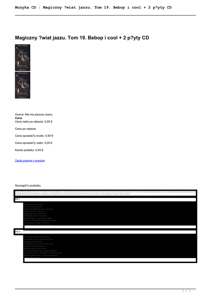Muzyka CD : Magiczny ?wiat jazzu. Tom 19. Bebop i cool + 2 p?yty CD Magiczny ?wiat jazzu. Tom 19. Bebop i cool + 2 p?yty CD Ocena: Nie ma jeszcze oceny Cena Cena netto po rabacie: 5,05 € Cena po rabacie Cena sprzeda?y brutto: 5,50 € Cena sprzeda?y netto: 5,05 € Kwota podatku: 0,45 € Zadaj pytanie o produkt Szczegó?y produktu "Rzeczpospolita" poleca "Magiczny ?wiat Jazzu". Poznaj histori? ?wiatowego i polskiego jazzu - najlepsze brzmienia, wybitni arty?ci. Bebop to styl, który w historii jazzu nast?pi? po swingu. Bebop lubi? improwizacj?, szybkie tempo i du?? ró?norodno?? akordów. Natomiast jego nast?pca - cool jazz - jest znacznie l?ejszy, unika improwizowania, jest bli?szy europejskiej klasycznej muzyce orkiestralnej. Dzi?ki najwybitniejszym przedstawicielom obu tych stylów, których utwory zamie?cili?my na p?ytach, w pe?ni doceniamy, na czym polega pi?kno i nowatorstwo bebopu i cool jazzu. CD 1 1.CAPRI (Gryce) 3:38 Jay Jay Johnson 2.SEXTET (Mulligan) 3:00 Lee Konitz 3.SPUR OF THE MOMENT (Parlen) 8:28 Charles Mingus 4.DONNA LEE (Parker) 3:12 Miles Davis 5.TEMPUS FUGIT (Powell) 2:27 Bud Powell 6.MARMADUKE (Parker) 2:41 Charlie Parker 7.MANTECA (Gillespie - Gonzales) 3:05 Dizzy Gillespie 8.NIGHTS AT THE TURNTABLE (Mulligan) 2:53 Gerry Mulligan 9.COOL MAMBO (Stitt - Massey) 2:38 Sonny Stitt 10.STRAIGHT NO CHASER (Monk) 2:55 Thelonious Monk CD 2 1.DON'T ARGUE (Winding) 3:01 Jay Jay Johnson 2.FOOLIN' MYSELF (Tinturin - Lawrence) 6:03 Lee Konitz 3.DIDI (Rogers) 2:26 Shorty Rogers 4.SALT PEANUTS (Gillespie - Clarke) 3:13 Dizzy Gillespie 5.EZZ-THETIC (Russell) 2:53 Miles Davis 6.EVONCE (Quebec) 3:04 Thelonious Monk 7.I'VE FOUND A NEW BABY (Palmer - Williams) 2:39 Don Byas 8.ALL GOD'S CHILLUM GOT RHYTHM (Kaper - Jurman) 2:58 Sonny Stitt 9.DARN THAT DREAM (DeLange - Van Heusen) 3:23 Miles Davis 10.A DANDY LINE (Baker) 6:24 1 / 1 Powered by TCPDF (www.tcpdf.org)