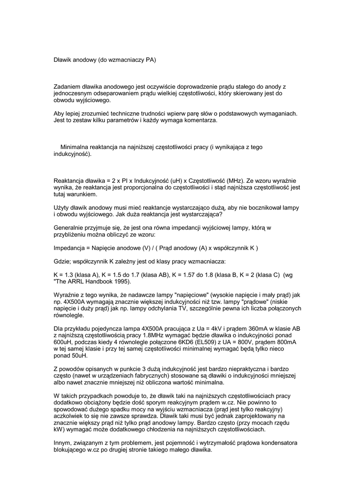 Dławik anodowy (do wzmacniaczy PA) Zadaniem dławika anodowego jest oczywiście doprowadzenie prądu stałego do anody z jednoczesnym odseparowaniem prądu wielkiej częstotliwości, który skierowany jest do obwodu wyjściowego. Aby lepiej zrozumieć techniczne trudności wpierw parę słów o podstawowych wymaganiach. Jest to zestaw kilku parametrów i każdy wymaga komentarza. Minimalna reaktancja na najniższej częstotliwości pracy (i wynikająca z tego indukcyjność). Reaktancja dławika = 2 x PI x Indukcyjność (uH) x Częstotliwość (MHz). Ze wzoru wyraźnie wynika, że reaktancja jest proporcjonalna do częstotliwości i stąd najniższa częstotliwość jest tutaj warunkiem. Użyty dławik anodowy musi mieć reaktancje wystarczająco dużą, aby nie bocznikował lampy i obwodu wyjściowego. Jak duża reaktancja jest wystarczająca? Generalnie przyjmuje się, że jest ona równa impedancji wyjściowej lampy, którą w przybliżeniu można obliczyć ze wzoru: Impedancja = Napięcie anodowe (V) / ( Prąd anodowy (A) x współczynnik K ) Gdzie; współczynnik K zależny jest od klasy pracy wzmacniacza: K = 1.3 (klasa A), K = 1.5 do 1.7 (klasa AB), K = 1.57 do 1.8 (klasa B, K = 2 (klasa C) (wg "The ARRL Handbook 1995). Wyraźnie z tego wynika, że nadawcze lampy "napięciowe" (wysokie napięcie i mały prąd) jak np. 4X500A wymagają znacznie większej indukcyjności niż tzw. lampy "prądowe" (niskie napięcie i duży prąd) jak np. lampy odchylania TV, szczególnie pewna ich liczba połączonych równolegle. Dla przykładu pojedyncza lampa 4X500A pracująca z Ua = 4kV i prądem 360mA w klasie AB z najniższą częstotliwością pracy 1.8MHz wymagać będzie dławika o indukcyjności ponad 600uH, podczas kiedy 4 równolegle połączone 6KD6 (EL509) z UA = 800V, prądem 800mA w tej samej klasie i przy tej samej częstotliwości minimalnej wymagać będą tylko nieco ponad 50uH. Z powodów opisanych w punkcie 3 dużą indukcyjność jest bardzo niepraktyczna i bardzo często (nawet w urządzeniach fabrycznych) stosowane są dławiki o indukcyjności mniejszej albo nawet znacznie mniejszej niż obliczona wartość minimalna. W takich przypadkach powoduje to, że dławik taki na najniższych częstotliwościach pracy dodatkowo obciążony będzie dość sporym reakcyjnym prądem w.cz. Nie powinno to spowodować dużego spadku mocy na wyjściu wzmacniacza (prąd jest tylko reakcyjny) aczkolwiek to się nie zawsze sprawdza. Dławik taki musi być jednak zaprojektowany na znacznie większy prąd niż tylko prąd anodowy lampy. Bardzo często (przy mocach rzędu kW) wymagać może dodatkowego chłodzenia na najniższych częstotliwościach. Innym, związanym z tym problemem, jest pojemność i wytrzymałość prądowa kondensatora blokującego w.cz po drugiej stronie takiego małego dławika. Dobór takiego kondensatora (poza wytrzymałością napięciową) nie jest typowo krytyczny, jeśli dławik ma wystarczająco dużą indukcyjność. Jeśli jednak jest to dławik o stosunkowo malej indukcyjności, wtedy bardzo duży prąd w.cz (na najniższej częstotliwości pracy) wymagać będzie nie tylko kondensatora o znacznie większej pojemności, ale także i o dużej wytrzymałości prądowej w.cz. Typowo zakłada się, że napięcie w.cz na drugiej stronie (stronie zasilacza) nie powinno przekraczać 10V rms, szczególnie, jeśli w zasilaczu użyte są kondensatory elektrolityczne. Wynika to z faktu, że obecność w.cz będzie je dodatkowo nagrzewała a ich trwałość dramatycznie zależy od temperatury. Dla przykładu: załóżmy, że mamy lampę 4X500A pracująca w warunkach, jak opisane powyżej, ale z dławikiem o indukcyjności tylko 150uH i reaktancji 1700 Ohm na częstotliwości 1.8MHz. Napięcie wyjściowe (na anodzie) w.cz będzie prawdopodobnie rzędu 3500V wartości szczytowej i 2500V wartości skutecznej (rms). Na częstotliwości 1.8MHz reakcyjny prąd w.cz w tym dławiku wyniesie I = 2500 / 1700 Ohm = 1.47A. Jest to już wartość zdecydowanie za duża dla typowych wysokonapięciowych kondensatorów typu TV. Aby utrzymać napięcie w.cz na tym kondensatorze 10V max. jego reaktancja pojemnościowa musi być maksymalnie XC = 10V / 1.47A = 6.8 Ohm. Na częstotliwości 1.8MHz wymaga to kondensatora o pojemności minimum 13nF (!). Nie jest to łatwe wymaganie i w praktyce może być osiągnięte przez użycie pewnej ilości mniejszych kondensatorów i w ten sposób rozłożenie prądu . Wytrzymałość prądowa Prąd anodowy wzmacniacza lampowego nawet o bardzo dużej mocy rzadko przekracza 1A. Typowy dławik anodowy ma uzwojenie w jednej tylko warstwie, więc chłodzenie przewodu nawojowego jest z reguły bardzo dobre. Z tego też powodu dość bezpiecznie założyć można obciążenie przewodu nawojowego nawet do 10A na milimetr kwadratowy. Czyli, że nawet dla bardzo dużego wzmacniacza lampowego przewód o średnicy rzędu 0.4mm w zupełności wystarczy, nawet, jeżeli wzmacniacz taki pracuje w sposób ciągły, a bardzo często używane są przewody jeszcze cieńsze.. Jeżeli jednak indukcyjność takiego dławika jest mniejsza niż wymagana minimalna na najniższej częstotliwości pracy wzmacniacza, wtedy dodatkowo pojawi się tez dość spory reakcyjny prąd w.cz, który wymagać będzie nieco grubszego przewodu. Obecność rezonansów To jest chyba najtrudniejszy parametr dławika anodowego. Absolutnie każdy dławik będzie miał rezonanse i jest to coś, z czym musimy się pogodzić, czy się to nam podoba czy nie. Są one spowodowane kombinacją indukcyjności dławika i pojemnościami między zwojowymi. Konstrukcja dławika jest również czynnikiem mającym wpływ na rozkład rezonansów. Pierwszy jest rezonans równoległy a następnie szeregowy i w miarę wzrostu częstotliwości oba rezonanse będą występowały na przemian. To zjawisko powoduje, że rzeczywista impedancja dławika na wyższych częstotliwościach będzie znacznie mniejsza niż jego teoret