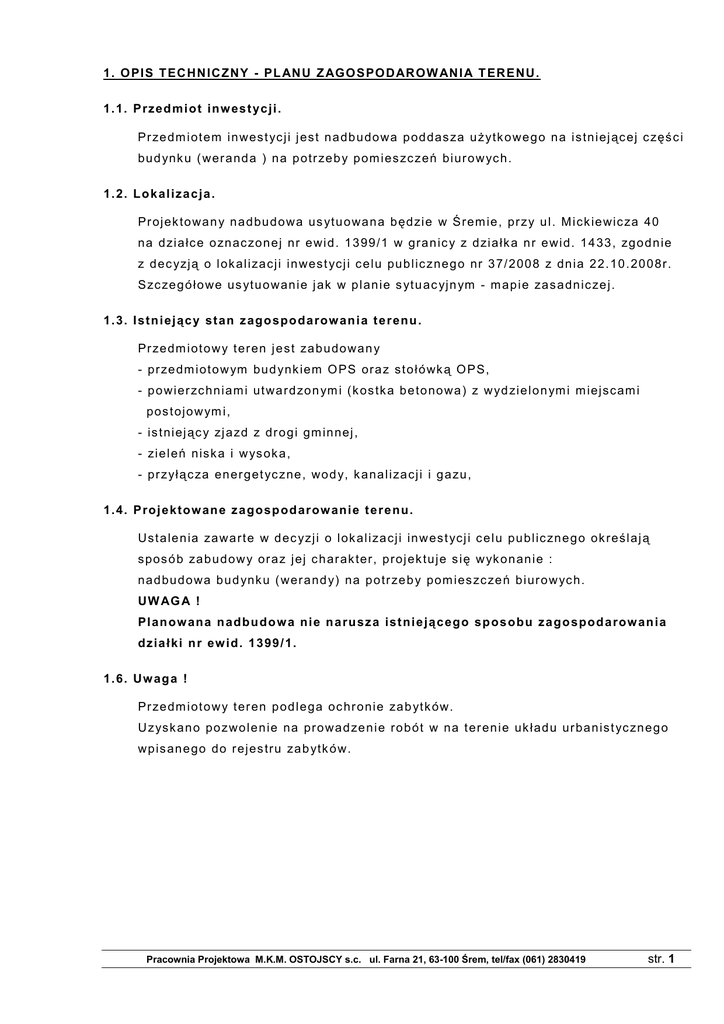 1. O PI S T EC HN IC Z NY - PL AN U Z AG O S PO D AR O W AN I A T ER E NU . 1. 1. P rz ed mi o t in w es t yc ji . Pr ze dm i ot em i n wes t yc j i j es t n a db u do wa p od das za u Ŝ ytk o we g o n a i s tn i ej ąc ej c zę ś c i bu d ynk u ( wer a nd a ) n a p otr ze b y p om i es zc z eń bi ur o w yc h . 1. 2. L o k al iz a c ja . Pr oj ek to wa n y n a d bu d o wa us yt u o wa n a b ęd zi e w Ś r em ie , pr z y u l . M i c k ie wic za 40 na d zi a łc e o zn ac zo n ej nr e wi d . 1 3 99 /1 w gr a n ic y z d zi a łk a n r e wi d. 1 4 33 , zg o d n ie z d ec yzj ą o l ok al i za c j i i n wes t yc j i c e l u pu b l ic z ne g o nr 3 7/ 2 00 8 z dn i a 2 2. 10 . 20 0 8r . S zc ze g ó ł o we us yt u o wan i e j ak w p l an i e s yt u ac yj n ym - m ap i e za s a dn ic ze j . 1. 3. I st n i ej ąc y st an z ag o sp o d a ro w an i a t e r en u . Pr ze dm i ot o w y t er en j e s t za b u do wa n y - pr ze dm i ot o w ym bu d ynk iem O PS or a z s t o ł ó wk ą O P S, - p o wi er zc hn i am i ut wa r d zo n ym i ( k os tk a b e to no wa ) z w yd zi e l o n ym i m iej s c am i pos t oj o w ym i , - is t ni ej ąc y zj a zd z dr o g i gm in nej , - zi e l eń nis k a i w ys ok a , - pr z ył ą c za en er g et yc z ne , wo d y, k a na l i za c j i i g a zu , 1. 4. P ro j e kt o w an e z a g o sp o d ar o w an i e t e r e n u . Us t a le n ia za wa r t e w d ec yzj i o l ok al i za c j i in w es t yc j i c e l u pu b l ic zn e g o ok r eś l aj ą s pos ó b za b u d o w y or a z j ej c h ar ak ter , p r oj ek tu j e s i ę w yk o n an i e : na d bu d o wa b u d ynk u ( wer a nd y) na p o tr ze b y pom i es zc ze ń b i ur o w yc h. UW AG A ! Pl an o w an a n ad b u d o w a n i e n a ru sz a ist n i e ją c eg o sp o s o b u z a g o sp o d a ro w an ia d z ia ł ki n r ew id . 1 3 99 / 1. 1. 6. Uw ag a ! Pr ze dm i ot o w y t er en p od l e ga oc hr o ni e za b yt k ów. U z ys k a n o po z wo l e n ie na pr o wa d ze n i e r o b ót w na t er en i e uk ł ad u ur ba n is t yc zn e g o wp is an e go do r ej es tr u za b ytk ó w. Pracownia Projektowa M.K.M. OSTOJSCY s.c. ul. Farna 21, 63-100 Śrem, tel/fax (061) 2830419 str. 1 2. O PI S T EC HN IC Z NY - e k sp ert yz a t e ch n icz n a. 2. 1. D an e o g ó ln e o b u d yn ku . B ud yn ek u Ŝ yt e c zn oś c i pu b l ic zn ej - O ś r o dk a P om oc y S p o łec zn e j w Ś r em ie . P la n o wa n y zak r es pr a c - na d bu d o wa p o dd as za u Ŝ ytk o we g o na is t n i ej ąc ej c zę ś c i bu d ynk u ( wer a nd a) n a p otr ze b y p om i es zc ze ń b iur o w yc h . 2. 2. Z es t aw i en i e p o w i erz ch n i i ku b a t u r y. 2 P o wi er zc h n i a za b u d o wy : ok oł o 2 60 , 00 m K ub at ur a : ok oł o 2 40 0 ,0 0 m 3 2. 3. D an e ko n st ru k c yjn o m at e r ia ło w e. Ła w y f un d am ent o we is tn i ej ąc e b et o we , p os a do wi o n e n a gr unc i e o noś n oś c i 1, 5 M P a n a g ł ęb ok oś c i o d 0, 8 0 d o 1, 6 0 m p . p. p. Z wier c i a dł o wo d y gr u n to wej p o n i Ŝej p o zi om u p os ad o wi e ni a ła w. Śc ia n y b u d ynk u g ł ó wn eg o z c e g ł y c er am ic znej n a za pr a wi e c em . wa p. Śc ia n y we r an d y z g a z ob e to n u, oc i ep l o ne s t yr op i a nem , ś c i an a os ł o no wa c c e g ł y c er am ic zn ej p e ł nej . Śc ia n y o t ynk o wa n e t ynk iem c i e nk o war s t wo w ym w k o lo r ze s za r ym . Dac h b ud ynk u g ł ó wne go d wus p a do w y o k o n s tr uk c j i dr e wn i an ej p o k r yt y dac h ó wk ą c er am ic zn ą k ar p i ó wk ą . Na wer an d zi e i p o zos t a ł yc h c zęś c i ac h bu d yn k u s tr o p od ac h p ł as k i n a s tr o p i e K le i n a ( d wu te o wn ik i N P 16 0m m ) p ok r yt y p a p ą. B ud yn ek w yp o s a Ŝo n y j es t w ins ta l ac j ę : e lek tr yc zn ą , wo d- k an ., c . o. , ga zo wą – za s il a ne z is tn i ej ąc yc h pr z ył ąc z y. 2. 4. St an t e ch n icz n y b u d yn k u . B ud yn ek j es t w d obr ym s tan i e tec h n ic zn ym . Br ak wid oc zn yc h os i a d ań f u nd am en tó w. Br ak zar ys o wa ń na ś c i an ac h k o ns tr uk c yj n yc h . E lem e nt y n oś ne o r a z e lem en t y k o ns tr uk c j i d ac h u n i e w yk a zu j ą pr z ek r oc ze n ia do p us zc za l n yc h u gi ęć . 2. 5. O d d z i ał yw an i e p r o je kt o w a n e j n ad b u d o w y. Pr oj ek to wa n a n a db u do wa w yk o na n a bę d zi e n a wer a n d zi e b u d ynk u, k tór a zo s ta ł a do b ud o wa n a d o bu d yn k u g łó wn e g o w l at ac h 19 8 5- 19 9 0 i s t an o wi wyo dr ę b ni o ną c zęś ć k o ns tr uk c yj n ą . S pos ó b w yk o n an i a n a db u do w y b u d ynk u n i e za gr a Ŝa k o ns tr uk c j i is t n iej ąc e g o bu d ynk u - pr oj . n a d bu do wa n i e b ęd zi e n eg a t ywn i e o d d zi a ł ywać na is t n. b u d yn ek . 2. 6. W n io s k i. Pr oj ek to wa n a n a db u do wa b u d ynk u n i e b ęd zi e o d d zi a ł ywa ć w s p os ó b n eg at ywn y n a is t n i ej ąc y b u d yn ek . El e men t y k o n st r u k c y jn e i st n . b u d yn ku n i e w yk az u j ą p rz e k ro cz e n ia st a n ó w g r an i cz n yc h n o śn o śc i o r az st an ó w g ra n i cz n ych p rz yd at n o ś ci d o u Ŝ yt ko w a n i a, z e w z g l ęd u n a b ez p o śr ed n i e u s yt u o w a n i e n a n i ch p ro j e kt o w an e j n ad b u d o w y p o d d asz a u Ŝ yt ko w e g o . P ro j e kt o w an e z am i er z en i e n i e p o w o d u j e z ag ro Ŝ en i a d l a lu d z i i mi en i a . Pracownia Projektowa M.K.M. OSTOJSCY s.c. ul. Farna 21, 63-100 Śrem, tel/fax (061) 2830419 str. 2 2. O PI S T EC HN IC Z NY - p la n z ag o sp o d a ro w an i a t e r en u . 2. 1. P rz ed mi o t in w es t yc ji . Pr ze dm i ot em i n wes t yc j i j es t n a db u do wa p od das za u Ŝ ytk o we g o n a i s tn i ej ąc ej c zę ś c i bu d ynk u ( wer a nd a ) n a p otr ze b y p om i es zc z eń bi ur o w yc h . 2. 2. L o k al iz a c ja . Pr oj ek to wa n y n a d bu d o wa us yt u o wa n a b ęd zi e w 