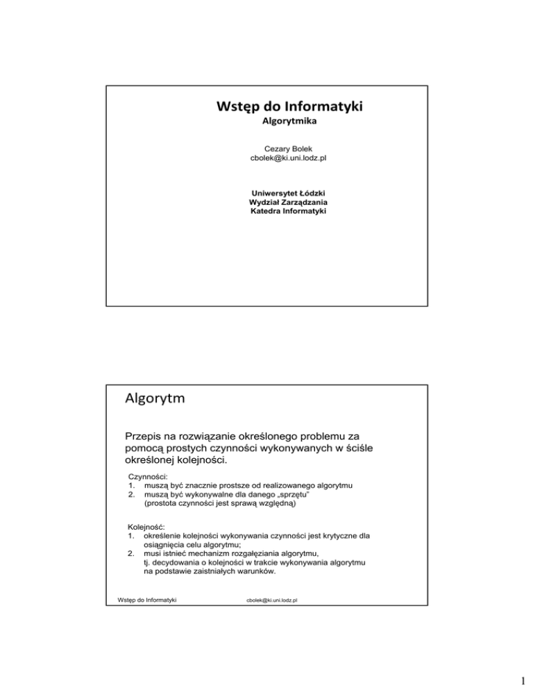 tƐƚħƉĚŽ/ŶĨŽƌŵĂƚLJŬŝ ůŐŽƌLJƚŵŝŬĂ Cezary Bolek [email protected] Uniwersytet Łódzki Wydział Zarządzania Katedra Informatyki ůŐŽƌLJƚŵ Przepis na rozwiązanie określonego problemu za pomocą prostych czynności wykonywanych w ściśle określonej kolejności. Czynności: 1. muszą być znacznie prostsze od realizowanego algorytmu 2. muszą być wykonywalne dla danego „sprzętu” (prostota czynności jest sprawą względną) Kolejność: 1. określenie kolejności wykonywania czynności jest krytyczne dla osiągnięcia celu algorytmu; 2. musi istnieć mechanizm rozgałęziania algorytmu, tj. decydowania o kolejności w trakcie wykonywania algorytmu na podstawie zaistniałych warunków. Wstęp do Informatyki [email protected] 1 /ŶŶLJŵŝƐųŽǁLJ͕ĐnjLJŵũĞƐƚĂůŐŽƌLJƚŵ ͍ • Zbiór logicznie powiązanych kroków prowadzących do określonego celu • Sposób rozwiązania problemu • "Przepis" • Sposób opisu zachowania Algorytm zawiera: • Dane • Instrukcje Wstęp do Informatyki [email protected] ZŽůĂĂůŐŽƌLJƚŵƵ Dane wejściowe Algorytm Dane wyjściowe Wstęp do Informatyki [email protected] 2 ůŐŽƌLJƚŵ ͞WƌnjĞƉŝƐ͟ Ciasteczka czekoladowe DANE (składniki) 2 1/4 szklanki mąki 1 łyŜeczka soli 1 łyŜeczki proszku do pieczenia 2 jajka 3/4 szklanki brązowego cukru 1 łyŜeczki wanilii 3/4 szklanki cukru 1 paczka masła 30 dag startej na tarce czekolady INSTRUKCJE (czynności) Rozgrzać piekarnik do temperatury 375°C. W misie zmieszać mąkę, sól, proszek do pieczenia. Utrzeć razem cukier, masło i wanilię aŜ do uzyskania jednolitej konsystencji. Dodać jajka i utrzeć. Dodać zmieszaną wcześniej mąkę, sól itd., utrzeć. Dodać kawałki czekolady NałoŜyć łyŜeczką niewielkie porcje ciasta na blachę przykrytą papierem do pieczenia. Piec 8 do 10 minut. Wstęp do Informatyki [email protected] ĞĐŚLJĚŽďƌĞŐŽĂůŐŽƌLJƚŵƵ Dobry algorytm musi być: Skończony Kompletny Jednoznaczny Poprawny Prosty Zawierać poziomy abstrakcji Wstęp do Informatyki [email protected] 3 ĞĐŚLJĂůŐŽƌLJƚŵƵ Skończoność: algorytm musi zapewnić osiągnięcie do rozwiązania w skończonej liczbie kroków (a więc teŜ w skończonym czasie). Skończona liczba kroków nie oznacza, ze z góry wiadomo po ilu krokach algorytm się zakończy. Komunikat o błędzie lub braku rozwiązania teŜ jest jednym z moŜliwych poprawnych zakończeń realizacji algorytmu. np. Obliczanie wartości sin(x) moŜna wykonać numerycznie za pomocą sumowania kolejnych wyrazów szeregu: sin x = x − x3 x5 x7 x9 + − + −K 3! 5! 7! 9! Algorytm taki musi posiadać warunek zakończenie tej operacji (np. kryterium dokładności) aby nie wykonywał się, mimo Ŝe poprawnie, w nieskończoność. Wstęp do Informatyki [email protected] ĞĐŚLJĂůŐŽƌLJƚŵƵ Kompletność: algorytm musi uwzględniać wszystkie moŜliwe przypadki, które mogą pojawić się podczas jego realizacji. Uwzględnienie róŜnych przypadków oznacza zapewnienie dalszej realizacji algorytmu, zgodnie z przewidzianymi na taką okoliczność instrukcjami. W praktyce programistycznej oznacza to przewidzenie wystąpienia błędów numerycznych i logicznych oraz opracowanie systemu reakcji (komunikaty o błędach, odpowiednie zakończenie działania). np. Obliczanie rozwiązań równania kwadratowego wymaga uwzględnienia przypadków: b 2 − 4ac > 0, b 2 − 4ac < 0 Brak sprawdzenia trzeciego warunku (=0) i wartości parametru a jest przypadkiem niekompletności algorytmu i moŜe spowodować jego błędne działanie. Wstęp do Informatyki [email protected] 4 ĞĐŚLJĂůŐŽƌLJƚŵƵ Jednoznaczność: dla tych samych danych wejściowych algorytm musi zawsze dawać te same wyniki. Jednoznaczność w praktyce oznacza niezaleŜność działania programu od momentu jego wykonania, wpływu innych programów realizowanych równocześnie przez system operacyjny oraz, co najtrudniejsze, od sprzętu realizującego dany algorytm. np. Algorytmy wykonujące obliczenia arytmetyczne powinny dawać dokładnie takie same wyniki na róŜnych komputerach i systemach operacyjnych - jest to bardzo trudne do spełnienia (róŜne kodowanie liczb, róŜne algorytmy ich przetwarzania) Algorytmy formatujące tekst (procesory tekstu) powinny dawać taki sam wygląd strony (układ tekstu, łamanie wyrazów, etc.) zgodny z informacją zapisaną w pliku, niezaleŜnie od typu komputera i wersji systemu operacyjnego ☺ Wstęp do Informatyki [email protected] ŽũĞƐƚnjųĞŐŽǁƚLJŵĂůŐŽƌLJƚŵŝĞ͍ (Z etykiety szamponu) Sposób uŜycia: • • • • • Zmoczyć włosy NałoŜyć niewielką ilość szamponu na włosy Wetrzeć Spłukać Czynności powtórzyć Wstęp do Informatyki [email protected] 5 dĞƌŵŝŶŽůŽŐŝĂ • Algorytm moŜe być wykonany przez kaŜdego (człowieka lub maszynę), kto zna język, w którym zapisano algorytm. • Wykonawca algorytmu musi umieć wykonywać jego instrukcje, ale nie musi znać jego istoty algorytmu lub jego przeznaczenia, aby osiągnąć poŜądany wynik. • Języki przeznaczone do zapisu algorytmów w postaci instrukcji zrozumiałych przez maszynę cyfrową noszą nazwę „języków programowania”. • Algorytm zapisany w języku programowania nosi nazwę: „programu”. • Języki programowania (wysokiego poziomu) są kompromisem pomiędzy językiem naturalnym (zrozumiałym dla człowieka) a pojęciami bliskimi konstrukcji maszyny cyfrowej (bity, bajty, etc.) Wstęp do Informatyki [email protected] ĂŶĞĂůŐŽƌLJƚŵƵ KaŜdy algorytm wykonuje operacje na obiektach: liczbach i ich bardziej złoŜonych strukturach. liczby, wektory, tablice, rekordy, struktury, unie, stosy kolejki, listy, drzewa, grafy ... Liczby są zwykle modelami obiektów rzeczywistych, w aspekcie tych cech, którymi zajmuje się algorytm. • wartość pojedynczej liczby moŜe być modelem wysokości zarobku w programie finansowym, • wektor trzech
