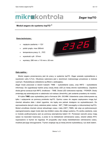 Opis modułu zegara topTO ver.1.0 Zegar topTO Moduł zegara do systemu topTO ® Dane techniczne : • napięcie zasilania: + 12V • pobór prądu: max 260mA • temperatura pracy: 0…70°C • wysokość cyfr : 57mm • wymiary: 280 mm x 110 mm x 30 mm Opis ogólny : Moduł zegara przeznaczony jest do pracy w systemie topTO. Zegar posiada wyświetlacze o wysokości cyfry 5,7cm. Obudowa wykonana jest z aluminium malowanego proszkowo w kolorze czarnym. Wyświetlacze oddzielone są filtrem z pleksiglasu. Zegar moŜe pracować w dwóch trybach: TIME – wyświetlanie czasu, oraz INFO – wyświetlanie informacji. Do sygnalizacji trybów pracy słuŜą diody LED po lewej stronie wyświetlaczy. Zapalona dioda górna oznacza tryb INFO, środkowa – TIME. Dioda LED ulokowana najniŜej – POWER. Diody zmieniają się automatycznie w zaleŜności od rozkazu (time/info), jaki zostanie przesłany do modułu. W trybie TIME czas wyświetlany jest w formacie 24h, GG:MM. Ustawienia czasu dokonywane są tylko i wyłączenie za pomocą protokołu topTO. Oprócz czasu do zegara zapisywane mogą być równieŜ aktualna data i dzień tygodnia, nie będą one jednak dostępne na wyświetlaczach. Do wprowadzania danych słuŜy zaledwie jeden rozkaz: SET_TIME (szczególy w dokumentacji topTO). Moduł umoŜliwia równieŜ odczyt aktualnego czasu i daty (GET_TIME), tak więc po jednorazowym zaprogramowaniu zegar moŜe stać się źródłem czasu dla całego systemu. Po zaniku zasilania, czas w module podtrzymywany jest za pomocą wewnętrznej baterii 3V. PoniewaŜ warunki pracy mają wpływ na rezonator kwarcowy, a przez to na dokładność odmierzania czasu, obwód układu RTC wyposaŜono w trymer do regulacji. W przypadku zbyt duŜej niedokładności odmierzania czasu, moŜliwe jest jego skorygowanie. Trymer znajduje się po lewej stronie wyświetlaczy, tuŜ obok baterii. Strona 1 z 3 Opis modułu zegara topTO ver.1.0 Tryb INFO umoŜliwia wyświetlanie na wyświetlaczach dowolnych znaków. RównieŜ w tym przypadku obsługa jest bardzo prosta, OUTPUT_ON_SEVEN_SEGMENT_DISPLAY słuŜą oraz do tego zaledwie dwa rozkazy: CLEAR_SEVEN_SEGMENT_DISPLAY (szczególy w dokumentacji topTO). Moduł zegara posiada dodatkowo buzer do sygnalizacji, alarmów itp. Generuje on ton niski i jest sterowany na zasadzie monowibratora rozkazem: SET_MONOVIBRATOR_STATE (szczegóły w dokumentacji topTO). Po włączeniu zasilania moduł przeprowadza test zapalając po kolei segmenty wyświetlaczy oraz diody LED. Następnie wraz z dźwiękiem buzera na ostatnich dwóch wyświetlaczach pojawia się aktualny adres modułu. Po zakończeniu procedury startowej zegar przechodzi do wyświetlania czasu. Rozkazy: Rozkazy obsługujące tylko moduł Zegara (szczegółowo omówione w dokumentacji topTO): - GET_TIME 0x30 - SET_TIME 0x31 - CLEAR_SEVEN_SEGMENT_DISPLAY 0x50 - OUTPUT_ON_SEVEN_SEGMENT_DISPLAY 0x51 Pozostałe rozkazy obsługujące moduł Zegara: - GET_MODULE_HARDWARE_INFO 0x10 - GET_MONOVIBRATOR_STATE 0x20 - SET_MONOVIBRATOR_STATE 0x21 - CHANGE_ADDRESS 0xF0 Strona 2 z 3 Opis modułu zegara topTO ver.1.0 Schemat montaŜowy GND A(+) B(-) +12V GND Złącza śrubowe znajdują się w środku obudowy i nie są widoczne z zewnątrz. Opis złączy: 1 – GND - masa magistrali RS485 2 – A(+) - sygnał róŜnicowy magistrali RS485 3 – B(-) - sygnał róŜnicowy magistrali RS485 4 – zasilanie +12V 5 – GND - masa zasilania Strona 3 z 3
