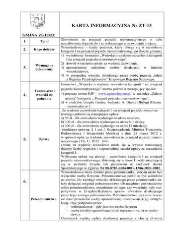 KARTA INFORMACYJNA Nr ZT-13 GMINA ZGIERZ 1. Tytuł 2. Kogo dotyczy 3. Wymagane dokumenty 4. Formularze / wnioski do pobrania 5. Opłaty 6. Pełnomocnictwo Zezwolenie na przejazd pojazdu nienormatywnego w celu umożliwienia dojazdu do i ze wskazanego w zezwoleniu miejsca. Wnioskodawca – każdy podmiot, który ubiega się o zezwolenie kategorii I na przejazd pojazdu nienormatywnego po drodze gminnej 1) wypełniony formularz „Wniosku o wydanie zezwolenia kategorii I na przejazd pojazdu nienormatywnego”, 2) dowód wniesienia opłaty za wydanie zezwolenia, 3) upoważnienie udzielone osobie działającej w imieniu wnioskodawcy, 4) w przypadku wniosku składanego przez osobę prawną „odpis z Rejestru Przedsiębiorców” Krajowego Rejestru Sądowego. Formularz „Wniosku o wydanie zezwolenia kategorii I na przejazd pojazdu nienormatywnego” można pobrać w następujący sposób: 1) poprzez stronę BIP – www.zgierz.bip.net.pl, w zakładce „Załatw sprawę” kategoria „ Przejazd pojazdu nienormatywnego”, 2) w siedzibie Urzędu Gminy, budynku A, Biurze Obsługi Klienta – stanowisko nr 1. Za wydanie zezwolenia kategorii I na przejazd pojazdu nienormatywnego pobiera się następujące opłaty: a) 50 zł - dla zezwolenia wydanego na okres miesiąca, b) 100 zł - dla zezwolenia wydanego na okres 6 miesięcy, c) 200 zł - dla zezwolenia wydanego na okres 12 miesięcy; (podstawa prawna: § 1 ust. 1 Rozporządzenia Ministra Transportu, Budownictwa i Gospodarki Morskiej z dnia 28 marca 2012 r. w sprawie opłat za wydanie zezwolenia na przejazd pojazdu nienormatywnego ( Dz. U. 2012 . 366). Opłatę za wydanie zezwolenia ustala się w kwocie stanowiącej iloczyn liczby wypisów i odpowiedniej stawki opłaty za zezwolenie kategorii I. Wyliczoną opłatę wg decyzji – zezwolenie kategorii I na przejazd pojazdu nienormatywnego, dokonuje się w kasie Urzędu znajdującej się w siedzibie Urzędu lub przelewem na rachunek Banku Spółdzielczego w Zgierzu Nr 88-8783-0004-0019-1506-2000-0002. Wnioskodawca może działać przez pełnomocnika, którym może być wyłącznie osoba fizyczna. Pełnomocnictwo powinno być udzielone na piśmie. Do każdego wniosku składanego przez pełnomocnika należy dołączyć oryginał pełnomocnictwa lub urzędowo poświadczony odpis pełnomocnictwa, niezależnie od tego, czy wcześniej były rozpatrywane w Urzędzie/Referacie sprawy inwestora działającego przez tego samego pełnomocnika. Pełnomocnictwo powinno zawierać dane personalne osoby upoważnionej umożliwiające jej identyfikację i być podpisane przez: - wnioskodawcę – gdy jest nim osoba fizyczna - osobę (osoby) uprawnioną (e) do reprezentowania wnioskodawcy. Obowiązek zapłaty opłaty skarbowej powstaje z chwilą złożenia 7. Jednostka / stanowisko 8. Miejsce składania dokumentów 9. Termin załatwienia sprawy w organie administracji publicznej dokumentu stwierdzającego udzielenie pełnomocnictwa oraz jego odpisu lub kopii – od każdego stosunku pełnomocnictwa. Dowód zapłaty należnej opłaty skarbowej należy dołączyć do wniosku i do dokumentu stwierdzającego udzielenie pełnomocnictwa. Opłata skarbowa od pełnomocnictwa wynosi 17,00 zł (podstawa prawna: Część IV załącznika do ustawy z dnia 16 listopada 2006 r. o opłacie skarbowej, ( tekst jednolity Dz. U. 2015.783 ze zmianami). Potwierdzenie zgodności kopii pełnomocnictwa z oryginałem – 5,00 zł w przypadku pozostawienia w dokumentach sprawy kopii pełnomocnictwa (podstawa prawna: Część II pkt. 4 załącznika do ustawy z dnia 16 listopada 2006 r. o opłacie skarbowej, ( tekst jednolity Dz. U. 2015.783 ze zmianami). Dokumentowanie zapłaty opłaty skarbowej oraz tryb jej zwrotu reguluje Rozporządzenie Ministra Finansów z dnia 28 września 2007 r. w sprawie zapłaty opłaty skarbowej (Dz. U. z 2007 r. Nr 187 poz. 1330). Urząd Gminy Zgierz, 95-100 Zgierz, ul. Łęczycka 4, Referat Infrastruktury Technicznej, pod nr telefonu 42 716 25 15 wew. 224. Sprawa załatwiana jest przez komórkę organizacyjną, która odpowiedzialna jest za realizację zadań, których dotyczy wniosek. Ogólne informacje można uzyskać w Biurze Obsługi Klienta – stanowisko nr 1, pod nr telefonu 42-714-28-31. Wniosek można złożyć w następujący sposób: 1) poprzez placówkę pocztową na adres: Urząd Gminy Zgierz, ul. Łęczycka 4, 95-100 Zgierz, 2) osobiście w siedzibie Urzędu Gminy Zgierz – Biurze Obsługi Klienta – stanowisko nr 1 (nr telefonu, pod którym można uzyskać informację na temat realizacji wniosku: 42-714-28-31 – rozmowa zostanie przekierowana do osoby zajmującej się sprawą), 3) za pośrednictwem urzędowej skrzynki podawczej - „ESP”, znajdującej się pod adresem: www.zgierz.eboi.pl, lub poprzez ePUAP pod adresem: www.epuap.gov.pl, 4) przez pocztę elektroniczną pod adresem: [email protected]. 7 dni roboczych od dnia złożenia kompletnego wniosku. Zezwolenie wydaje się na okres wskazany we wniosku (1 miesiąc, 6 miesięcy lub 12 miesięcy). Po spełnieniu przez Wnioskodawcę warunków określonych w przepisach prawa organ wydaje decyzję o zezwoleniu na przejazd pojazdu nienormatywnego na wskazany we wniosku okres. W przypadku niespełnienia przez Wnioskodawcę wymogów, organ podejmuje decyzję o odmowie wydania zezwolenia. W przypadku niewydania zezwolenia zwraca się wniesiona opłatę. Niespełnienie warunków formalnych powoduje pozostawienie wniosku bez rozpoznania. Czas wydania decyzji zostanie wydłużony w przypadku konieczności uzupełnienia wniosku lub szczególnie skomplikowanych spraw. Podstawa prawna: art. 35 § 2 i 3 ustawy z dnia 14 czerwca 1960 r. Kodeks postępowania administracyjnego (tekst jednolity Dz. U. 2016.23 ze zmianami). 10. Podstawa prawna 11. Tryb odwoławczy 12. Uwagi i dodatkowe informacje Opracował: Sprawdził: Zatwierdził: 1) art. 64 i 64a ustawy z dnia 20 czerwca 1997 r. prawo o ruchu drogowym ( tekst jednolity Dz. U. z 2012 . 1137 ze zmianami), 2) § 