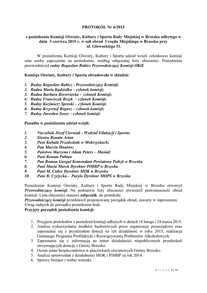 PROTOKÓŁ Nr 6/2015 z posiedzenia Komisji Oświaty, Kultury i Sportu Rady Miejskiej w Brzesku odbytego w dniu 3 czerwca 2015 r. w sali obrad Urzędu Miejskiego w Brzesku przy ul. Głowackiego 51. W posiedzeniu Komisji Oświaty, Kultury i Sportu udział wzięli członkowie komisji oraz osoby zaproszone na posiedzenie, według załączonej listy obecności. Posiedzeniu przewodniczył radny Bogusław Babicz Przewodniczący Komisji OKiS. Komisja Oświaty, Kultury i Sportu obradowała w składzie: 1. 2. 3. 4. 5. 6. 7. Radny Bogusław Babicz - Przewodniczący Komisji; Radna Maria Kądziołka – członek komisji; Radna Barbara Borowiecka - członek Komisji; Radny Franciszek Brzyk – członek Komisji; Radny Kazimierz Sproski – członek Komisji; Radny Krzysztof Bogusz – członek komisji; Radny Jarosław Sorys – członek komisji. Ponadto w posiedzeniu udział wzięli: 1. 2. 3. 4. 5. 6. 7. 8. 9. 10. Naczelnik Józef Cierniak - Wydział Edukacji i Sportu; Siostra Renata Arian Pani Kubala Przedszkole w Mokrzyskach; Pan Marcin Hnatów; Państwo Marzena i Adam Peters – Musiał; Pani Renata Pabian Pan Roman Gurgul Komendant Powiatowy Policji w Brzesku Pani Maria Marek Dyrektor PiMBP w Brzesku Pani M. Cuber Dyrektor MOK w Brzesku Pani B. Czyżycka - Paryło Dyrektor MOPS w Brzesku Posiedzenie Komisji Oświaty, Kultury i Sportu Rady Miejskiej w Brzesku otworzył Przewodniczący komisji. Na podstawie listy obecności stwierdził prawomocność obrad komisji. Lista obecności stanowi załącznik do protokołu. Przewodniczący komisji przedstawił proponowany porządek obrad, zawarty w zaproszeniu. Uwag radnych do porządku posiedzenia brak. Przyjęty porządek posiedzenia komisji: 1. Przyjęcie protokołów z posiedzeń komisji odbytych w dniach 18 lutego i 24 marca 2015. 2. Analiza wykorzystania środków budżetowych przez organizacje pozarządowe oraz zapoznanie się z przydziałem dotacji na ich działalność w roku 2015, realizacja Gminnego Programu Profilaktyki i Rozwiązywania Problemów Alkoholowych. 3. Zapoznanie się z informacją na temat działalności niepublicznych przedszkoli otrzymujących dotację z Gminy Brzesko. 4. Ocena stanu bezpieczeństwa w placówkach oświatowych Gminy Brzesko. 5. Analiza sprawozdań z działalności MOK i PiMBP za rok 2014. 6. Sprawy bieżące i wolne wnioski. S t r o n a 1 | 13 Przewodniczący komisji B. Babicz zaproponował by w sprawach bieżących komisja zapoznała się z realizacją budżetu gminy za rok poprzedni. Skarbnik Celina Łanocha omówiła sprawozdanie z wykonania Budżetu Gminy Brzesko za rok 2014 przychody i rozchody budżetowe. W dyskusji nad przedstawionym sprawozdaniem członkowie komisji z udziałem Pani Skarbnik dyskutowali w temacie dot. planowanej budowy gminnej oczyszczalni ścieków , czy wobec takiego dużego zadłużenia gminy są szanse by gmina wzięła kolejny kredyt na budowę tej oczyszczalni Skarbnik odpowiedziała, że gmina może się zadłużać jednak ze spłatą tego długu musimy poczekać dopiero do 2028 roku ponieważ od roku 2016 już mamy zaplanowane inne spłaty i nie bardzo mamy możliwość spłaty tego zadłużenia przy takich dochodach bieżących i takich wydatkach bieżących , jaki jest faktyczny rzeczywisty koszt odbioru ścieków w Gminie Brzesko przez browar i jak by się te opłaty przekładały gdyby gmina posiadała swoją oczyszczalnię ścieków. Radny Bogusław Babicz poinformował komisję, że w jakiś sposób współzależy od miasta bo gdybyśmy się całkowicie odłączyli na własną oczyszczalnię ścieków to ich zrzut jest niewystarczający i zmuszeni by zostali do modernizacji tej oczyszczalni. Dużo osób optuje za budową nowej oczyszczalni ścieków jednak należy sobie zdać sprawę z tego, że jeżeli przystąpimy do budowy nowej oczyszczalni i jakiekolwiek obniżenie tej ceny ścieków ze względu na jej uruchomienie nie nastąpi wcześniej jak dopiero po około 10 latach, a wręcz jest duże zagrożenie iż w pierwszych latach tuz po oddaniu do użytku cena ścieków jeszcze wzrośnie. Po dyskusji opinia komisji: Komisja pozytywnie jednogłośnie zaopiniowała sprawozdanie z wykonania Budżetu Gminy Brzesko za rok 2014 przedstawione przez Panią Skarbnik Gminy. Ad.1. Przyjęcie protokołów z posiedzeń komisji odbytych w dniach 18 lutego i 24 marca 2015. Protokół z posiedzenia komisji odbytego w dniu 18 lutego 2015 roku został przyjęty jednogłośnie Protokół z posiedzenia komisji odbytego w dniu 24 marca 2015 roku został przyjęty jednogłośnie Ad.2 Analiza wykorzystania środków budżetowych przez organizacje pozarządowe oraz zapoznanie się z przydziałem dotacji na ich działalność w roku 2015, realizacja Gminnego Programu Profilaktyki i Rozwiązywania Problemów Alkoholowych. Inspektor Michał Kostecki przedstawił komisji sprawozdanie z działalności stowarzyszeń i klubów sportowych za 2014 r.( informacja stanowi załącznik do protokołu). Pytania radnych dotyczyły: Radna Barbara Borowiecka zapytała , są ujęte w sprawozdaniu dwa stowarzyszenia Sokół poprosiła o wyjaśnienie tego zapisu. Ponadto radna zapytała czy TOMI Sport otrzymał dotacje na swoja działalność i w jakiej kwocie. S t r o n a 2 | 13 Pan Michał Kostecki odpowiedział- TKKF Sokół działa tylko na Kręgielni jako sekcja podstawowa i kolarstwo górskie, natomiast Towarzystwo Gimnastyczne Sokół przy tym działa sekcja tenisa stołowego. Pan Kostecki odpowiedział równie iż TOMI SPORT otrzymał z gminy dotacje na swoją działalność w kwocie 5 tysięcy złotych. Oferta została złożona na czasie i otrzymał dotację. W krótkiej dyskusji członkowie komisji omówili temat dot. dofinansowania dla poszczególnych klubów sportowych i sposoby rozliczania dotacji przez te kluby. Radny Bogusław Babicz – zauważył, że przedmiotowe działania powtarzają się co roku i dobrze, że te kluby działają ponieważ jest to dobre spędzanie czasu przez dzieci i młodzież w spos