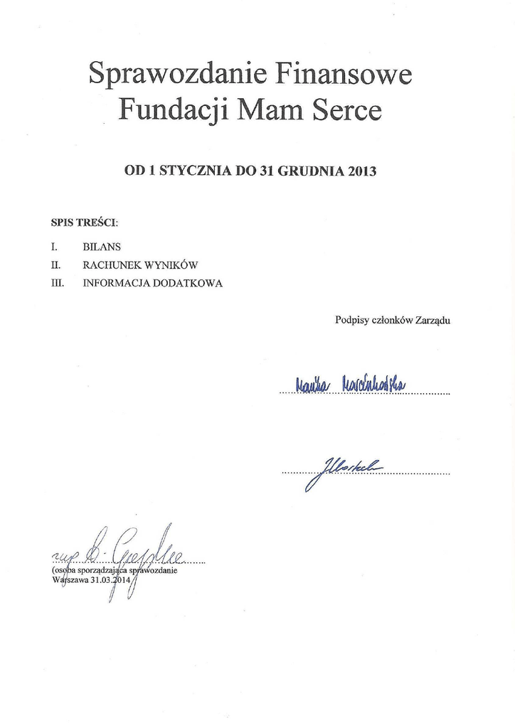 Fundacja Mam Serce ul.Wita Stwosza 12 02-661 Warszawa NIP: 5213581779 SPRAWOZDANIE FINANSOWE ZA ROK 2013 INFORMACJA DODATKOWA 1. Informacje porządkowe. Sprawozdanie finansowe Fundacji Mam Serce z siedzibą w Warszawie 02-661, ul.Wita Stwosza 12 Fundacja dokonała wpisu do Krajowego Rejestru Sądowego w Rejestrze Stowarzyszeń, Innych Organizacji Społecznych i Zawodowych , Fundacji Publicznych Zakładów Opieki Zdrowotnej w dniu 16.08.2010 roku pod numerem KRS .0000362564. Fundacja została wpisana do Rejestru Przedsiębiorców dnia 23.01.2013. Czas trwania Fundacji zgodnie ze statutem jest nieograniczony. Przedmiotem działalności Fundacji jest: Działalność w zakresie ochrony zdrowia i ratowania życia dzieci znajdujących się w szczególnie trudnej sytuacji życiowej lub materialnej. Udzielanie pomocy szpitalom i placówkom medycznym w zakresie ochrony zdrowia i ratowania życia dzieci znajdujących się w szczególnie trudnej sytuacji życiowej lub materialnej. Udzielanie pomocy placówkom wychowawczym, oświatowym i opiekuńczym w zakresie opieki nad dziećmi znajdującym się w szczególnie trudnej sytuacji życiowej lub materialnej. Udzielanie pomocy dzieciom znajdującym się w szczególnie trudnej sytuacji życiowej. 2. Prezentacja sprawozdań finansowych. Fundacja prezentuje sprawozdanie finansowe za rok obrotowy rozpoczynający się 01.01.2013 roku i kończący się 31.12.2013 roku. Sprawozdanie finansowe zostało sporządzone przy założeniu kontynuowania działalności przez Fundację w dającej się przewidzieć przyszłości, obejmującej okres nie krótszy niż jeden rok od dnia bilansowego, w nie zmniejszonym istotnie zakresie. Nie istnieją również okoliczności wskazujące na zagrożenie kontynuowania działalności. 3. Stosowane metody i zasady rachunkowości oraz metody wyceny aktywów i pasywów. Sprawozdanie finansowe zostało sporządzone z uwzględnieniem nadrzędnych zasad rachunkowości określonych ustawą o rachunkowości oraz odrębnych przepisów regulujących zasady gospodarki finansowej fundacji. Fundacja sporządza sprawozdanie w formie uproszczonej określonej przepisami Rozporządzenia Ministra Finansów dla jednostek nie prowadzących działalności gospodarczej. Wynik finansowy Fundacji za dany rok obrotowy obejmuje wszystkie osiągnięte i przypadające na jej rzecz przychody oraz związane z tymi przychodami koszty zgodne z zasadami memoriału, współmierności przychodów i kosztów oraz ostrożnej wyceny. 2 Fundacja Mam Serce ul.Wita Stwosza 12 02-661 Warszawa NIP: 5213581779 SPRAWOZDANIE FINANSOWE ZA ROK 2013 4. Rachunek wyników Fundacja sporządza rachunek zysków i starta w wersji kalkulacyjnej. 5. Bilans 5.1. Rzeczowe aktywa trwałe – wykazuje się zaliczone do aktywów trwałych: środki trwałe, środki trwałe w budowie wycenione wg cen nabycia lub kosztów wytworzenia pomniejszonych o odpisy amortyzacyjne, a także odpisy z tytułu trwałej utraty wartości. 5.2. Zapasy rzeczowych aktywów obrotowych – wykazuje się materiały i towary wycenione wg cen zakupu nie wyższych od ich cen sprzedaży netto na dzień bilansowy. 5.3. Należności krótkoterminowe – wykazuje się należności z tytułu dostaw i usług bez względu na termin ich zapłaty oraz pozostałe należności wymagalne w ciągu 12 miesięcy od dnia bilansowego. Należności wycenione są w kwocie wymaganej zapłaty, z zachowaniem ostrożności. 5.4. Środki pieniężne wykazuje się w wartości nominalnej. Obejmują one środki pieniężne w kasie, na rachunkach bankowych oraz tzw. środki pieniężne w drodze. 5.5. Krótkoterminowe rozliczenia międzyokresowe – wykazuje się czynne rozliczenia międzyokresowe kosztów trwające nie dłużej niż 12 miesięcy od dnia bilansowego. 5.6. Fundusz statutowy – wykazuje się w wysokości określonej w statucie. 5.7. Wynik finansowy netto za rok obrotowy – wykazuje się różnicą pomiędzy przychodami a kosztami za dany rok obrotowy. 5.8. Inne zobowiązania – wykazuje się zobowiązania z tytułu dostaw i usług bez względu na termin płatności oraz pozostałe zobowiązania z tytułu wynagrodzeń, rozrachunków z pracownikami i rozrachunków publicznoprawnych o okresie wymagalności do 12 miesięcy. Zobowiązania te wycenia się w kwocie wymaganej zapłaty. 5.9. Inne rozliczenia międzyokresowe – wykazuje się stan biernych rozliczeń międzyokresowych kosztów w wysokości kosztów dotyczących roku obrotowego, a zafakturowanych w roku następnym. 5.10. Wycena transakcji w walutach obcych Wyrażone w walutach obcych operacje gospodarcze ujmuje się w księgach rachunkowych na dzień ich przeprowadzenia odpowiednio po kursie: kupna lub sprzedaży walut stosowanym przez bank, z którego usług korzysta jednostka – w przypadku operacji sprzedaży lub kupna walut oraz operacji zapłaty należności lub zobowiązań, 3 Fundacja Mam Serce ul.Wita Stwosza 12 02-661 Warszawa NIP: 5213581779 SPRAWOZDANIE FINANSOWE ZA ROK 2013 średnim ustalonym dla danej waluty przez NBP na ten dzień, chyba że w zgłoszeniu celnym lub innym wiążącym jednostkę dokumencie ustalony został inny kurs, w przypadku pozostałych operacji. 5.11. Zmiany zasad rachunkowości w okresie sprawozdawczym W okresie sprawozdawczym Fundacja została wpisana do Rejestru Przedsiębiorców lecz nie prowadziła działalności gospodarczej w 2013 roku . Ponieważ Fundacja nie prowadzi działalności gospodarczej, bilans i rachunek wyników sporządzono w sposób uproszczony, zgodnie z przepisami Rozporządzenia w sprawie sprawozdań dla jednostek nie prowadzących działalności gospodarczej. INFORMACJE I OBJAŚNIENIA O BILANSIE 1. Rzeczowe aktywa trwałe W Fundacji rzeczowe aktywa trwałe nie wystąpiły. 2. Informacja o należnościach Należności o okresie spłaty powyżej 12 miesięcy Stan na 31.12.2012 Stan na 31.12.2013 0,00 0,00 Stan na 31.12.2012 Stan na 31.12.2013 17 768,64 23,87 Razem należności Należności o okresie spłaty poni