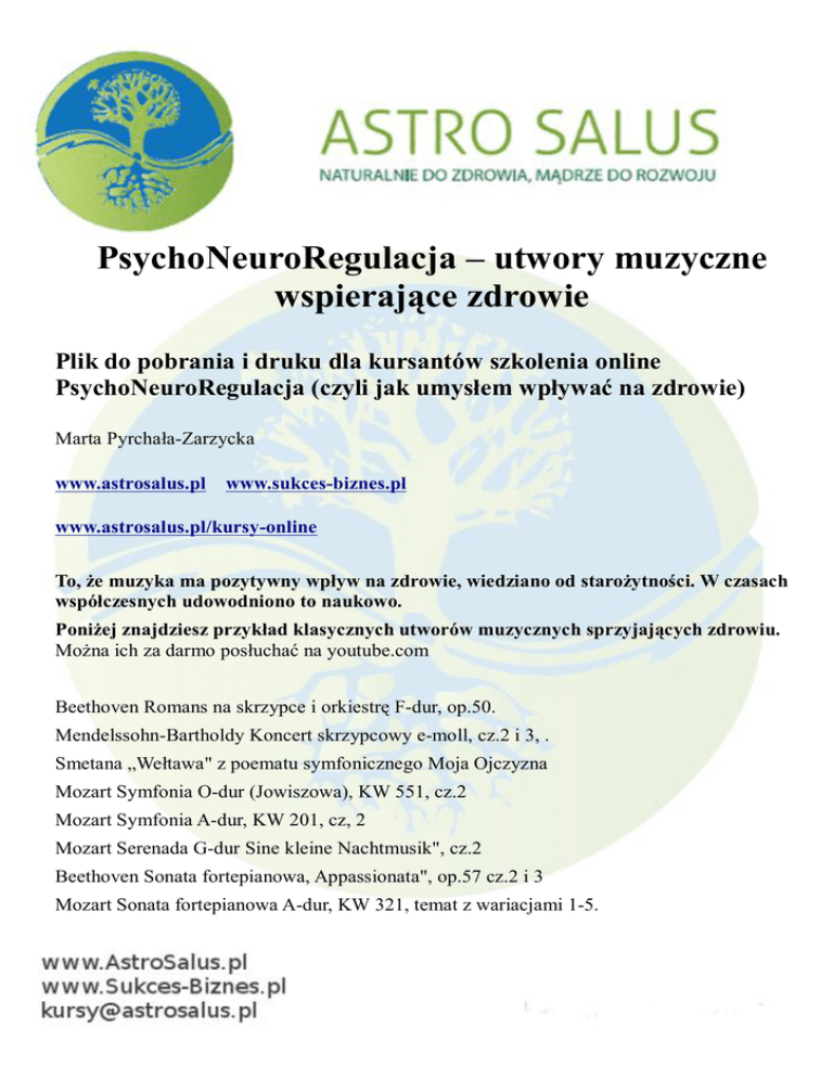 PsychoNeuroRegulacja – utwory muzyczne wspierające zdrowie Plik do pobrania i druku dla kursantów szkolenia online PsychoNeuroRegulacja (czyli jak umysłem wpływać na zdrowie) Marta Pyrchała-Zarzycka www.astrosalus.pl www.sukces-biznes.pl www.astrosalus.pl/kursy-online To, że muzyka ma pozytywny wpływ na zdrowie, wiedziano od starożytności. W czasach współczesnych udowodniono to naukowo. Poniżej znajdziesz przykład klasycznych utworów muzycznych sprzyjających zdrowiu. Można ich za darmo posłuchać na youtube.com Beethoven Romans na skrzypce i orkiestrę F-dur, op.50. Mendelssohn-Bartholdy Koncert skrzypcowy e-moll, cz.2 i 3, . Smetana „Wełtawa" z poematu symfonicznego Moja Ojczyzna Mozart Symfonia O-dur (Jowiszowa), KW 551, cz.2 Mozart Symfonia A-dur, KW 201, cz, 2 Mozart Serenada G-dur Sine kleine Nachtmusik", cz.2 Beethoven Sonata fortepianowa, Appassionata", op.57 cz.2 i 3 Mozart Sonata fortepianowa A-dur, KW 321, temat z wariacjami 1-5. Schubert VIII symfonia (Niedokończona) h-moll, cz. I lub 2. Czajkowski Koncert fortepianowy b-moll, cz.I Schuman IV symfonia d-moll, cz.2 Dworzak IX symfonia e-moll, cz. 2 Beethoven Sonata fortepianowa, Appassionata"op. 57, cz.2 i 3 Ravel. Bolero Beethoven Romans na skrzypce i orkiestrę F-dur Beethoven VI symfonia(Pastoralna) cz. I Mozart Symfonia A-dur KW 201, cz. 2 Mozart Kwintet na klarnet A-dur, cz. I Haydn Symfonia nr 100 G-dur, cz. I Mozart Kwintet na róg c-moll, cz.i i 2. Mozart Symfonia A-dur, KW 201, cz. 2, Mozart-Kwintet klarnetowy A-dur, cz. 1, Haydn-Symfonia G-dur, nr 100, cz. 1, Schubert-Kwintet. „Pstrąg", część wariacyjna, Brahms-koncert fortepianowy B-dur, nr 2, cz. 3. Beethoven V symfonia c-moll, cz.I