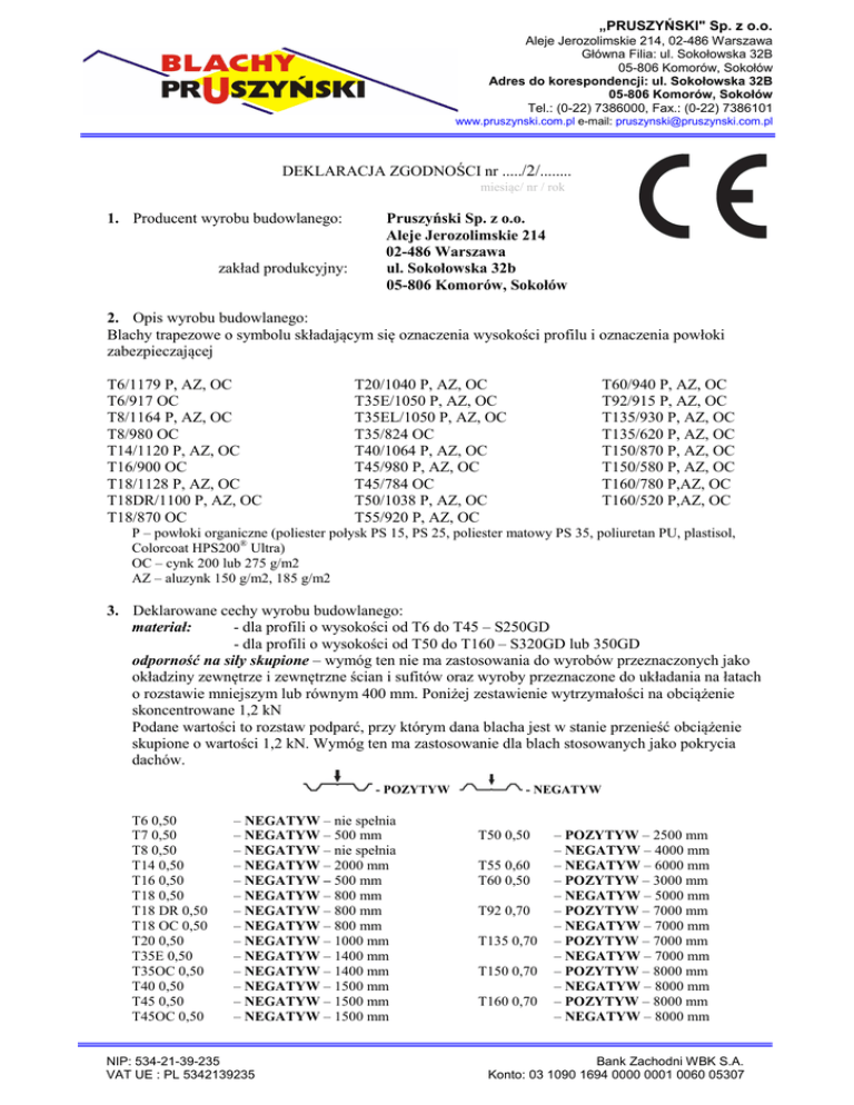 „PRUSZYŃSKI" Sp. z o.o. Aleje Jerozolimskie 214, 02-486 Warszawa Główna Filia: ul. Sokołowska 32B 05-806 Komorów, Sokołów Adres do korespondencji: ul. Sokołowska 32B 05-806 Komorów, Sokołów Tel.: (0-22) 7386000, Fax.: (0-22) 7386101 www.pruszynski.com.pl e-mail: [email protected] DEKLARACJA ZGODNOŚCI nr ...../2/........ miesiąc/ nr / rok 1. Producent wyrobu budowlanego: zakład produkcyjny: Pruszyński Sp. z o.o. Aleje Jerozolimskie 214 02-486 Warszawa ul. Sokołowska 32b 05-806 Komorów, Sokołów 2. Opis wyrobu budowlanego: Blachy trapezowe o symbolu składającym się oznaczenia wysokości profilu i oznaczenia powłoki zabezpieczającej T6/1179 P, AZ, OC T6/917 OC T8/1164 P, AZ, OC T8/980 OC T14/1120 P, AZ, OC T16/900 OC T18/1128 P, AZ, OC T18DR/1100 P, AZ, OC T18/870 OC T20/1040 P, AZ, OC T35E/1050 P, AZ, OC T35EL/1050 P, AZ, OC T35/824 OC T40/1064 P, AZ, OC T45/980 P, AZ, OC T45/784 OC T50/1038 P, AZ, OC T55/920 P, AZ, OC T60/940 P, AZ, OC T92/915 P, AZ, OC T135/930 P, AZ, OC T135/620 P, AZ, OC T150/870 P, AZ, OC T150/580 P, AZ, OC T160/780 P,AZ, OC T160/520 P,AZ, OC P – powłoki organiczne (poliester połysk PS 15, PS 25, poliester matowy PS 35, poliuretan PU, plastisol, Colorcoat HPS200® Ultra) OC – cynk 200 lub 275 g/m2 AZ – aluzynk 150 g/m2, 185 g/m2 3. Deklarowane cechy wyrobu budowlanego: materiał: - dla profili o wysokości od T6 do T45 – S250GD - dla profili o wysokości od T50 do T160 – S320GD lub 350GD odporność na siły skupione – wymóg ten nie ma zastosowania do wyrobów przeznaczonych jako okładziny zewnętrze i zewnętrzne ścian i sufitów oraz wyroby przeznaczone do układania na łatach o rozstawie mniejszym lub równym 400 mm. Poniżej zestawienie wytrzymałości na obciążenie skoncentrowane 1,2 kN Podane wartości to rozstaw podparć, przy którym dana blacha jest w stanie przenieść obciążenie skupione o wartości 1,2 kN. Wymóg ten ma zastosowanie dla blach stosowanych jako pokrycia dachów. - POZYTYW T6 0,50 T7 0,50 T8 0,50 T14 0,50 T16 0,50 T18 0,50 T18 DR 0,50 T18 OC 0,50 T20 0,50 T35E 0,50 T35OC 0,50 T40 0,50 T45 0,50 T45OC 0,50 – NEGATYW – nie spełnia – NEGATYW – 500 mm – NEGATYW – nie spełnia – NEGATYW – 2000 mm – NEGATYW – 500 mm – NEGATYW – 800 mm – NEGATYW – 800 mm – NEGATYW – 800 mm – NEGATYW – 1000 mm – NEGATYW – 1400 mm – NEGATYW – 1400 mm – NEGATYW – 1500 mm – NEGATYW – 1500 mm – NEGATYW – 1500 mm NIP: 534-21-39-235 VAT UE : PL 5342139235 - NEGATYW T50 0,50 T55 0,60 T60 0,50 T92 0,70 T135 0,70 T150 0,70 T160 0,70 – POZYTYW – 2500 mm – NEGATYW – 4000 mm – NEGATYW – 6000 mm – POZYTYW – 3000 mm – NEGATYW – 5000 mm – POZYTYW – 7000 mm – NEGATYW – 7000 mm – POZYTYW – 7000 mm – NEGATYW – 7000 mm – POZYTYW – 8000 mm – NEGATYW – 8000 mm – POZYTYW – 8000 mm – NEGATYW – 8000 mm Bank Zachodni WBK S.A. Konto: 03 1090 1694 0000 0001 0060 05307 „PRUSZYŃSKI" Sp. z o.o. Aleje Jerozolimskie 214, 02-486 Warszawa Główna Filia: ul. Sokołowska 32B 05-806 Komorów, Sokołów Adres do korespondencji: ul. Sokołowska 32B 05-806 Komorów, Sokołów Tel.: (0-22) 7386000, Fax.: (0-22) 7386101 www.pruszynski.com.pl e-mail: [email protected] palność – Produkty powlekane ogniowo (cynk, aluzynk) – są uznane za spełniające wymagania odporności klasy A1 – bez potrzeby testowania. Produkty z powłoką poliestrową mającą nominalną grubość 25 µ m – są uznane za spełniające wymagania odporności klasy A1 – bez potrzeby testowania. przepuszczalność wody – wyroby nieperforowane uważane są za nieprzepuszczalne dla wody przepuszczalność powietrza i oparów – wyroby nieperforowane uważane są za nieprzepuszczalne dla powietrza i oparów zmiana wymiarów – rozszerzalność cieplna powinna być brana pod uwagę ponieważ powoduje to zmianę wymiarów produktu, tam gdzie taka zmiana może mieć wpływ na eksploatację produktu, należy brać pod uwagę odpowiednie współczynnik rozszerzalności cieplnej. Powinny być stosowane następujące rozszerzalności cieplnej: - aluminium: 24 x 10-6 K-1; - stal: 12 x 10-6 K-1; - cynk: 22 x 10-6 K-1; 4. Przeznaczenie i zakres stosowania: Blachy trapezowe ocynkowane i powlekane: T6/1179 P, AZ, OC; T6/917 OC; T8/1164 P, AZ, OC; T8/980 OC; T14/1120 P, AZ, OC; T16/900 OC; T18DR/1100 P , AZ, OC; T18/1128 P, AZ, OC; T18/870 OC; T20/1040 P, AZ, OC; T35E/1050 P, AZ, OC; T35EL/1050 P, AZ, OC; T35/824 OC; T40/1064 P, AZ, OC; T45/980 P, AZ, OC; T45/784 OC; T50/1038 P, AZ, OC; T55/920 P, AZ, OC; T60/940 P, AZ, OC; T92/915 P, AZ, OC; T135/930 P, AZ, OC; T135/620 P, AZ, OC; T150/870 P, AZ, OC; T150/580 P, AZ, OC; T160/780 P,AZ, OC; T160/520 P,AZ, OC - mogą być stosowane do wykonywania pokryć lub przekryć dachowych oraz obudowy ścian. Ze względu na wymagania ochrony przed korozją blachy w zależności od rodzaju powłok mogą być stosowane: a) blachy pełne z powłoką cynkową o masie 200 i 275 g/m2, aluzynkową 150 i 185 g/m2 - powlekane powłokami poliestrowymi o grubości 25 µm i 35 µm, lub powłoką poliuretanową o grubości 50 µm – w środowiskach o kategorii korozyjności C1, C2 i C3 wg PN-EN ISO 12944-2:2001, b) blachy pełne z powłoka cynkową o masie 200 i 275 g/m2, aluzynkową 150 i 185 g/m2 bez powłok organicznych – w pomieszczeniach zamkniętych w środowiskach o kategoriach korozyjności atmosfery C1, C2 wg PN-EN ISO 12944-2:2001 c) blachy pełne z powłoką cynkową o masie 200 i 275 g/m2, aluzynkową 150 i 185 g/m2 i powłokami malarskimi dopuszczonymi do obrotu i stosowania – wg zakresu stosowania powłok malarskich określonego w Polskich Normach lub aprobatach technicznych, d) blachy perforowane, niezależnie od rodzaju powłoki – w pomieszczeniach zamkniętych w środowiskach o kategorii korozyjności atmosfery C1, C2 wg PN-EN ISO 12944-2:2001. Zastosowanie blach powinno być zgodne z projektami technicznymi budynków, opracowanymi z uwz