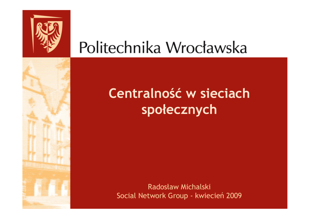 Centralność w sieciach społecznych Radosław Michalski Social Network Group - kwiecień 2009 Agenda spotkania • Pojęcie centralności • Potrzeba pomiaru centralności • Miary centralności – – – – degree centrality betweenness closeness Eigenvector (wektory własne) • Problemy Czym jest centralność • Istotność członka sieci społecznej • Mierzona róŜnymi miarami, w zaleŜności od celu • Określenie centralności w sieciach społecznych pozwala wyłonić kluczowych uŜytkowników • Centralność moŜe dotyczyć węzłów jak i całej sieci Potrzeba pomiaru centralności • Analiza węzłów kluczowych – zatrzymanie uŜytkownika w sieci – potencjalnie duŜy oddźwięk w przypadku zwiększenia nakładów w tym miejscu – porównanie istotności stron • Analiza sieci – w przypadku sieci zdecentralizowanej brak „single point of failure” – w przypadku sieci scentralizowanej – potrzeba wprowadzenia ścieŜek alternatywnych (zaleŜy od rodzaju sieci) Miary centralności • Degree centality – ogólnie – outdegree centrality (DC) – indegree centrality (prestige) • Betweenness centrality • Closeness centrality • Eigenvector Degree centrality - ogólnie • Ilość połączeń danego uŜytkownika z innymi w grafach nieskierowanych • Na powyŜszym rysunku - Diane Outdegree centrality • Dotyczy grafów skierowanych • Węzeł jest bardziej istotny gdy komunikuje się z większą ilością uŜytkowników • Im więcej krawędzi wychodzących, tym „lepiej” • Przykładowa interpretacja: im większa wartość, tym bardziej towarzyska jest dana osoba Indegree centrality (prestige) • Dotyczy grafów skierowanych • Węzeł jest bardziej istotny gdy wskazuje na niego większa ilość innych wierzchołków • Im więcej wierzchołków wchodzących, tym „lepiej” • Przykładowa interpretacja: im większa wartość, tym bardziej popularna jest dana osoba Betweenness • Kluczowość wierzchołka w zakresie komunikacji (przechodniość, pośredniczene) • MoŜliwość wykrycia pojedyńczych miejsc awarii • Wysoka wartość – moŜliwa interpretacja jako punkt krytyczny dla sieci Algorytm wyznaczania centralności „betweennes” węzła w sieci – idea • Istnieją wierzchołki s, t, v ∈ V • Wiemy Ŝe istnieje przynajmniej jedna droga z s do t • Liczymy ilość najkrótszych ścieŜek z wierzchołka z s do t , • Liczymy ilość ścieŜek z s do t przechodzących przez wierzchołek v, • Suma stosunków σ st i σ st (v ) daje stopień centralności σ st σ st (v ) σ st (v ) cB (v ) = ∑ v ≠ t ≠ s σ st Betweenness - przykład • Na poniŜszym przykładzie - Heather Podejście do obliczania •Ułatwienie obliczania polega na zbudowaniu tabelki z długościami i liczbą najkrótszych ścieŜek pomiędzy wszystkimi parami wierzchołków. A G C F cB (v ) D X ZłoŜoność • Obliczenia cB(v) wynoszą O(n²) tylko przy liczeniu wyznaczaniu centralności dla jednego wierzchołka • Dla wszystkich wierzchołków złoŜoność tego algorytmu wynosi O(n³) Closeness centrality • Stopień bliskości • Określa jak daleko / jak blisko wierzchołek ma do pozostałych wierzchołków w sieci • Wysoki stopień centralności wskazuje na uŜytkowników, którzy mogą mieć dobre własności propagacji informacji (wirusów itp. takŜe...) cC (v) Algorytm wyznaczania centralności wierzchołków według bliskości • Policzenie wszystkich wierzchołków • Policzenie sumy wszystkich odległości od wierzchołka v do wszystkich pozostałych wierzchołków • Stosunek ilości wierzchołków ich odległości od wierzchołka v n n −1 ∑ d (v, t ) i i =1, v ≠ t cC (v) = n −1 n −1 ∑ d (v, t ) i =1, v ≠ t i Closeness - przykład • Na poniŜszym przykładzie – Fernando i Garth Eigenvector (wektory własne) • Przykład web centrality – która strona w sieci na zadany temat jest najistotniejsza? • Nie wystarczy ilość wskazań do tej strony, ale waŜne skąd te wskazania pochodzą (wskazujący teŜ muszą być istotni, inaczej łatwo oszukać engine) • Eigenvector do obliczenia pozycji strony uwzględnia pozycje stron pozostałych • Przykłady: PageRank, Social Position Problemy • DuŜa złoŜoność obliczeniowa – aproksymacja? • DuŜa dynamika sieci często kłopotliwa (wymaga ponownych obliczeń w algorytmach liczących całą sieć) • Konieczność doboru właściwej miary i wyciągnięcia właściwych wniosków • Spoofowanie algorytmów – np. PageRank Pytania? Źródła • Musial, K., Juszczyszyn, K., Gabrys, B. and Kazienko, P., 2008. „Patterns of Interactions in Complex Social Networks Based on Coloured Motifs Analysis”, 15th International Conference on Neural Information Processing (ICONIP’2008), 25-28 Nov 2008, Auckland, New Zealand, • Wojciech Piekaj, Grzegorz Skorek, Anna Zygmunt, Jarosław Kozlak „Środowisko do identyfikowania wzorców zachowań w oparciu o podejście sieci społecznych” • „Algorytmy wyznaczania centralności w sieci”, Szymon Szylko • Social Network Analysis - http://www.orgnet.com/sna.html