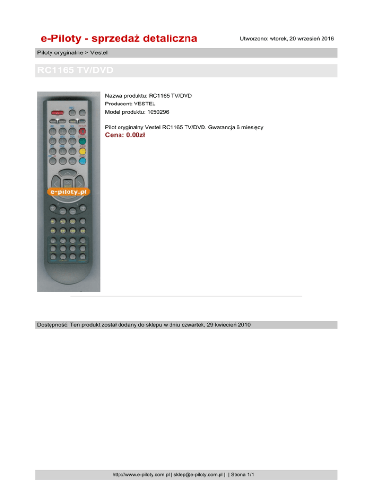 e-Piloty - sprzedaż detaliczna Utworzono: wtorek, 20 wrzesień 2016 Piloty oryginalne > Vestel RC1165 TV/DVD Nazwa produktu: RC1165 TV/DVD Producent: VESTEL Model produktu: 1050296 Pilot oryginalny Vestel RC1165 TV/DVD. Gwarancja 6 miesięcy Cena: 0.00zł Dostępność: Ten produkt został dodany do sklepu w dniu czwartek, 29 kwiecień 2010 http://www.e-piloty.com.pl | [email protected] | | Strona 1/1