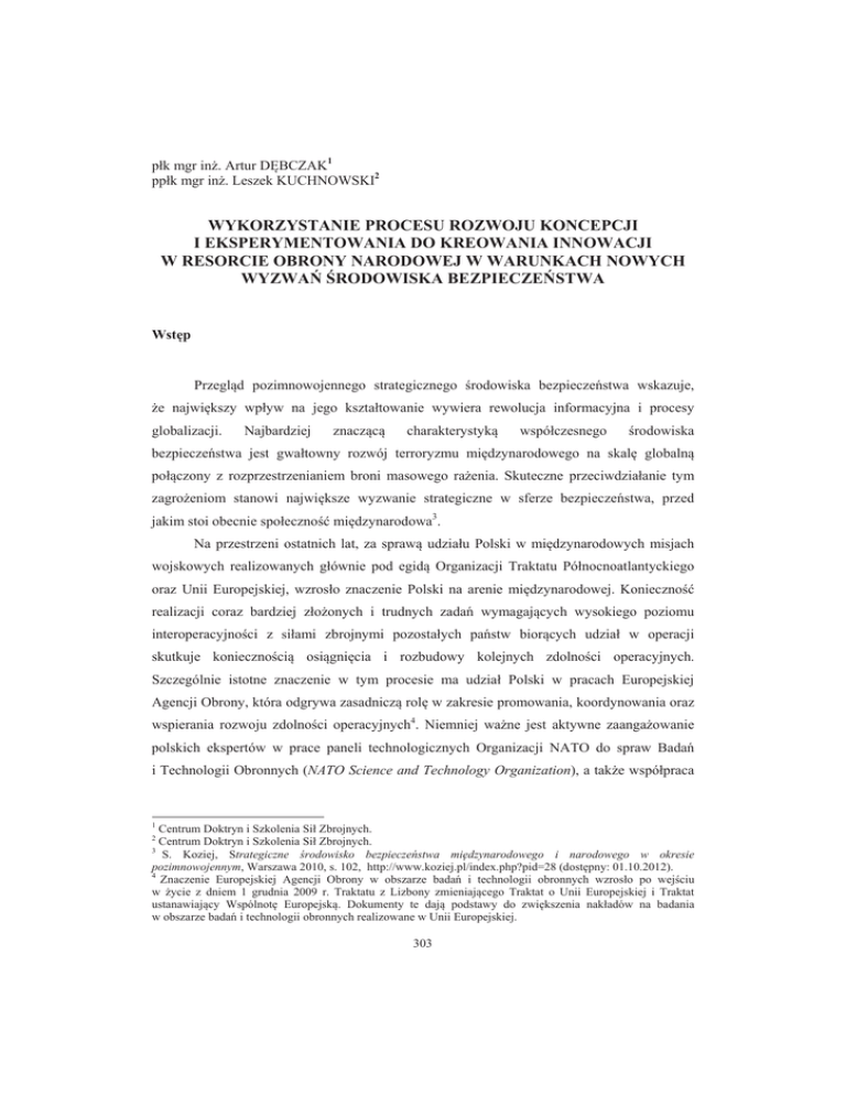 p•k mgr in . Artur D!BCZAK1 pp•k mgr in . Leszek KUCHNOWSKI2 WYKORZYSTANIE PROCESU ROZWOJU KONCEPCJI I EKSPERYMENTOWANIA DO KREOWANIA INNOWACJI W RESORCIE OBRONY NARODOWEJ W WARUNKACH NOWYCH WYZWA• RODOWISKA BEZPIECZE•STWA Wst!p • Przegl"d pozimnowojennego strategicznego #rodowiska bezpiecze$stwa wskazuje, e najwi%kszy wp•yw na jego kszta•towanie wywiera rewolucja informacyjna i procesy globalizacji. Najbardziej znacz"c" charakterystyk" wspó•czesnego #rodowiska bezpiecze$stwa jest gwa•towny rozwój terroryzmu mi%dzynarodowego na skal% globaln" po•"czony z rozprzestrzenianiem broni masowego ra enia. Skuteczne przeciwdzia•anie tym zagro eniom stanowi najwi%ksze wyzwanie strategiczne w sferze bezpiecze$stwa, przed jakim stoi obecnie spo•eczno#& mi%dzynarodowa3. Na przestrzeni ostatnich lat, za spraw" udzia•u Polski w mi%dzynarodowych misjach wojskowych realizowanych g•ównie pod egid" Organizacji Traktatu Pó•nocnoatlantyckiego oraz Unii Europejskiej, wzros•o znaczenie Polski na arenie mi%dzynarodowej. Konieczno#& realizacji coraz bardziej z•o onych i trudnych zada$ wymagaj"cych wysokiego poziomu interoperacyjno#ci z si•ami zbrojnymi pozosta•ych pa$stw bior"cych udzia• w operacji skutkuje konieczno#ci" osi"gni%cia i rozbudowy kolejnych zdolno#ci operacyjnych. Szczególnie istotne znaczenie w tym procesie ma udzia• Polski w pracach Europejskiej Agencji Obrony, która odgrywa zasadnicz" rol% w zakresie promowania, koordynowania oraz wspierania rozwoju zdolno#ci operacyjnych4. Niemniej wa ne jest aktywne zaanga owanie polskich ekspertów w prace paneli technologicznych Organizacji NATO do spraw Bada$ i Technologii Obronnych (NATO Science and Technology Organization), a tak e wspó•praca •••••••••••••••••••••••••••••••••••••••••••••••••••••••••••• 1 Centrum Doktryn i Szkolenia Si• Zbrojnych. Centrum Doktryn i Szkolenia Si• Zbrojnych. 3 S. Koziej, Strategiczne •rodowisko bezpiecze stwa mi!dzynarodowego i narodowego w okresie pozimnowojennym, Warszawa 2010, s. 102, http://www.koziej.pl/index.php?pid=28 (dost%pny: 01.10.2012). 4 Znaczenie Europejskiej Agencji Obrony w obszarze bada$ i technologii obronnych wzros•o po wej#ciu w ycie z dniem 1 grudnia 2009 r. Traktatu z Lizbony zmieniaj"cego Traktat o Unii Europejskiej i Traktat ustanawiaj"cy Wspólnot% Europejsk". Dokumenty te daj" podstawy do zwi%kszenia nak•adów na badania w obszarze bada$ i technologii obronnych realizowane w Unii Europejskiej.• 2 303 303• z Sojuszniczym Dowództwem Transformacji NATO w obszarze rozwoju koncepcji i eksperymentowania5. Rozwój techniki oraz technologii obronnych wp•ywa na charakter obecnych i przysz•ych operacji, kszta•towanie my li wojskowej oraz rozwój sztuki wojennej. Osi!gane dzi"ki temu nowe zdolno ci operacyjne wzmacniaj! potencja• si• zbrojnych, gwarantuj!c im uzyskanie przewagi nad przeciwnikiem. Jednocze nie, w ostatnich latach zarysowa•a si" nowa tendencja kreowania zdolno ci polegaj!ca na wykorzystaniu niematerialnych #róde• przewag militarnych. Polega to na wykorzystywaniu m.in. nowych pomys•ów, nowatorskich idei, niekonwencjonalnych rozwi!za$, czyli praktycznym wykorzystaniu osi!gni"% naukowobadawczych. 1. Wyzwania •rodowiska bezpiecze stwa 1.1. Identyfikacja obecnych zagro!e •rodowiska bezpiecze stwa Analizy i oceny przeprowadzone w obszarze bezpiecze$stwa wskazuj!, &e zagro&enie konfliktem globalnym pozostaje na bardzo niskim poziomie 6 . Przemiany polityczne i gospodarcze, które dokona•y si" w ostatnich latach, przynios•y znaczn! popraw" bezpiecze$stwa Polski. Pozytywny wp•yw na poziom bezpiecze$stwa narodowego ma równie& cz•onkostwo w NATO i UE, aktywny udzia• w ONZ, OBWE oraz innych organizacjach mi"dzynarodowych. Procesy integracji politycznej i ekonomicznej sprawi•y, &e Si•y Zbrojne RP, pomimo &e pozosta•y istotnym narz"dziem polityki mi"dzynarodowej, odgrywaj! na tym polu znacznie mniejsz! rol" ni& w przesz•o ci. Dodatkowo, negatywne czynniki ekonomiczne oraz sytuacja gospodarcza ostatnich lat wzmocni•y sk•onno % wi"kszo ci pa$stw Europy do redukcji posiadanego potencja•u wojskowego. W zwi!zku z powy&szym, wyra#nie zarysowa•a si" tendencja zmniejszania posiadanego potencja•u militarnego. Zaznaczy% jednak nale&y, &e omawiana sytuacja dotyczy kontynentu europejskiego i nie wydaje si", i& mo&na by by•o dokona% uogólnienia umo&liwiaj!cego pozytywne zweryfikowanie tezy, &e jest to trend ogólno wiatowy. Jednak&e na wiecie wci!& trwaj! konflikty i ocenia si", &e dalej b"d! wybucha%. Z przeprowadzonej analizy i oceny wynika, &e b"d! one mia•y charakter zarówno polityczny, ekonomiczny, jak i religijny. Spory te cz"sto s! i b"d! w przysz•o ci rozwi!zywane w sposób •••••••••••••••••••••••••••••••••••••••••••••••••••••••••••• 5 Strategia dzia•a resortu Obrony Narodowej w obszarze bada i technologii obronnych, MON, Warszawa 2011, s. 6. 6 A. Polak, J. Joniak, Wymagania wobec struktur organizacyjnych wojsk l!dowych w "wietle wspó•czesnych wyzwa , AON, Warszawa 2008, s. 51. 304 304• si•owy, za pomoc dzia•a! militarnych, cho" raczej o lokalnym wymiarze. Przeprowadzone studia materia•ów #ród•owych wskazuj , $e konflikty te coraz cz%&ciej próbuje rozstrzygn " si% za pomoc si• ekstremistycznych, które preferuj dzia•ania o charakterze terrorystycznym i generuj nowy rodzaj zagro$e! zwanych asymetrycznymi7. Obok terroryzmu zaliczy" do nich mo$na tak$e dzia•ania partyzanckie, grupy przest%pcze, rozpad pa!stw (upadek ustrojów totalitarnych), zagro$enie u$ycia BMR (proliferacja broni masowego ra$enia), zagro$enia informacyjne i cybernetyczne, a tak$e gospodarcze. Prowadz c analiz% obecnych zagro$e!, mo$na dokona" ich klasyfikacji w opar