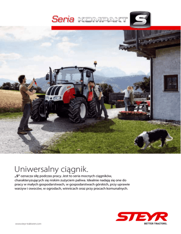 Seria Uniwersalny ciągnik. „S” oznacza siłę podczas pracy. Jest to seria mocnych ciągników, charakteryzujących się niskim zużyciem paliwa. Idealnie nadają się one do pracy w małych gospodarstwach, w gospodarstwach górskich, przy uprawie warzyw i owoców, w ogrodach, winnicach oraz przy pracach komunalnych. www.steyr-traktoren.com BETTER TRACTORS. NASZA NASZA PRACA. PRACA. NASZA NASZA SIŁA. SIŁA. NASZ NASZ STEYR. STEYR. www.steyr-traktoren.com www.steyr-traktoren.com OŚWIETLENIE OŚWIETLENIEGÓRNE GÓRNE Reflektory Reflektoryszerokostrumieniowe szerokostrumieniowe mocowane mocowanenanadachu dachuoraz oraz maksymalnie maksymalniesześć sześćlamp lamproboczych roboczych sprawia, sprawia,żeżenoc noczamienia zamieniasię sięwwdzień. dzień. Oświetlenie Oświetleniepozwala pozwalautrzymać utrzymać 360-stopniową 360-stopniowąwidoczność widocznośćz zkabiny, kabiny, a aprzeszklony przeszklonydach dachumożliwia umożliwia podgląd podglądładowacza ładowaczaprzedniego, przedniego, nawet nawetwwpodniesionym podniesionympołożeniu. położeniu. NIEWIELKA NIEWIELKAWAGA, WAGA,DUŻE DUŻEMOŻLIWOŚCI MOŻLIWOŚCI Dzięki Dziękiniewielkiej niewielkiejwadze wadzewynoszącej wynoszącej2800 2800kgkgoraz orazznakomitym znakomitym właściwościom właściwościommanewrowym manewrowymciągniki ciągnikiKompakt KompaktS Ssprawdzają sprawdzająsięsię wwgórzystym górzystymterenie. terenie.SąSąjednak jednakidealnym idealnymnarzędziem narzędziemnie nietylko tylkododo pracy pracywwgórach, górach,ale aletakże takżewwobrębie obrębiegospodarstwa, gospodarstwa,wwwinnicach winnicach oraz orazprzy przyutrzymaniu utrzymaniuterenów terenówzielonych. zielonych. Klasa Kompakt. 1 Inwestycja, która się opłaca: Opłacalny przy zakupie, w trakcie eksploatacji i serwisowania Najwyższy poziom komfortu, płaska podłoga kabiny, okno dachowe, uchylna szyba przednia i szyby boczne Wygodny fotel pasażera z pasem bezpieczeństwa Łatwość obsługi: zintegrowany joystick przedniego ładowacza Ciągniki Steyr Kompakt S zostały opracowane we współpracy z klientami, podobnie jak legendarne klasyczne ciągniki typu 80, 84, 86 oraz serii Steyr Plus, które można było znaleźć niemal w każdym gospodarstwie. Ciągniki Kompakt S charakteryzują się znakomitymi właściwościami manewrowymi, łatwą obsługą oraz najlepszą widocznością i idealnie nadają się do każdego zadania: oszczędne, lekkie i zwrotne, jak małe ciągniki, a jednocześnie przestronna kabina, niezawodność i moc, jak w przypadku dużych ciągników. Idealny ciągnik uniwersalny. Sprawdza się podczas prac w gospodarstwach hodowlanych i na terenach zielonych. Nadaje się do prac w terenach górzystych, w winnicach, sadach, na polach warzywnych o szerokim rozstawie rzędów oraz w ogrodach. Odpowiedni do różnorodnych zastosowań w przemyśle i przy pracach komunalnych. Bez względu na miejsce pracy ciągnika Kompakt S – wyznacza on nowe standardy wszechstronności. Niska konstrukcja (wysokość 2420 mm) umożliwia pracę wewnątrz zabudowań Wydajne silniki 3,2 l z turbosprężarką, o mocy 56 lub 65 KM Zsynchronizowana skrzynia biegów z przełożeniami 12 x 12 lub 20 x 20 z przekładnią biegów pełzających Szybkie i łatwe manewrowanie z hydrauliczną przekładnią Powershuttle Lekkie i zwrotne (masa 2800 kg, promień skrętu 3,75 m) Maksymalnie 3 tylne i 2 opcjonalne międzyosiowe zawory hydrauliki zewnętrznej Napęd na 4 koła do pracy na szczególnie wymagającym terenie 2 www.steyr-traktoren.com 3 4 5 Komfort w połączeniu z wydajnością. 1 Ergonomiczne rozmieszczenie przyrządów sterujących oraz wygodny fotel pasażera 4 Łatwa obsługa – przyrządy w zasięgu ręki, logicznie rozmieszczone 2 Doskonała widoczność wokół ciągnika ułatwia całodzienną pracę 5 Hydrauliczna przekładnia Powershuttle ułatwia manewrowanie 3 Okno dachowe – idealne do pracy z ładowaczem czołowym Koncepcja serwisu Steyr: Oprócz niezawodności ciągników Kompakt S użytkownik ma też zapewniony niezawodny zespół wykwalifikowanych mechaników serwisowych Steyr, którzy są dostępni do udzielenia wsparcia w każdym momencie. Taka sama koncepcja niezawodności dotyczy również oryginalnych części zamiennych Steyr, które są szybko dostarczane do dealerów. Dealerzy Steyr oferują również możliwości finansowania zakupu nowego ciągnika. Seria Uniwersalny ciągnik. Jedyny w swoim rodzaju. Kompakt S to wielozadaniowy ciągnik w atrakcyjnej cenie. Posiada rozwiązania techniczne, które sprawiają, że jest wyjątkowy w swojej klasie. Wyposażony jest w przestronną kabinę z komfortowym fotelem operatora oraz fotelem pasażera. Kabina umożliwia wsiadanie i wysiadanie z ciągnika po obu stronach oraz zapewnia nieograniczoną widoczność. Dostępne tu okno dachowe często nie stanowi wyposażenia standardowego w innych ciągnikach. Teraz będziesz naprawdę czekał z niecierpliwością na powrót do pracy w najlepiej wyciszonej kabinie z systemem HiFi i złączem iPod. Dane techniczne potwierdzają, że Kompakt S to wydajny, uniwersalny ciągnik o najlepszym stosunku korzyści do ceny. NAJWIĘKSZA WYDAJNOŚĆ Silnik diesel o pojemności 3,2 litra zapewnia znakomitą reakcję. Do tego w specyfikacji ciągnika można wybrać skrzynię biegów 12 x 12 lub 12 x 12 z hydrauliczną przekładnią nawrotną Powershuttle. Obydwie wersje dostępne są z przekładnią biegów pełzających. Najniższa prędkość, jaką umożliwiają opcjonalne biegi pełzające to 123 metry/h. MOCNE I PRZYJAZNE DLA UŻYTKOWNIKA Maksymalny udźwig 2150 kg oraz trzy tylne i dwa międzyosiowe zawory hydrauliki zewnętrznej umożliwiają korzystanie z szerokiego zakresu narzędzi. DOBRZE WYPOSAŻONY WOM zapewnia moment obrotowy wystarczający dla kosiarek, pras i pługów talerzowych, podczas gdy opcja prędkości 540E pozwala zaoszczędzić paliwo przy lżejszych pracach z przetrząsaczem siana lub zgrabiarką. DA