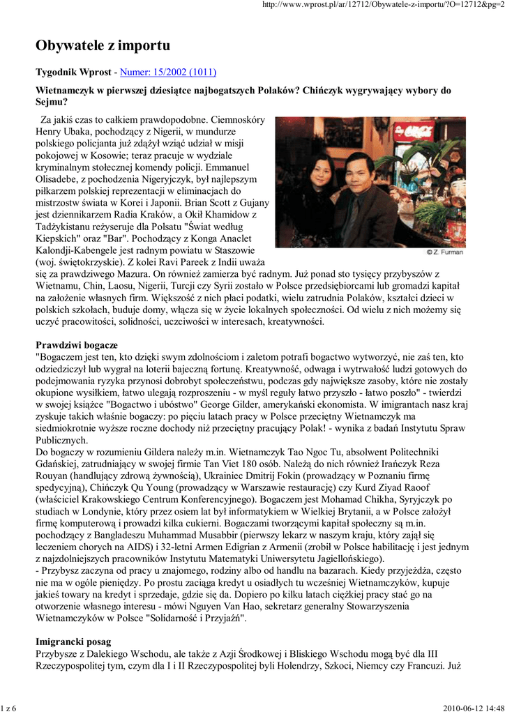 1z6 http://www.wprost.pl/ar/12712/Obywatele-z-importu/?O=12712&pg=2 Obywatele z importu Tygodnik Wprost - Numer: 15/2002 (1011) Wietnamczyk w pierwszej dziesiątce najbogatszych Polaków? Chińczyk wygrywający wybory do Sejmu? Za jakiś czas to całkiem prawdopodobne. Ciemnoskóry Henry Ubaka, pochodzący z Nigerii, w mundurze polskiego policjanta juŜ zdąŜył wziąć udział w misji pokojowej w Kosowie; teraz pracuje w wydziale kryminalnym stołecznej komendy policji. Emmanuel Olisadebe, z pochodzenia Nigeryjczyk, był najlepszym piłkarzem polskiej reprezentacji w eliminacjach do mistrzostw świata w Korei i Japonii. Brian Scott z Gujany jest dziennikarzem Radia Kraków, a Okił Khamidow z TadŜykistanu reŜyseruje dla Polsatu "Świat według Kiepskich" oraz "Bar". Pochodzący z Konga Anaclet Kalondji-Kabengele jest radnym powiatu w Staszowie (woj. świętokrzyskie). Z kolei Ravi Pareek z Indii uwaŜa się za prawdziwego Mazura. On równieŜ zamierza być radnym. JuŜ ponad sto tysięcy przybyszów z Wietnamu, Chin, Laosu, Nigerii, Turcji czy Syrii zostało w Polsce przedsiębiorcami lub gromadzi kapitał na załoŜenie własnych firm. Większość z nich płaci podatki, wielu zatrudnia Polaków, kształci dzieci w polskich szkołach, buduje domy, włącza się w Ŝycie lokalnych społeczności. Od wielu z nich moŜemy się uczyć pracowitości, solidności, uczciwości w interesach, kreatywności. Prawdziwi bogacze "Bogaczem jest ten, kto dzięki swym zdolnościom i zaletom potrafi bogactwo wytworzyć, nie zaś ten, kto odziedziczył lub wygrał na loterii bajeczną fortunę. Kreatywność, odwaga i wytrwałość ludzi gotowych do podejmowania ryzyka przynosi dobrobyt społeczeństwu, podczas gdy największe zasoby, które nie zostały okupione wysiłkiem, łatwo ulegają rozproszeniu - w myśl reguły łatwo przyszło - łatwo poszło" - twierdzi w swojej ksiąŜce "Bogactwo i ubóstwo" George Gilder, amerykański ekonomista. W imigrantach nasz kraj zyskuje takich właśnie bogaczy: po pięciu latach pracy w Polsce przeciętny Wietnamczyk ma siedmiokrotnie wyŜsze roczne dochody niŜ przeciętny pracujący Polak! - wynika z badań Instytutu Spraw Publicznych. Do bogaczy w rozumieniu Gildera naleŜy m.in. Wietnamczyk Tao Ngoc Tu, absolwent Politechniki Gdańskiej, zatrudniający w swojej firmie Tan Viet 180 osób. NaleŜą do nich równieŜ Irańczyk Reza Rouyan (handlujący zdrową Ŝywnością), Ukrainiec Dmitrij Fokin (prowadzący w Poznaniu firmę spedycyjną), Chińczyk Qu Young (prowadzący w Warszawie restaurację) czy Kurd Ziyad Raoof (właściciel Krakowskiego Centrum Konferencyjnego). Bogaczem jest Mohamad Chikha, Syryjczyk po studiach w Londynie, który przez osiem lat był informatykiem w Wielkiej Brytanii, a w Polsce załoŜył firmę komputerową i prowadzi kilka cukierni. Bogaczami tworzącymi kapitał społeczny są m.in. pochodzący z Bangladeszu Muhammad Musabbir (pierwszy lekarz w naszym kraju, który zajął się leczeniem chorych na AIDS) i 32-letni Armen Edigrian z Armenii (zrobił w Polsce habilitację i jest jednym z najzdolniejszych pracowników Instytutu Matematyki Uniwersytetu Jagiellońskiego). - Przybysz zaczyna od pracy u znajomego, rodziny albo od handlu na bazarach. Kiedy przyjeŜdŜa, często nie ma w ogóle pieniędzy. Po prostu zaciąga kredyt u osiadłych tu wcześniej Wietnamczyków, kupuje jakieś towary na kredyt i sprzedaje, gdzie się da. Dopiero po kilku latach cięŜkiej pracy stać go na otworzenie własnego interesu - mówi Nguyen Van Hao, sekretarz generalny Stowarzyszenia Wietnamczyków w Polsce "Solidarność i Przyjaźń". Imigrancki posag Przybysze z Dalekiego Wschodu, ale takŜe z Azji Środkowej i Bliskiego Wschodu mogą być dla III Rzeczypospolitej tym, czym dla I i II Rzeczypospolitej byli Holendrzy, Szkoci, Niemcy czy Francuzi. JuŜ 2010-06-12 14:48 2z6 http://www.wprost.pl/ar/12712/Obywatele-z-importu/?O=12712&pg=2 teraz wielu imigrantów bije na głowę naszych rodaków pod względem pracowitości i uczciwości. "My zaczynamy być senni. Oni chcą wygrać. MoŜemy pracować dziesięć godzin dziennie, oni będą pracować dwanaście. My dwanaście, oni czternaście. Bieda i ambicja to mieszanka piorunująca" - mówi o imigrantach Marvin Harold Davis, miliarder z Beverly Hills. - Wietnamczycy mają ugruntowaną opinię ludzi uczciwych. Szanują swoich klientów, łatwo się z nimi negocjuje - twierdzi Teresa Halik z Instytutu Orientalistyki Uniwersytetu Warszawskiego, od kilku lat badająca wietnamską społeczność w Polsce. Teresa Halik podkreśla teŜ szacunek Wietnamczyków do prawa kraju, w którym się osiedlają. Prawo jest właściwie jedynym uniwersalnym językiem łączącym ich z innymi obywatelami i instytucjami. Z policyjnych statystyk wynika, Ŝe Wietnamczycy są grupą najrzadziej wchodzącą w konflikt z prawem; proporcjonalnie - sześćdziesięciokrotnie rzadziej niŜ Polacy! (Oczywiście działają w Polsce takŜe wietnamscy przestępcy, próbujący zmusić swych ziomków do płacenia haraczu, współdziałający z międzynarodowymi gangami.) Europa imigrantów W Niemczech mieszka około 7 mln obcokrajowców (9 proc. społeczeństwa), z tego połowa to muzułmanie - głównie Kurdowie, Turcy i obywatele krajów bałkańskich. Mniejszość muzułmańska asymiluje się w Niemczech z duŜymi oporami. Zatrudniani są przede wszystkim w ogrodnictwie, przy pracach budowlanych, w handlu i gastronomii. W Wielkiej Brytanii najwięcej imigrantów - 2,5-3 mln - pochodzi z dawnych brytyjskich kolonii Indii, Pakistanu, Bangladeszu, Zambii, Jamajki i Tanzanii. Większość z nich przybyła w latach 70. i 80. Dobrze wykształceni i wykwalifikowani obcokrajowcy z tych krajów bez problemu znajdują pracę. Największe skupiska imigrantów znajdują się w Londynie, Glasgow, Manchesterze i Birmingham. Do Francji najwięcej imigrantów przybyło z Maghrebu i Afryki Zachodniej. Obecnie Ŝyje w tym kraju około 5 mln Arabów -