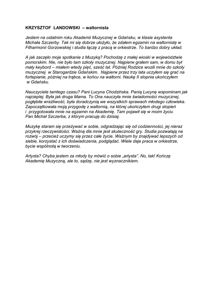 KRZYSZTOF LANDOWSKI – waltornista Jestem na ostatnim roku Akademii Muzycznej w Gdańsku, w klasie asystenta Michała Szczerby. Tak mi się dobrze ułożyło, że zdałem egzamin na waltornistę w Filharmonii Gorzowskiej i studia łączę z pracą w orkiestrze. To bardzo dobry układ. A jak zaczęło moje spotkanie z Muzyką? Pochodzę z małej wioski w województwie pomorskim. Nie, nie było tam szkoły muzycznej. Najpierw grałem sam, w domu był mały keybord – miałem wtedy pięć, sześć lat. Później Rodzice wozili mnie do szkoły muzycznej w Starogardzie Gdańskim. Najpierw przez trzy lata uczyłem się grać na fortepianie, później na trąbce, w końcu na waltorni. Naukę II stopnia ukończyłem w Gdańsku. Nauczyciele tamtego czasu? Pani Lucyna Chodzińska. Panią Lucynę wspominam jak najcieplej. Była jak druga Mama. To Ona nauczyła mnie świadomości muzycznej, pogłębiła wrażliwość, była doradczynią we wszystkich sprawach młodego człowieka. Zapoczątkowała moją przygodę z waltornią, na której ukończyłem drugi stopień i przygotowała mnie na egzamin na Akademię. Tam pojawił się w moim życiu Pan Michał Szczerba, z którym pracuję do dzisiaj. Muzykę staram się przeżywać w sobie, odgradzając się od codzienności, jej nieraz przykrej rzeczywistości. Ważną dla mnie jest skuteczność gry. Studia pozwalają na rozwój – przecież uczymy się przez całe życie. Ważnym by znajdywać lepszych od siebie, korzystać z ich doświadczenia, podglądać. Wiele daje praca w orkiestrze, bycie wspólnotą w tworzeniu. Artysta? Chyba jestem za młody by mówić o sobie „artysta”. No, tak! Kończę Akademię Muzyczną, ale to, sądzę, nie jest wyznacznikiem.