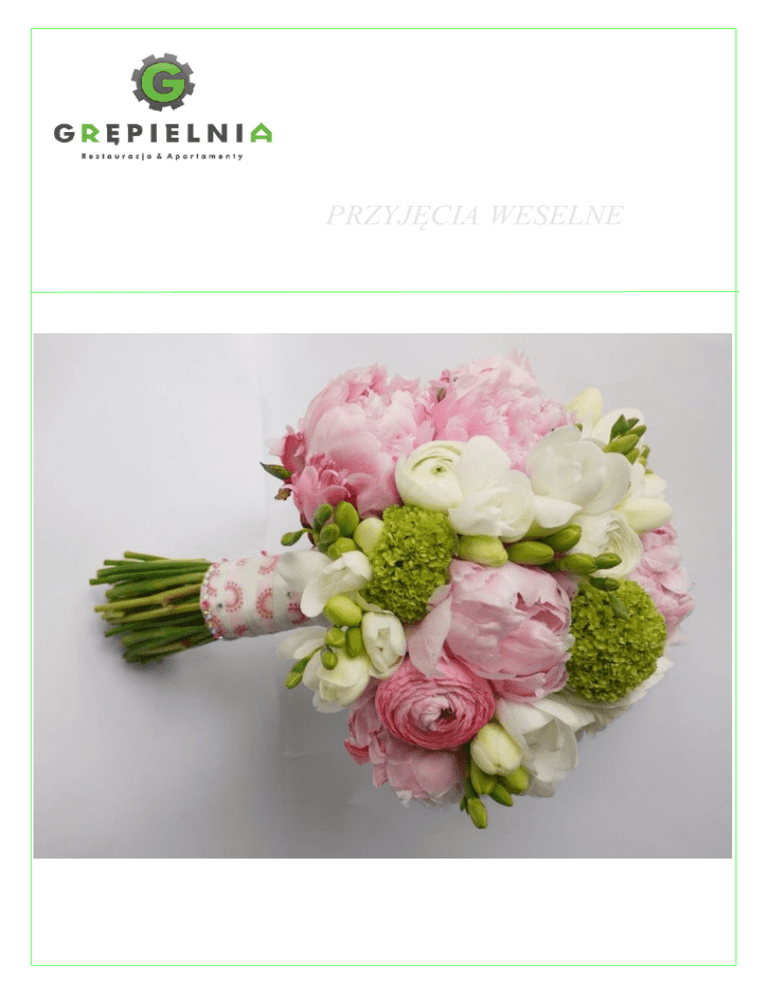 PRZYJĘCIA WESELNE DZIEŃ ŚLUBU Zapraszamy Państwa do Grępielnia Restauracja & Apartamenty. Grępielnia położona jest w centrum Bielska Białej, w miejscu dawnego kompleksu fabryczno – willowego. Miejsce to łączy historię z nowoczesnością. To miejsce idealne dla osób, które w tym wyjątkowym dniu oczekują czegoś więcej niż tylko smacznego jedzenia. Ten szczególny dzień, powinien pozostać w pamięci na całe życie. Na wiele sposobów pomagamy sprawić, aby tak właśnie się stało. Współpracujemy z grupą najlepszych specjalistów w Bielsku Białej i nie tylko, którzy pomagają spełnić, każde życzenie. W śród naszych partnerów znajdują się m.in. jubiler, cukiernie, floryści, fotograf oraz wielu innych znawców branży ślubnej. Wiemy jak ważna na każdym weselu jest oprawa muzyczna. Dlatego współpracujemy z najlepszymi zespołami oraz DJ-ami. Dysponujemy bazą noclegową o oryginalnym i nowoczesnym wystroju, kameralną restauracja, eleganckim lounge barem oraz przestronną i elegancką salą balową. Nasza kadra to przede wszystkim ludzie młodzi, z pasją i zamiłowaniem do organizowania przyjęć okolicznościowych. Każdą parę traktujemy indywidualnie, a co za tym idzie: dostosujemy menu do budżetu i preferencji gości, zorganizujemy nawet najbardziej wymyślne atrakcje. Możemy wzbogacić przyjęcie dodatkowymi atrakcjami: pokaz barmański, pokaz tańca, loty widokowe, sesje zdjęciowe w zabytkowym Fordzie A. SALA BALOWA Do dyspozycji naszych Gości oddajemy salę weselną, w elegancki i niepowtarzalnym klimacie. Możemy ugościć w niej około 120 osób. Z uwagi na wielkość sali, istnieje możliwość podziału Sali, mobilną ścianą. Sala posiada wydzielony parkiet do tańczenia. Wyposażona jest w oddzielną bazę gastronomiczną, co gwarantuje wysoką jakość serwowanych potraw. Sala w pełni klimatyzowana, z niezbędnym zapleczem technicznym. Gwarantujemy najwyższą jakość świadczonych usług. Oferujemy: Dekorację stołów weselnych Apartament dla Nowożeńców Możliwość wynajęcia zabytkowego samochodu marki Ford A Fachową pomoc na każdym etapie realizacji przyjęcia weselnego Propozycja I Staropolskim obyczajem - przywitanie Pary Młodej chlebem i solą Toast winem musującym Zupa: Domowy rosół z makaronem, dodatkami i świeżą natką zielonej pietruszki (podawany w wazach) Danie główne (wieloporcjowo): Rolada wieprzowa z farszem z ogórka kiszonego, boczku i cebuli 100% Pieczeń szpikowana boczkiem i czosnkiem 50% Panierowane koperty drobiowe z pieczarkami, porem i serem górskim 50% Dodatki: Ziemniaki z wody z koperkiem Kluski śląskie (jasne 100%) Sos pieczeniowy Czerwona kapusta (serwowana na zimno) Surówka z białej kapusty z koperkiem i zielonym ogórkiem Surówka z marchwi z jabłkiem Deser: Lody ze świeżymi owocami i bitą śmietaną Kawa, herbata – wg życzenia Zimna płyta: Półmisek wykwintnych mięs pieczonych na zimno (schab w kolorowym pieprzu i ziołach, rolada drobiowa z brokułami, galantyna drobiowa) Półmisek serów twardych i pleśniowych dekorowana orzechami i winogronami z konfiturą żurawinową) Śledź po polsku w śmietanie z jabłkiem i cebulą 50% Śledź w oleju z ogórkiem, czerwoną cebulą i papryką 50% Tymbaliki drobiowe Sałatka wiejska z grillowanym kurczakiem na bazie sałaty lodowej z sosem musztardowo – miodowym Sałatka brokułowa z pomidorem, świeżym ogórkiem i sosem jogurtowym Pieczywo mieszane, masło I kolacja: Udziec wieprzowy podany z ziemniakami w łupinach i kapustą zasmażaną z boczkiem i grzybami leśnymi i dipem chrzanowym (w uroczysty sposób serwowane na środku Sali) II kolacja: Tradycyjny barszcz czerwony z krokietem z farszem mięsnym Koszt: od 149,00 zł brutto/ os Propozycja II Staropolskim obyczajem - przywitanie Pary Młodej chlebem i solą Toast winem musującym Zupa: Minestrone – włoska zupa wielowarzywna z oliwą z suszonych pomidorów (podawany w wazach) Danie główne (wieloporcjowo): Rolada śląska 50% Gordon Bleu – panierowany schab z serem i szynką 50% Rolada z indyka z suszonym pomidorem i serem mozarella owinięta szynką włoską 50% Dramstiki nadziewane pieczarkami 50% Ziemniaki z wody z koperkiem Kluski śląskie (jasne 100%) Ziemniaki opiekane Sos pieczeniowy Sos grzybowy Czerwona kapusta (serwowana na zimno) Surówka Colesław Buraczki glazurowane w miodzie z musztardą francuską Deser: Lody waniliowe na sosie z gorących wiśni z bitą śmietaną Zimna płyta: Półmisek wykwintnych mięs pieczonych na zimno (schab w kolorowym pieprzu i ziołach, rolada drobiowa z brokułami, galantyna drobiowa, karczek szpikowany grzybami) 50% Wyroby swojskie – szynka wiejska, baleron, boczek rolowany, salceson jasny i ciemny, kabanosy, kiełbasa swojska 5 0% Półmisek serów szlachetnych i pleśniowych dekorowana orzechami i winogronami z konfiturą żurawinową) Śledź po polsku w śmietanie z jabłkiem i cebulą Roladki z łososia z wytrawnym musem cytrynowym z dodatkiem kawioru Tymbaliki drobiowe 50% Galaretka wieprzowa z marchewką, jajkiem i groszkiem 50% Sałatka caprese ze świeżą bazylią – pomidory przekładane serem mozarella Sałatka a’lla grecka z sałatą lodową, pomidorem, papryką, czerwoną cebulą i serem feta Sałkatka brokułowa z pomidorem, świeżym ogórkiem i sosem jogurtowym Pieczywo mieszane, masło I kolacja: Fileciki z indyka w sosie paprykowym z ziemniakami opiekanymi i wiosenną sałatka z vinegrette II kolacja: Bogracz z kluseczkami i pieczywem III kolacja: Staropolski żur z białą kiełbasą i ziemniakami Koszt: od 169,00 zł brutto/ os Propozycja III Staropolskim obyczajem - przywitanie Pary Młodej chlebem i solą Toast winem musującym Przystawka: Półgęsek – wędzone plastry piersi z gęsi podane na sałatce z rukoli z filetowanymi grejfrutami w sosie balsamiczno - miodowym z grzanką Danie główne (wieloporcjowo): Cielęcina z szynką parmeńską i szałwią 50% Pieczona polędwiczk
