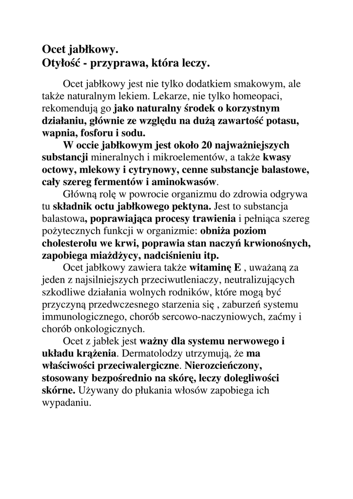 Ocet jabłkowy. Otyłość - przyprawa, która leczy. Ocet jabłkowy jest nie tylko dodatkiem smakowym, ale także naturalnym lekiem. Lekarze, nie tylko homeopaci, rekomendują go jako naturalny środek o korzystnym działaniu, głównie ze względu na dużą zawartość potasu, wapnia, fosforu i sodu. W occie jabłkowym jest około 20 najważniejszych substancji mineralnych i mikroelementów, a także kwasy octowy, mlekowy i cytrynowy, cenne substancje balastowe, cały szereg fermentów i aminokwasów. Główną rolę w powrocie organizmu do zdrowia odgrywa tu składnik octu jabłkowego pektyna. Jest to substancja balastowa, poprawiająca procesy trawienia i pełniąca szereg pożytecznych funkcji w organizmie: obniża poziom cholesterolu we krwi, poprawia stan naczyń krwionośnych, zapobiega miażdżycy, nadciśnieniu itp. Ocet jabłkowy zawiera także witaminę E , uważaną za jeden z najsilniejszych przeciwutleniaczy, neutralizujących szkodliwe działania wolnych rodników, które mogą być przyczyną przedwczesnego starzenia się , zaburzeń systemu immunologicznego, chorób sercowo-naczyniowych, zaćmy i chorób onkologicznych. Ocet z jabłek jest ważny dla systemu nerwowego i układu krążenia. Dermatolodzy utrzymują, że ma właściwości przeciwalergiczne. Nierozcieńczony, stosowany bezpośrednio na skórę, leczy dolegliwości skórne. Używany do płukania włosów zapobiega ich wypadaniu.