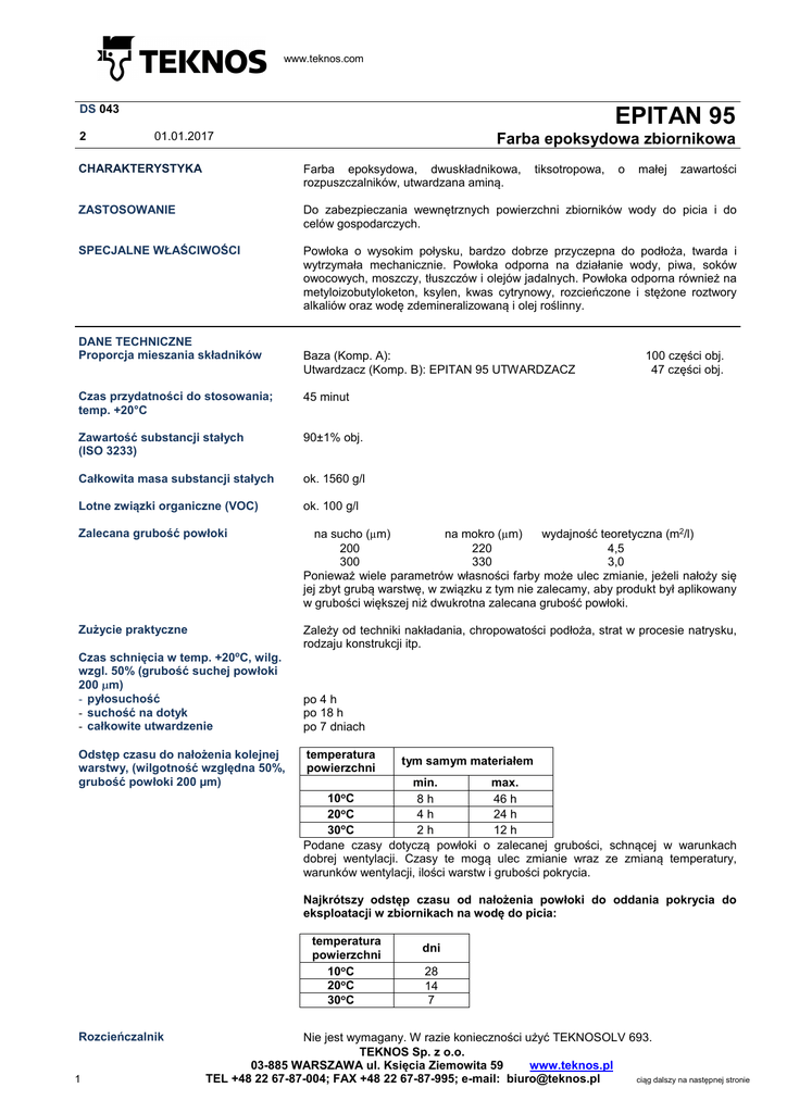 www.teknos.com DS 043 2 EPITAN 95 01.01.2017 Farba epoksydowa zbiornikowa CHARAKTERYSTYKA Farba epoksydowa, dwuskładnikowa, rozpuszczalników, utwardzana aminą. ZASTOSOWANIE Do zabezpieczania wewnętrznych powierzchni zbiorników wody do picia i do celów gospodarczych. SPECJALNE WŁAŚCIWOŚCI Powłoka o wysokim połysku, bardzo dobrze przyczepna do podłoża, twarda i wytrzymała mechanicznie. Powłoka odporna na działanie wody, piwa, soków owocowych, moszczy, tłuszczów i olejów jadalnych. Powłoka odporna również na metyloizobutyloketon, ksylen, kwas cytrynowy, rozcieńczone i stężone roztwory alkaliów oraz wodę zdemineralizowaną i olej roślinny. DANE TECHNICZNE Proporcja mieszania składników tiksotropowa, Baza (Komp. A): Utwardzacz (Komp. B): EPITAN 95 UTWARDZACZ o małej zawartości 100 części obj. 47 części obj. Czas przydatności do stosowania; temp. +20°C 45 minut Zawartość substancji stałych (ISO 3233) 90±1% obj. Całkowita masa substancji stałych ok. 1560 g/l Lotne związki organiczne (VOC) ok. 100 g/l Zalecana grubość powłoki na sucho (µm) na mokro (µm) wydajność teoretyczna (m2/l) 200 220 4,5 300 330 3,0 Ponieważ wiele parametrów własności farby może ulec zmianie, jeżeli nałoży się jej zbyt grubą warstwę, w związku z tym nie zalecamy, aby produkt był aplikowany w grubości większej niż dwukrotna zalecana grubość powłoki. Zużycie praktyczne Zależy od techniki nakładania, chropowatości podłoża, strat w procesie natrysku, rodzaju konstrukcji itp. Czas schnięcia w temp. +20oC, wilg. wzgl. 50% (grubość suchej powłoki 200 µm) - pyłosuchość - suchość na dotyk - całkowite utwardzenie Odstęp czasu do nałożenia kolejnej warstwy, (wilgotność względna 50%, grubość powłoki 200 µm) po 4 h po 18 h po 7 dniach temperatura powierzchni tym samym materiałem min. max. 10oC 8h 46 h 20oC 4h 24 h 30oC 2h 12 h Podane czasy dotyczą powłoki o zalecanej grubości, schnącej w warunkach dobrej wentylacji. Czasy te mogą ulec zmianie wraz ze zmianą temperatury, warunków wentylacji, ilości warstw i grubości pokrycia. Najkrótszy odstęp czasu od nałożenia powłoki do oddania pokrycia do eksploatacji w zbiornikach na wodę do picia: temperatura powierzchni 10oC 20oC 30oC Rozcieńczalnik 1 dni 28 14 7 Nie jest wymagany. W razie konieczności użyć TEKNOSOLV 693. TEKNOS Sp. z o.o. www.teknos.pl 03-885 WARSZAWA ul. Księcia Ziemowita 59 TEL +48 22 67-87-004; FAX +48 22 67-87-995; e-mail: [email protected] ciąg dalszy na następnej stronie EPITAN 95 Rozcieńczalnik do mycia TEKNOSOLV 564. Kolor 320 piaskowy OZNAKOWANIE BEZPIECZEŃSTWA Patrz Karta Charakterystyki SPOSÓB STOSOWANIA Przygotowanie podłoża DS 043 - 2 strona 2 Przed czyszczeniem zaleca się zmycie powierzchni wodą z dodatkiem OLICLEAN 123, a następnie spłukanie czystą wodą. Powierzchnia stalowa sucha, pozbawiona tłuszczu i soli, oczyszczona do stopnia czystości wg PN-ISO 8501-1, co najmniej Sa 3; chropowatość powierzchni oczyszczonej Rz powinna wynosić 60-100 µm. Przygotowanie wyrobu Należy przygotować tylko taką ilość farby, którą zużyje się w czasie krótszym niż jej czas przydatności do stosowania. Przed malowaniem należy składniki farby, w prawidłowej proporcji, dokładnie wymieszać ze sobą, w całej objętości naczynia. Niedokładne wymieszanie lub nieprawidłowy stosunek składników są przyczyną nieprawidłowego utwardzania i pogorszenia się własności powłoki. Warunki podczas nakładania Warunki podczas malowania i utwardzania powłoki: minimalna temperatura podłoża powyżej +10oC oraz co najmniej 3oC wyższa od temperatury punktu rosy; minimalna temperatura otoczenia +10oC; wilgotność względna powietrza najwyżej 80%; dobra wentylacja. Nakładanie Natrysk bezpowietrzny (pędzel - tylko do małych powierzchni). Przy malowaniu pędzlem zalecane jest rozcieńczenie farby poprzez dodanie ok. 3% objętościowych rozcieńczalnika 693 oraz nakładanie farby w kilku warstwach dla uzyskania zalecanej grubości pojedynczej powłoki. Parametry natrysku bezpowietrznego: średnica dyszy 0,53 - 0,68 mm ciśnienie w dyszy 20 - 30 MPa Podczas opracowywania specyfikacji malowania, w zależności przeznaczenia i rodzaju konstrukcji można założyć grubość pojedynczej powłoki inną niż zalecana w instrukcji stosowania. Przy natrysku bezpowietrznym typowy zakres grubości jednej powłoki wynosi od 200 do 300 µm. Zmiana grubości powłoki powoduje zmianę zużycia teoretycznego, grubości warstwy, masy wyschniętej powłoki, czasów schnięcia, czasu do nałożenia kolejnej warstwy oraz oddania pokrycia do eksploatacji. Powłokę w zbiornikach na produkty spożywcze przed rozpoczęciem eksploatacji zbiornika należy umyć, zgodnie z zaleceniami atestu higienicznego. INFORMACJE DODATKOWE Informacje dotyczące przechowywania umieszczone są na etykiecie towaru. Farbę przechowywać w chłodnym pomieszczeniu, dokładnie zamkniętą. Dodatkowe informacje na temat przygotowania powierzchni można znaleźć w normie ISO 12944-4 i ISO 8501-2. Informacje zawarte w karcie danych zostały stworzone w oparciu o badania laboratoryjne i praktyczne doświadczenie. Nie mając wpływu na warunki aplikacji jak również sposób postępowania możemy brać odpowiedzialność wyłącznie za jakość wyrobu i gwarantować, że odpowiada on naszym normom. Nie bierzemy również odpowiedzialności za straty lub uszkodzenia powstałe w wyniku nanoszenia wyrobów niezgodnie z zaleceniami lub z powodu niewłaściwego ich użycia. Produkt przeznaczony jest do użytku profesjonalnego. Oznacza to, że użytkownik posiada wystarczającą wiedzę do korzystania z produktu przestrzegając ściśle warunków technicznych i bezpieczeństwa pracy. Najnowsze wersje kart danych technicznych i charakterystyki znajdują się na stronie: www.teknos.com 2 TEKNOS Sp. z o.o. 03-885 WARSZAWA ul. Księcia Ziemowita 59 www.teknos.pl TEL +48 22 67-87-004; FAX +48 22 67-8