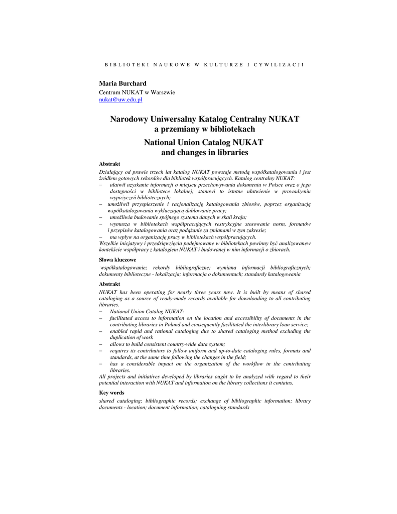BIBLIOTEKI NAUKOWE W KULTURZE I CYWILIZACJI Maria Burchard Centrum NUKAT w Warszwie [email protected] Narodowy Uniwersalny Katalog Centralny NUKAT a przemiany w bibliotekach National Union Catalog NUKAT and changes in libraries Abstrakt Działaj cy od prawie trzech lat katalog NUKAT powstaje metod współkatalogowania i jest ródłem gotowych rekordów dla bibliotek współpracuj cych. Katalog centralny NUKAT: − ułatwił uzyskanie informacji o miejscu przechowywania dokumentu w Polsce oraz o jego dost pno ci w bibliotece lokalnej; stanowi to istotne ułatwienie w prowadzeniu wypo ycze bibliotecznych; − umo liwił przyspieszenie i racjonalizacj katalogowania zbiorów, poprzez organizacj współkatalogowania wykluczaj c dublowanie pracy; − umo liwia budowanie spójnego systemu danych w skali kraju; − wymusza w bibliotekach współpracuj cych restrykcyjne stosowanie norm, formatów i przepisów katalogowania oraz pod anie za zmianami w tym zakresie; − ma wpływ na organizacj pracy w bibliotekach współpracuj cych. Wszelkie inicjatywy i przedsi wzi cia podejmowane w bibliotekach powinny by analizowanew kontek cie współpracy z katalogiem NUKAT i budowanej w nim informacji o zbiorach. Słowa kluczowe współkatalogowanie; rekordy bibliograficzne; wymiana informacji bibliograficznych; dokumenty biblioteczne - lokalizacja; informacja o dokumentach; standardy katalogowania Abstrakt NUKAT has been operating for nearly three years now. It is built by means of shared cataloging as a source of ready-made records available for downloading to all contributing libraries. − National Union Catalog NUKAT: − facilitated access to information on the location and accessibility of documents in the contributing libraries in Poland and consequently facilitated the interlibrary loan service; − enabled rapid and rational cataloging due to shared cataloging method excluding the duplication of work − allows to build consistent country-wide data system; − requires its contributors to follow uniform and up-to-date cataloging rules, formats and standards, at the same time following the changes in the field; − has a considerable impact on the organization of the workflow in the contributing libraries. All projects and initiatives developed by libraries ought to be analyzed with regard to their potential interaction with NUKAT and information on the library collections it contains. Key words shared cataloging; bibliographic records; exchange of bibliographic information; library documents - location; document information; cataloguing standards 182 Maria Burchard 1. Wprowadzenie Narodowy Uniwersalny Katalog Centralny NUKAT oparty jest na koncepcji zbiorowego katalogowania w bazie centralnej i udost pniania bibliotekom gotowych danych do kopiowania. Jest przedsi wzi ciem ogólnokrajowym realizowanym przez biblioteki naukowe, a w szczególno ci biblioteki akademickie przygotowuj ce rekordy haseł wzorcowych oraz rekordy bibliograficzne dla dokumentów gromadzonych w swoich zbiorach. Rekordy te, po zatwierdzeniu do katalogu centralnego s nast pnie wielokrotnie, w miar potrzeby, wykorzystywane w katalogach lokalnych jako podstawa ich budowania. Koordynacj współkatalogowania i kontrol wprowadzanych do NUKAT-u rekordów prowadzi zespół Centrum NUKAT w Bibliotece Uniwersyteckiej w Warszawie. Do tworzenia koncepcji katalogu centralnego polskie biblioteki naukowe przyst piły w ko cu 1997 r. z baga em rekordów utworzonych w katalogach lokalnych pod koniec lat 80. i w pierwszej połowie lat 90. Katalogi te budowane były z wykorzystaniem rozmaitego oprogramowania bibliotecznego obsługuj cego ró nego rodzaju, cz sto niestandardowe, formaty zapisu danych oraz z ograniczon wiadomo ci znaczenia poj cia kartoteki haseł wzorcowych (khw). Był to wynik prowadzonego wówczas ywiołowo i w rozproszeniu procesu komputeryzacji katalogów bibliotecznych. Zabrakło centralnej koordynacji i dalekowzrocznej strategii w realizacji tego zadania. Do pracy w systemach skomputeryzowanych biblioteki przeniosły swój warsztat wypracowany przez lata przy budowaniu katalogów kartkowych, wraz z ró nymi lokalnymi nawykami i odr bno ciami. Nie było warunków, przede wszystkim finansowych, ale tak e odpowiedniej dojrzało ci rodowiska bibliotekarskiego, aby komputeryzacj katalogów bibliotecznych rozpocz od zbudowania katalogu centralnego, a dopiero w drugiej kolejno ci budowa katalogi lokalne jako jego pochodne [3] [4]. Nie potrafili my dostrzec nadzwyczajnych mo liwo ci, jakie niosła niedoskonała jeszcze wówczas ł czno sieciowa. Nie dostrzegano równie potrzeby współpracy i nie było powszechnej gotowo ci do poł czonego działania. Jedyne inicjatywy wspólne zrealizowane w gronie bibliotek u ytkuj cych system VTLS, odbierane były jako utrudnienie katalogowania i odbieranie autonomii bibliotekom [1] [2]. Takie wła nie były reakcje na przygotowane teoretycznie przez Ann Paluszkiewicz, a nast pnie upowszechniane poprzez szkolenia i wdra ane od pocz tku w bibliotekach u ytkuj cych system VTLS, zagadnienia podstawowe dotycz ce zasad tworzenia i stosowania rekordów khw oraz stosowania formatu - pocz tkowo USMARC, pó niej MARC 21 [6] [7]. Były to inicjatywy oddolne, dzi ki którym została zapocz tkowana w 1993 r. Centralna Kartoteka Haseł Wzorcowych (CKHW) [1], a w 1995 r. Centralny Katalog Czasopism (CKTCz) [5]. Obie te bazy jako jedyne z utworzonych w latach 90. zostały pó niej wykorzystane w katalogu centralnym NUKAT i s w nim nadal rozwijane. Jeszcze na etapie projektowania katalogu centralnego cierały si dwa pogl dy na temat jego kształtu [2]. Cz zespołu projektantów sprzeciwiała Narodowy Uniwersalny Katalog Centralny NUKAT… 183 si rygorystycznemu nakazowi sporz dzania i stosowania w katalogu centralnym rekordów khw i budowaniu tego katalogu w trybie online za pomoc klienta systemu centralnego. Ponadto forsowany był pomysł scalenia w bazie katalogu centralnego niejednorodnych danych z istniej cy
