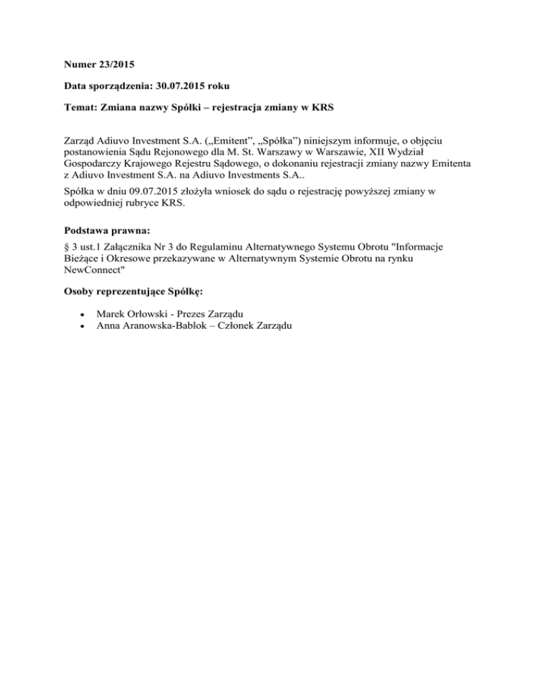 Numer 23/2015 Data sporządzenia: 30.07.2015 roku Temat: Zmiana nazwy Spółki – rejestracja zmiany w KRS Zarząd Adiuvo Investment S.A. („Emitent”, „Spółka”) niniejszym informuje, o objęciu postanowienia Sądu Rejonowego dla M. St. Warszawy w Warszawie, XII Wydział Gospodarczy Krajowego Rejestru Sądowego, o dokonaniu rejestracji zmiany nazwy Emitenta z Adiuvo Investment S.A. na Adiuvo Investments S.A.. Spółka w dniu 09.07.2015 złożyła wniosek do sądu o rejestrację powyższej zmiany w odpowiedniej rubryce KRS. Podstawa prawna: § 3 ust.1 Załącznika Nr 3 do Regulaminu Alternatywnego Systemu Obrotu "Informacje Bieżące i Okresowe przekazywane w Alternatywnym Systemie Obrotu na rynku NewConnect" Osoby reprezentujące Spółkę: Marek Orłowski - Prezes Zarządu Anna Aranowska-Bablok – Członek Zarządu