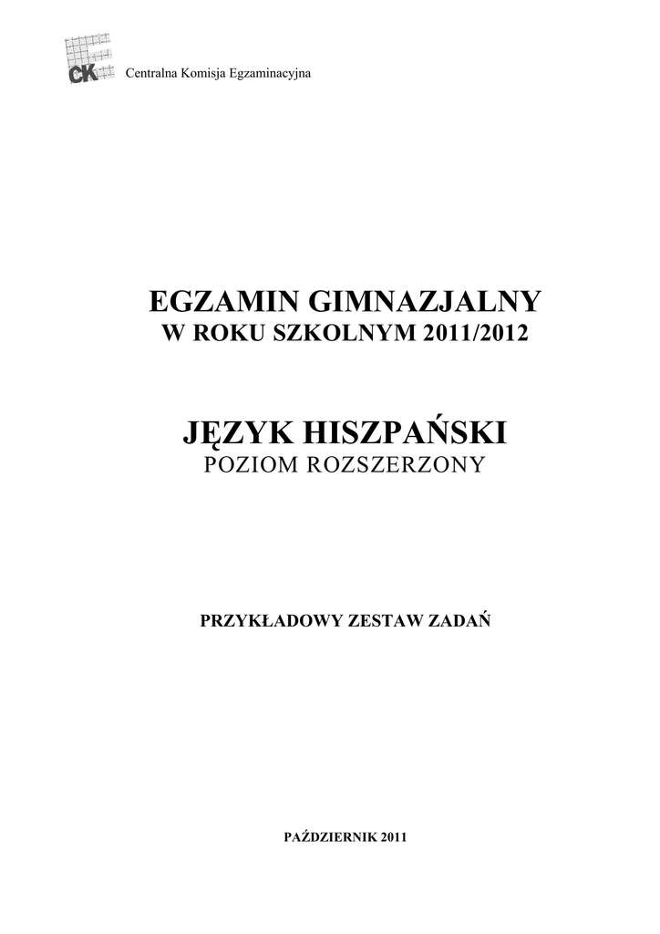 Centralna Komisja Egzaminacyjna EGZAMIN GIMNAZJALNY W ROKU SZKOLNYM 2011/2012 JĘZYK HISZPAŃSKI POZIOM ROZSZERZONY PRZYKŁADOWY ZESTAW ZADAŃ PAŹDZIERNIK 2011 Zadanie 1. Usłyszysz dwukrotnie dwa teksty. Na podstawie informacji zawartych w nagraniu w zadaniach 1.1.–1.6. z podanych odpowiedzi wybierz właściwą. Zakreśl literę A, B albo C. Zadania 1.1.–1.3. odnoszą się do pierwszego tekstu, a zadania 1.4.–1.6. do drugiego. Tekst 1. Usłyszysz rozmowę telefoniczną. 1.1. El chico llama a la señora Alfaro para А. apuntarse a un concurso. В. informarse sobre su premio. С. reservar un vuelo a Sudamérica. 1.2. Manuel ha decidido А. a qué país va a ir. В. con quién va a viajar. С. cuándo va a realizar el viaje. 1.3. Manuel va a llamar otra vez А. el mismo día. В. dentro de una semana. С. después de las seis y media. Tekst 2. Usłyszysz komunikat o planowanej manifestacji. 1.4. Los organizadores de la manifestación son А. los trabajadores de un centro comercial. В. los amantes de la naturaleza. С. las autoridades de la ciudad. 1.5. La manifestación terminará en А. una de las calles principales. В. el estadio de fútbol. С. la Plaza Mayor. 1.6. Ese día А. las temperaturas bajarán. В. va a llover al mediodía. С. hará mucho calor. Strona 2 z 9 Zadanie 2. Usłyszysz dwukrotnie cztery wypowiedzi na temat zmiany miejsca zamieszkania. Na podstawie informacji zawartych w nagraniu dopasuj do każdej wypowiedzi (2.1.–2.4.) odpowiadające jej zdanie (A–E). Wpisz rozwiązania do tabeli. Uwaga! Jedno zdanie zostało podane dodatkowo i nie pasuje do żadnej wypowiedzi. Esta persona A. no tiene con quien salir. B. no ha cambiado de muebles. C. no puede desarrollar sus aficiones. D. está en contacto con sus viejos amigos. E. tiene problemas con una de las asignaturas. 2.1. 2.2. 2.3. Strona 3 z 9 2.4. Zadanie 3. Przeczytaj tekst. Do każdego akapitu (3.1.–3.3.) dopasuj właściwy nagłówek (A–D). Wpisz odpowiednią literę obok numeru każdego akapitu. Uwaga! Jeden nagłówek został podany dodatkowo i nie pasuje do żadnego akapitu. A. ¿Quién puede participar? B. ¿Cómo se garantiza la seguridad? C. ¿Cuál es el programa de actividades? D. ¿Dónde se encuentra el campamento? ¿NO SABES ADÓNDE IR DE VACACIONES? ¡ELIGE NUESTRA OFERTA! 3.1. ____ Este verano Campo Aventura les ofrece a los jóvenes una experiencia divertida e inolvidable. Los participantes tendrán la oportunidad de montar a caballo o en quads, descender en kayak o canoa, construir casas en los árboles y jugar a los indios. Todos los juegos sirven para desarrollar independencia, responsabilidad y autoconfianza. 3.2. ____ El programa se realizará en un pequeño pueblo en la montaña, en un lugar tranquilo, donde los jóvenes estarán en contacto con la naturaleza y disfrutarán de un clima semitropical, de impresionante vegetación, y de una gran variedad de especies de flora y fauna. 3.3. ____ En Campo Aventura hay un instructor por cada 8 participantes, lo que permite tener un buen control del grupo. Además, los jóvenes cuentan con servicio médico especializado. El médico y la enfermera están a su disposición las 24 horas. Strona 4 z 9 Zadanie 4. Przeczytaj tekst, z którego usunięto cztery zdania. Wpisz w luki 4.1.–4.4. litery, którymi oznaczono brakujące zdania (A–E), tak aby otrzymać logiczny i spójny tekst. Uwaga! Jedno zdanie zostało podane dodatkowo i nie pasuje do żadnej luki. UN PÁJARO QUE HABLA ¿Necesitas practicar un idioma? Ya no tienes que usar métodos tradicionales. 4.1. ____ Sí, has leído bien, un loro. Marin Burghelea, un estudiante universitario rumano, está aprendiendo a hablar italiano con un loro que habla este idioma a la perfección. 4.2. ____ A los pocos días de tenerlo en casa, Marin descubrió que su nueva mascota no sólo hablaba italiano con fluidez, sino que también... ¡hablaba rumano! “Es increíble. 4.3. ____”dice el chico. Parece ser que el pájaro ya ha aprendido 500 palabras rumanas y ahora puede traducirlas fácilmente. Ahora, Marin ya no necesita diccionario. 4.4. ____ Y éste las traduce. adaptado de www.ihes.com A. Luca nunca mezcla las dos lenguas, aunque son muy parecidas. B. Tu solución puede ser un loro. C. Por el contrario, Luca traduce sin entender lo que dice. D. Luca, que es como se llama el pájaro, fue un regalo de un amigo suyo italiano. E. En vez de buscar en él las palabras desconocidas, se las pregunta a Luca. Strona 5 z 9 Zadanie 5. Przeczytaj informacje o trzech osobach (5.1.–5.3.) oraz cztery oferty spędzenia wolnego czasu (A–D). Do każdej osoby dopasuj propozycję, która najbardziej by jej odpowiadała. Wpisz odpowiednią literę obok numeru każdej osoby. Uwaga! Jedna propozycja została podana dodatkowo i nie pasuje do żadnej osoby. 5.1. ____ ĺñigo, universitario de 20 años. Le gusta el cine de acción. No tiene un estilo de música preferido, escucha y baila un poco de todo. Este sábado quiere salir con sus amigos. 5.2. ____ Óscar, empresario de 30 años. Trabaja de lunes a viernes. Va mucho a conciertos, le interesa la historia de la música. No le gusta bailar. Sale del trabajo a las ocho de la tarde. 5.3. ____ Lucía, estudiante de 16 años. Le gusta escuchar música, pero los conciertos la aburren. Su gran pasión es el baile. Le encanta observar a los bailarines profesionales. No puede gastar más de 10 euros. A. El mejor cantante inglés en vivo El cantante inglés Henry Roberts vuelve a España para presentar su nuevo disco. El artista dará dos conciertos el próximo 6 de noviembre en el club La Riviera, uno de los más frecuentados de nuestra ciudad. Viernes, 12:00h, 19:00h Entrada: 35 euros B. Discoteca El Junco Antigua sala de fiestas hoy convertida en una discoteca para mayores de 18 años. Un lugar para bailar distintos tipos de música, escogida por los mejores DJ’s (techno, house, merengue, hip hop). El local tiene zona V.I.P. Horario: todos los días de 21:00h a 4: