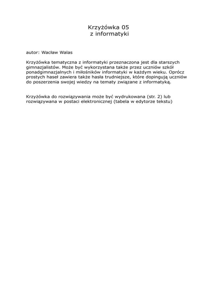 Krzyżówka 05 z informatyki autor: Wacław Walas Krzyżówka tematyczna z informatyki przeznaczona jest dla starszych gimnazjalistów. Może być wykorzystana także przez uczniów szkół ponadgimnazjalnych i miłośników informatyki w każdym wieku. Oprócz prostych haseł zawiera także hasła trudniejsze, które dopingują uczniów do poszerzenia swojej wiedzy na tematy związane z informatyką. Krzyżówka do rozwiązywania może być wydrukowana (str. 2) lub rozwiązywana w postaci elektronicznej (tabela w edytorze tekstu) Krzyżówka 05 1 tematyczna z informatyki 2 3 5 4 6 7 8 9 10 11 12 13 POZIOMO 2. Standard określający maksymalną rozdzielczość obrazu 640x480 pikseli i 256 kolorów; 5. Norma dotycząca ergonomii pracy, w szczególności norma emisyjna i energetyczna monitorów; 6. 24-pinowe złącze monitorowe służące do przesyłania sygnału cyfrowego z komputera do monitora LCD; 7. Tryb wstawiania znaku w edytorze tekstu; 8. Rozbudowany, skryptowy język programowania służący do tworzenia interaktywnych serwisów WWW; 10. Plik, w którym zapisywane są zarejestrowane przez system operacyjny wydarzenia; 13. Zwiastun gry komputerowej, krótki film zmontowany z fragmentów gry; PIONOWO 1. Protokół przeznaczony do transferu dokumentów hipertekstowych (html); 2. Technologia umożliwiająca przesyłanie głosu za pomocą łączy internetowych, popularnie nazywana telefonią internetową; 3. Asymetryczna cyfrowa linia abonencka, łącze umożliwiające bardzo szybkie połączenie z Internetem przy pomocy zwykłej linii telefonicznej; 4. Program sprawdzający połączenie z innym komputerem wpiętym w sieć, stosowany do diagnozowania połączeń i określania miejsca, gdzie występują problemy z łącznością; 9. Jednostka miary częstotliwości zegara, który wyznacza cykl pracy komputera 11. Duży polski portal internetowy; 12. Format pliku graficznego powszechnie używanego w Internecie; Krzyżówka 05 1 tematyczna z informatyki z rozwiązaniem 2 H 3 V G 5 4 A P 6 T C O D N I 7 T 8 I N 9 P S 10 H P L N 11 O G 12 E G N 13 T R C A I F L E R T POZIOMO 2. Standard określający maksymalną rozdzielczość obrazu 640x480 pikseli i 256 kolorów; 5. Norma dotycząca ergonomii pracy, w szczególności norma emisyjna i energetyczna monitorów; 6. 24-pinowe złącze monitorowe służące do przesyłania sygnału cyfrowego z komputera do monitora LCD; 7. Tryb wstawiania znaku w edytorze tekstu; 8. Rozbudowany, skryptowy język programowania służący do tworzenia interaktywnych serwisów WWW; 10. Plik, w którym zapisywane są zarejestrowane przez system operacyjny wydarzenia; 13. Zwiastun gry komputerowej, krótki film zmontowany z fragmentów gry PIONOWO 1. Protokół przeznaczony do transferu dokumentów hipertekstowych (html); 2. Technologia umożliwiająca przesyłanie głosu za pomocą łączy internetowych, popularnie nazywana telefonią internetową; 3. Asymetryczna cyfrowa linia abonencka, łącze umożliwiające bardzo szybkie połączenie z Internetem przy pomocy zwykłej linii telefonicznej; 4. Program sprawdzający połączenie z innym komputerem wpiętym w sieć, stosowany do diagnozowania połączeń i określania miejsca, gdzie występują problemy z łącznością; 9. Jednostka miary częstotliwości zegara, który wyznacza cykl pracy komputera 11. Duży polski portal internetowy; 12. Format pliku graficznego powszechnie używanego w Internecie;