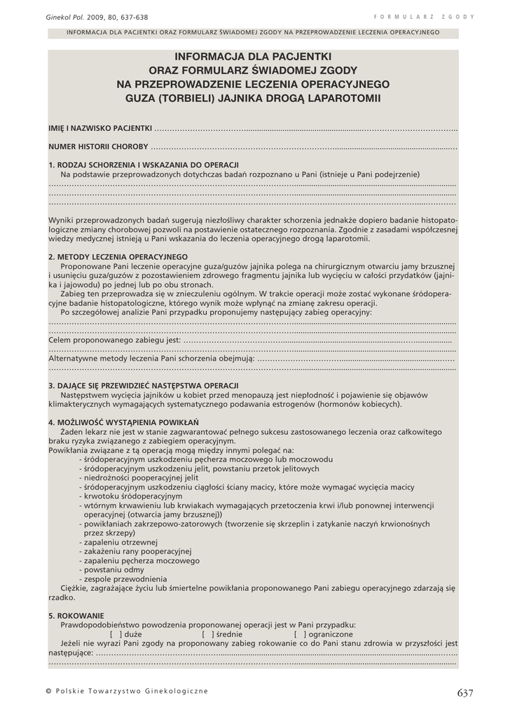 Ginekol Pol. 2009, 80, 637-638 F O R M U L A R Z Z G O D Y INFORMACJA DLA PACJENTKI ORAZ FORMULARZ ÂWIADOMEJ ZGODY NA PRZEPROWADZENIE LECZENIA OPERACYJNEGO INFORMACJA DLA PACJENTKI ORAZ FORMULARZ ŚWIADOMEJ ZGODY NA PRZEPROWADZENIE LECZENIA OPERACYJNEGO GUZA (TORBIELI) JAJNIKA DROGĄ LAPAROTOMII IMI¢ I NAZWISKO PACJENTKI ………………………………......................................................……………………………….. NUMER HISTORII CHOROBY ………………………………………………………………......................................................… 1. RODZAJ SCHORZENIA I WSKAZANIA DO OPERACJI Na podstawie przeprowadzonych dotychczas badaƒ rozpoznano u Pani (istnieje u Pani podejrzenie) ……………………………………………………………………………………............................................................................ ……………………………………………………………………………………............................................................................ ………………………………………………………………………………………………………………………………....………… Wyniki przeprowadzonych badaƒ sugerujà niez∏oÊliwy charakter schorzenia jednak˝e dopiero badanie histopatologiczne zmiany chorobowej pozwoli na postawienie ostatecznego rozpoznania. Zgodnie z zasadami wspó∏czesnej wiedzy medycznej istniejà u Pani wskazania do leczenia operacyjnego drogà laparotomii. 2. METODY LECZENIA OPERACYJNEGO Proponowane Pani leczenie operacyjne guza/guzów jajnika polega na chirurgicznym otwarciu jamy brzusznej i usuni´ciu guza/guzów z pozostawieniem zdrowego fragmentu jajnika lub wyci´ciu w ca∏oÊci przydatków (jajnika i jajowodu) po jednej lub po obu stronach. Zabieg ten przeprowadza si´ w znieczuleniu ogólnym. W trakcie operacji mo˝e zostaç wykonane Êródoperacyjne badanie histopatologiczne, którego wynik mo˝e wp∏ynàç na zmian´ zakresu operacji. Po szczegó∏owej analizie Pani przypadku proponujemy nast´pujàcy zabieg operacyjny: ……………………………………………………………………………………............................................................................ ……………………………………………………………………………………............................................................................ Celem proponowanego zabiegu jest: ………………………………….......................................................……................. ……………………………………………………………………………………............................................................................ Alternatywne metody leczenia Pani schorzenia obejmujà: ……………………………..............................................…… ……………………………………………………………………………………............................................................................ 3. DAJÑCE SI¢ PRZEWIDZIEå NAST¢PSTWA OPERACJI Nast´pstwem wyci´cia jajników u kobiet przed menopauzà jest niep∏odnoÊç i pojawienie si´ objawów klimakterycznych wymagajàcych systematycznego podawania estrogenów (hormonów kobiecych). 4. MO˚LIWOÂå WYSTÑPIENIA POWIK¸A¡ ˚aden lekarz nie jest w stanie zagwarantowaç pe∏nego sukcesu zastosowanego leczenia oraz ca∏kowitego braku ryzyka zwiàzanego z zabiegiem operacyjnym. Powik∏ania zwiàzane z tà operacjà mogà mi´dzy innymi polegaç na: - Êródoperacyjnym uszkodzeniu p´cherza moczowego lub moczowodu - Êródoperacyjnym uszkodzeniu jelit, powstaniu przetok jelitowych - niedro˝noÊci pooperacyjnej jelit - Êródoperacyjnym uszkodzeniu ciàg∏oÊci Êciany macicy, które mo˝e wymagaç wyci´cia macicy - krwotoku Êródoperacyjnym - wtórnym krwawieniu lub krwiakach wymagajàcych przetoczenia krwi i/lub ponownej interwencji operacyjnej (otwarcia jamy brzusznej)) - powik∏aniach zakrzepowo-zatorowych (tworzenie si´ skrzeplin i zatykanie naczyƒ krwionoÊnych przez skrzepy) - zapaleniu otrzewnej - zaka˝eniu rany pooperacyjnej - zapaleniu p´cherza moczowego - powstaniu odmy - zespole przewodnienia Ci´˝kie, zagra˝ajàce ˝yciu lub Êmiertelne powik∏ania proponowanego Pani zabiegu operacyjnego zdarzajà si´ rzadko. 5. ROKOWANIE Prawdopodobieƒstwo powodzenia proponowanej operacji jest w Pani przypadku: [ ] du˝e [ ] Êrednie [ ] ograniczone Je˝eli nie wyrazi Pani zgody na proponowany zabieg rokowanie co do Pani stanu zdrowia w przysz∏oÊci jest nast´pujàce: ………………………………………….......................................................................................................…….. ……………………………………………………………………………………............................................................................ © Polskie Towarzystwo Ginekologiczne 637 F O R M U L A R Z Ginekol Pol. 2009, 80, 637-638 Z G O D Y INFORMACJA DLA PACJENTKI ORAZ FORMULARZ ÂWIADOMEJ ZGODY NA PRZEPROWADZENIE LECZENIA OPERACYJNEGO 6. ROZMOWA Z LEKARZEM Prosimy, aby Pani zapyta∏a nas o wszystko co chcia∏aby Pani wiedzieç w zwiàzku z planowanym leczeniem. Wszelkie informacje dodatkowe dotyczàce planowanego leczenia oraz wszelkie oczekiwane przez Panià wyjaÊnienia mo˝na uzyskaç u ka˝dego specjalisty w zakresie ginekologii i po∏o˝nictwa zatrudnionego w naszym Oddziale/Klinice. Ch´tnie odpowiemy na wszystkie Pani pytania. ZASTRZE˚ENIA PACJENTKI CO DO PROPONOWANEGO LECZENIA OPERACYJNEGO ……………………………………………………………………………………............................................................................ ……………………………………………………………………………………............