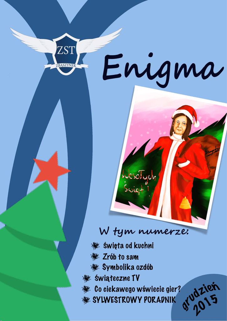 ŚWIĘTA OD KUCHNI ;) 12 potraw wigilijnych to tradycja na świątecznym stole, tak jak sianko pod obrusem i dodatkowe nakrycie stołu. Przygotowania ruszają pełną parą już na kilka dni przed Wigilią. Zakupy, lepienie uszek, pieczenie ciast, … to wszystko czeka zapracowane panie domu tuż przed świętami, a potraw do przyszykowania nie jest mało. O to przepis na słodkie święta : Składniki na około 55 pierniczków: 300 g mąki pszennej 100 g mąki żytniej pełnoziarnistej 2 duże jajka 130 g cukru pudru 100 g masła, roztopionego i lekko przestudzonego 100 g łagodnego miodu np. akacjowego* 1 łyżka przyprawy do piernika 1 łyżka kakao 1 łyżeczka sody oczyszczonej Wszystkie składniki wsypać do naczynia, wymieszać i wyrobić do otrzymania gładkiego ciasta (można mikserem). Ciasto może być klejące, ale nie dodawać mąki. Ciasto rozwałkować na grubość 4 mm (nie cieniej), podsypując je małą ilością mąki - tylko tyle, by nie kleiło się do stolnicy. Wykrawać różne kształty pierniczków. Układać je na blaszce wyłożonej papierem do pieczenia w niewielkich odstępach. Piec w temperaturze 180ºC przez około 8 - 10 minut (długość pieczenia zależy od wielkości pierniczków, mniejsze pieczemy nawet krócej). Wyjąć, wystudzić na kratce. Dowolnie udekorować. Zrób to sam :) Zbliżają się święta Bożonarodzeniowe więc wiele osób zastanawia się co komu dać/kupić z tej okazji. Powinniśmy w takiej sytuacji zastanowić się sami co sprawiło by nam większą przyjemność kupiony czy własnoręcznie zrobiony podarunek. Pomysły na prezenty własnej roboty: - Zdjęcia z gałązkami - Zimowy słoiczek - Etui na telefon - Poduszka z haftem - Pierniczki w słoiczku Patryk Jankowiak Symbolika ozdób Jak wiemy tradycja ubierania choinki i jej obecność w naszych domach wywodzi się z VIII wieku. Święty Bonifacy uznał za znak niebios młode zielone drzewko za symbol Chrystusa i chrześcijaństwa. Zwyczaj ubierania choinki przyszedł do nas z Niemiec pod koniec XVIII wieku, ale każda ozdoba ma swoje znaczenie: ło at i św B le et m je sk zdrowie i uroda ok szły r y z r p a atek n ie opie kuno wie d omu dobre nowin y i rad osne wyda rz enia dost miłość i zgoda Tymoteusz Bil Świąteczne TV Kevin sam w domu Po prostu tradycja!!! Przetrwać święta Zamożny mężczyzna, stojący przed smutną perspektywą spędzenia po raz kolejny Bożego Narodzenia samotnie, postanawia wrócić do domu, w którym mieszkał jako dziecko i zaproponować jego obecnym mieszkańcom, by w zamian za sporą sumę pieniędzy, stali się jego "rodziną na święta". Krampus. Duch świąt To nie będzie białe Boże Narodzenie. Dwunastoletni Max stara się przeżyć święta. Jego święta to przepracowana, niedoceniana matka, Tak Max traci wiarę w święta.Co przyczynia się do pojawienia się Złego Ducha Świąt - Krampusa, który według wierzeń, przybywa zza światów, by w świąteczny czas ukarać niegodziwych. Seria legenda, którą znają prawie wszyscy. Skakanie po kolejnych poziomach i łapanie prezentów sprawiało sporą frajdę pomimo tego, że gra ma już trochę lat nadal może cieszyć. Nawet jeżeli pogracie to jakieś 30 minut XD SYLWESTROWY PORADNIK Przed nami Sylwester!!! Plastikowe kubki zamiast rodowej porcelany Jasne, plastikowe naczynia uchodzą za symbol obciachu. Jednak domówka to nie najlepszy czas na prezentowanie porcelanowej zastawy. Chcąc uchronić ją przed nieplanowanym zniszczeniem albo zaoszczędzić czas, który poświęcilibyśmy na zmywanie, przeznaczyć na leczenie po imprezowego złego samopoczucia, należy zaopatrzyć się w plastikowe naczynia. Redakcja radzi: Dyskotekowe kule i konfetti Nawet jeśli nie masz takich gadżetów, możesz łatwo zamienić każde, nawet najbardziej smętne mieszkanko w blokowisku w klimatyczne miejsce domówki! Wystarczy, że wykorzystasz do tego, na przykład, lampki, którymi zazwyczaj ozdabiasz świąteczną choinkę oraz serpentyny, balony. Jeśli nie dom, to co? Mił ej z aba wy !!! Kamil Olejniczak Dobrym sposobem są nie tylko sprawdzone kluby, ale też bardziej niekonwencjonalne miejsca. Za kilkadziesiąt złotych można wynająć imprezowy autobus, limuzynę, a nawet… tramwaj. Złóżcie się!!! :D „Please don't stop the music” Zanim jednak wybierzesz autorską listę przebojów na wieczór, sprawdź, przy czym lubią bawić się Twoi goście. Zaproś ich do wspólnego opracowania imprezowej play listy. Na domówce nawet najbardziej obciachowe kawałki czy radiowe hity są dozwolone. Niech ten świąteczny czas odmieni wszystkich Nas. Niech pokój i spokój nam w sercach zawita. Niech pośpiech przy stole nie gości, niech tegoroczne Święta będą pełne radości. Niech razem z opłatkiem uśmiechem się każdy podzieli, byśmy w ten czas świąteczny byli prawdziwie weseli! A Nowy Rok przyniesie spełnienie wszystkich marzeń. Niech Boża Dziecina Wszystkich Błogosławi i hojnie obdarowuje. Redakcja :) Redakcja oczekuje na rozwiązania, które można umieszczać w skrzynce zamontowanej na ścianie za tablicami ogłoszeń w głównym holu. Spośród poprawnych odpowiedzi, drogą losowania wyłoniona zostanie Osoba, która otrzyma nagrodę NASZ ZESPÓŁ: Redaktor naczelny: Kamil Olejniczak Z-ca redaktora: Dominik Błoszyk Członkowie redakcji: Asia Zuza, Angelika Psarska, Tymoteusz Bil, Patryk Jankowiak, Daniel Nowicki; E-mail: [email protected]