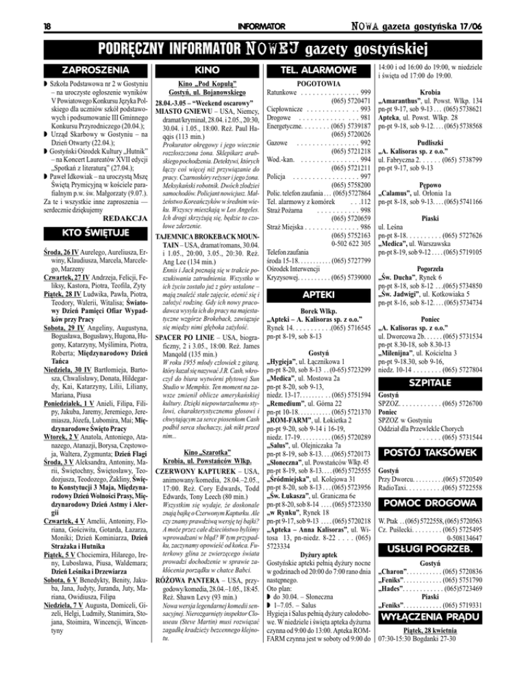 18 INFORMATOR NOWA gazeta gostyñska 17/06 PODRÊCZNY INFORMATOR NOWEJ gazety gostyñskiej ZAPROSZENIA KINO w Szko³a Podstawowa nr 2 w Gostyniu Kino Pod Kopu³¹ Gostyñ, ul. Bojanowskiego na uroczyste og³oszenie wyników V Powiatowego Konkursu Jêzyka Pol- 28.04.-3.05 Weekend oscarowy skiego dla uczniów szkó³ podstawo- MIASTO GNIEWU USA, Niemcy, wych i podsumowanie III Gminnego dramat/krymina³, 28.04. i 2.05., 20:30, Konkursu Przyrodniczego (20.04.); 30.04. i 1.05., 18:00. Re¿. Paul Haw Urz¹d Skarbowy w Gostyniu na qqis (113 min.) Dzieñ Otwarty (22.04.); Prokurator okrêgowy i jego wiecznie w Gostyñski Orodek Kultury Hutnik rozz³oszczona ¿ona. Sklepikarz arab na Koncert Laureatów XVII edycji skiego pochodzenia. Detektywi, których Spotkañ z literatur¹ (27.04.); ³¹czy co wiêcej ni¿ przywi¹zanie do w Pawe³ Idkowiak na uroczyst¹ Mszê pracy. Czarnoskóry re¿yser i jego ¿ona. wiêt¹ Prymicyjn¹ w kociele paraMeksykañski robotnik. Dwóch z³odziei fialnym p.w. w. Ma³gorzaty (9.07.). samochodów. Policjant nowicjusz. Ma³¿eñstwo Koreañczyków w rednim wieZa te i wszystkie inne zaproszenia ku. Wszyscy mieszkaj¹ w Los Angeles. serdecznie dziêkujemy Ich drogi skrzy¿uj¹ siê, bêdzie to czoREDAKCJA ³owe zderzenie. KTO WIÊTUJE TAJEMNICA BROKEBACK MOUNTAIN USA, dramat/romans, 30.04. roda, 26 IV Aurelego, Aureliusza, Eri 1.05., 20:00, 3.05., 20:30. Re¿. winy, Klaudiusza, Marcela, MarceleAng Lee (134 min.) go, Marzeny Ennis i Jack poznaj¹ siê w trakcie poCzwartek, 27 IV Andrzeja, Felicji, Feszukiwania zatrudnienia. Wszystko w liksy, Kastora, Piotra, Teofila, Zyty ich ¿yciu zosta³o ju¿ z góry ustalone Pi¹tek, 28 IV Ludwika, Paw³a, Piotra, maj¹ znaleæ sta³e zajêcie, o¿eniæ siê i za³o¿yæ rodzinê. Gdy ich nowy pracoTeodory, Walerii, Witalisa; wiatodawca wysy³a ich do pracy na majestawy Dzieñ Pamiêci Ofiar Wypadtyczne wzgórze Brokeback, zawi¹zuje ków przy Pracy siê miêdzy nimi g³êboka za¿y³oæ. Sobota, 29 IV Angeliny, Augustyna, Bogus³awa, Bogus³awy, Hugona, Hu- SPACER PO LINIE USA, biogragony, Katarzyny, Mylimira, Piotra, ficzny, 2 i 3.05., 18:00. Re¿. James Roberta; Miêdzynarodowy Dzieñ Manqold (135 min.) Tañca W roku 1955 m³ody cz³owiek z gitar¹, Niedziela, 30 IV Bart³omieja, Bartoktóry kaza³ siê nazywaæ J.R. Cash, wkrosza, Chwalis³awy, Donata, Hildegarczy³ do biura wytwórni p³ytowej Sun dy, Kai, Katarzyny, Lilii, Liliany, Studio w Memphis. Ten moment na zawsze zmieni³ oblicze amerykañskiej Mariana, Piusa kultury. Dziêki niepowtarzalnemu styPoniedzia³ek, 1 V Anieli, Filipa, Fililowi, charakterystycznemu g³osowi i py, Jakuba, Jaremy, Jeremiego, Jerechwytaj¹cym za serce piosenkom Cash miasza, Józefa, Lubomira, Mai; Miêpodbi³ serca s³uchaczy, jak nikt przed dzynarodowe wiêto Pracy nim... Wtorek, 2 V Anatola, Antoniego, Atanazego, Atanazji, Borysa, CzêstowoKino Szarotka ja, Waltera, Zygmunta; Dzieñ Flagi Krobia, ul. Powstañców Wlkp. roda, 3 V Aleksandra, Antoniny, Marii, wiêtochny, wiêtos³awy, Teo- CZERWONY KAPTUREK USA, dozjusza, Teodozego, ¯akliny, wiêanimowany/komedia, 28.04.2.05., to Konstytucji 3 Maja, Miêdzyna17:00. Re¿. Cory Edwards, Todd rodowy Dzieñ Wolnoci Prasy, MiêEdwards, Tony Leech (80 min.) dzynarodowy Dzieñ Astmy i AlerWszystkim siê wydaje, ¿e doskonale gii znaj¹ bajkê o Czerwonym Kapturku. Ale czy znamy prawdziw¹ wersjê tej bajki? Czwartek, 4 V Amelii, Antoniny, FloA mo¿e przez ca³e dzieciñstwo bylimy riana, Gociwita, Gotarda, £azarza, wprowadzani w b³¹d? W tym przypadMoniki; Dzieñ Kominiarza, Dzieñ ku, zaczynamy opowieæ od koñca. FuStra¿aka i Hutnika terkowy glina ze zwierzêcego wiata Pi¹tek, 5 V Chociemira, Hilarego, Ireprowadzi dochodzenie w sprawie zany, Lubos³awa, Piusa, Waldemara; k³ócenia porz¹dku w chatce Babci. Dzieñ Lenika i Drzewiarza Sobota, 6 V Benedykty, Benity, Jaku- RÓ¯OWA PANTERA USA, przyba, Jana, Judyty, Juranda, Juty, Magodowy/komedia, 28.04.1.05., 18:45. riana, Owidiusza, Filipa Re¿. Shawn Levy (93 min.) Niedziela, 7 V Augusta, Domiceli, GiNowa wersja legendarnej komedii senzeli, Helgi, Ludmi³y, Stanimira, Stosacyjnej. Nierozgarniêty inspektor Clouseau (Steve Martin) musi rozwi¹zaæ jana, Stoimira, Wincencji, Wincenzagadkê kradzie¿y bezcennego klejnotyny tu. TEL. ALARMOWE POGOTOWIA Ratunkowe . . . . . . . . . . . . . . . 999 (065) 5720471 Ciep³ownicze . . . . . . . . . . . . . 993 Drogowe . . . . . . . . . . . . . . . 981 Energetyczne. . . . . . . . (065) 5739187 (065) 5720026 Gazowe . . . . . . . . . . . . . . . . 992 (065) 5721218 Wod.-kan. . . . . . . . . . . . . . . . 994 (065) 5721211 Policja . . . . . . . . . . . . . . . . . 997 (065) 5758200 Polic. telefon zaufania . . . (065) 5727864 Tel. alarmowy z komórek . . .112 Stra¿ Po¿arna . . . . . . . . . . . 998 (065) 5720659 Stra¿ Miejska . . . . . . . . . . . . . . 986 (065) 5752163 0-502 622 305 Telefon zaufania roda 15-18. . . . . . . . . . . (065) 5727799 Orodek Interwencji Kryzysowej. . . . . . . . . . (065) 5739000 APTEKI 14:00 i od 16:00 do 19:00, w niedziele i wiêta od 17:00 do 19:00. Krobia Amaranthus, ul. Powst. Wlkp. 134 pn-pt 9-17, sob 9-13 . . . (065) 5738621 Apteka, ul. Powst. Wlkp. 28 pn-pt 9-18, sob 9-12. . . . (065) 5738568 Pudliszki A. Kalisoras sp. z o.o. ul. Fabryczna 2. . . . . . (065) 5738799 pn-pt 9-17, sob 9-13 Pêpowo Calamus, ul. Or³onia 1a pn-pt 8-18, sob 9-13. . . . (065) 5741166 Piaski ul. Lena pn-pt 8-18. . . . . . . . . . (065) 5727626 Medica, ul. Warszawska pn-pt 8-19, sob 9-12 . . . . (065) 5719105 Pogorzela w. Ducha, Rynek 6 pn-pt 8-18, sob 8-12 . . .(065) 5734850 w. Jadwigi, ul. Kotkowiaka 5 pn-pt 8-16, sob 8-12. . . . (065) 5734734 Borek Wlkp. Apteki A. Kalisoras sp. z o.o. Poniec Rynek 14. . . . . . . . . . .(065) 5716545 A. Kalisoras sp. z o.o. pn-pt 8-19, sob 8-13 ul. Dworcowa 2b. . . . . . (065) 5731534 pn-pt 8.30-18, sob 8.30-13 Gostyñ Milenijna, ul. Kocielna 3 Hygieja, ul. £¹cznikowa 1 pn-pt 9-18.30, sob 9-16, pn-pt 8-20, sob
