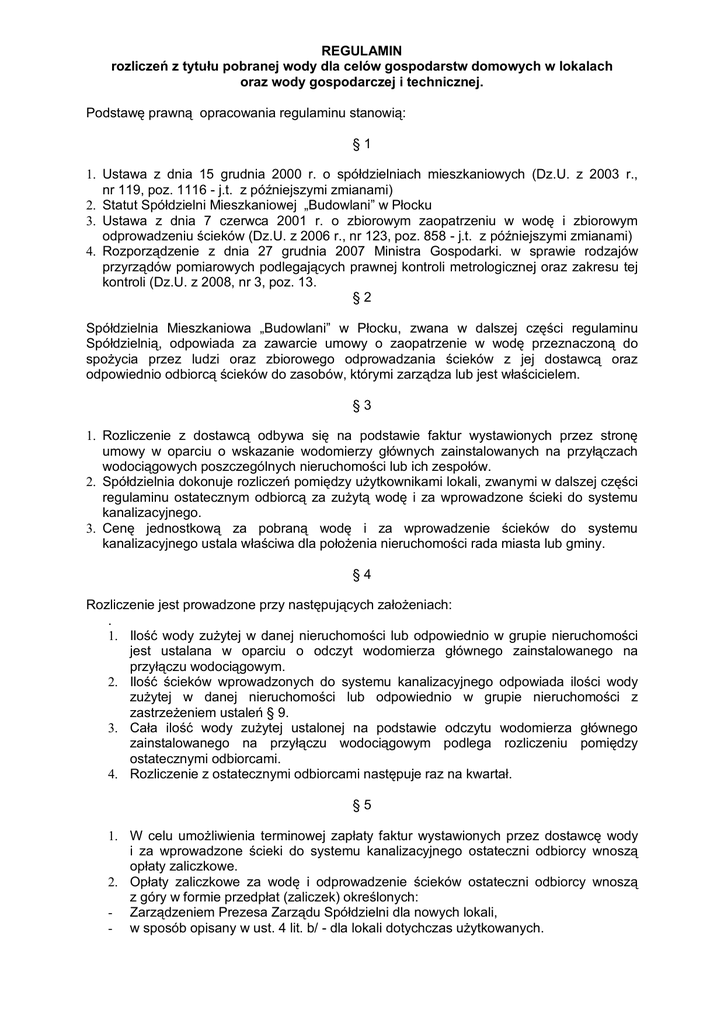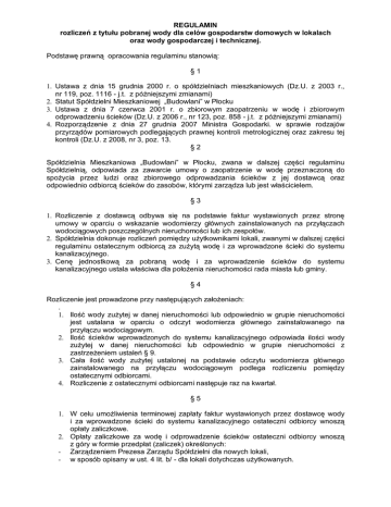 REGULAMIN rozliczeń z tytułu pobranej wody dla celów gospodarstw domowych w lokalach oraz wody gospodarczej i technicznej. Podstawę prawną opracowania regulaminu stanowią: §1 1. Ustawa z dnia 15 grudnia 2000 r. o spółdzielniach mieszkaniowych (Dz.U. z 2003 r., nr 119, poz. 1116 - j.t. z późniejszymi zmianami) 2. Statut Spółdzielni Mieszkaniowej „Budowlani” w Płocku 3. Ustawa z dnia 7 czerwca 2001 r. o zbiorowym zaopatrzeniu w wodę i zbiorowym odprowadzeniu ścieków (Dz.U. z 2006 r., nr 123, poz. 858 - j.t. z późniejszymi zmianami) 4. Rozporządzenie z dnia 27 grudnia 2007 Ministra Gospodarki. w sprawie rodzajów przyrządów pomiarowych podlegających prawnej kontroli metrologicznej oraz zakresu tej kontroli (Dz.U. z 2008, nr 3, poz. 13. §2 Spółdzielnia Mieszkaniowa „Budowlani” w Płocku, zwana w dalszej części regulaminu Spółdzielnią, odpowiada za zawarcie umowy o zaopatrzenie w wodę przeznaczoną do spożycia przez ludzi oraz zbiorowego odprowadzania ścieków z jej dostawcą oraz odpowiednio odbiorcą ścieków do zasobów, którymi zarządza lub jest właścicielem. §3 1. Rozliczenie z dostawcą odbywa się na podstawie faktur wystawionych przez stronę umowy w oparciu o wskazanie wodomierzy głównych zainstalowanych na przyłączach wodociągowych poszczególnych nieruchomości lub ich zespołów. 2. Spółdzielnia dokonuje rozliczeń pomiędzy użytkownikami lokali, zwanymi w dalszej części regulaminu ostatecznym odbiorcą za zużytą wodę i za wprowadzone ścieki do systemu kanalizacyjnego. 3. Cenę jednostkową za pobraną wodę i za wprowadzenie ścieków do systemu kanalizacyjnego ustala właściwa dla położenia nieruchomości rada miasta lub gminy. §4 Rozliczenie jest prowadzone przy następujących założeniach: . 1. Ilość wody zużytej w danej nieruchomości lub odpowiednio w grupie nieruchomości jest ustalana w oparciu o odczyt wodomierza głównego zainstalowanego na przyłączu wodociągowym. 2. Ilość ścieków wprowadzonych do systemu kanalizacyjnego odpowiada ilości wody zużytej w danej nieruchomości lub odpowiednio w grupie nieruchomości z zastrzeżeniem ustaleń § 9. 3. Cała ilość wody zużytej ustalonej na podstawie odczytu wodomierza głównego zainstalowanego na przyłączu wodociągowym podlega rozliczeniu pomiędzy ostatecznymi odbiorcami. 4. Rozliczenie z ostatecznymi odbiorcami następuje raz na kwartał. §5 1. W celu umożliwienia terminowej zapłaty faktur wystawionych przez dostawcę wody i za wprowadzone ścieki do systemu kanalizacyjnego ostateczni odbiorcy wnoszą opłaty zaliczkowe. 2. Opłaty zaliczkowe za wodę i odprowadzenie ścieków ostateczni odbiorcy wnoszą z góry w formie przedpłat (zaliczek) określonych: - Zarządzeniem Prezesa Zarządu Spółdzielni dla nowych lokali, - w sposób opisany w ust. 4 lit. b/ - dla lokali dotychczas użytkowanych. 3. Opłata zaliczkowa jest ustalana odrębnie dla: 1/ lokali zaopatrzonych w indywidualne stacje grzewcze dla celów c.o. i c.w. i wodomierze w celu ustalenia przewidywalnego zużycia wody i odprowadzenia ścieków, 2/ lokali zaopatrzonych w wodomierze w celu ustalenia przewidywalnego zużycia wody i odprowadzenia ścieków oraz podgrzania wody. 4. Przewidywana do zapłaty kwota za zużycie zimnej wody i za odprowadzenie ścieków oraz za podgrzanie wody z uwzględnieniem wszystkich zamontowanych w lokalu indywidualnych wodomierzy w przeliczeniu na jeden miesiąc uzależniona jest od: a/ powierzchni mieszkania - dla nowych lokali b/ dotychczasowego zużycia wody, które zostało uśrednione w stosunku miesięcznym - dla lokali dotychczas użytkowanych. 5. Wysokość zaliczki lub jej zmianę ustala Rada Nadzorcza na wniosek Zarządu Spółdzielni. §6 1. Powstała różnica pomiędzy wskazaniem wodomierza głównego a łącznym zużyciem przez indywidualnych odbiorców, kotłownie lokalne i do sprzątania klatek schodowych budynków jest dzielona proporcjonalnie do zużycia zaewidencjonowanego w każdym z lokali. 2. Różnica, o której mowa w ust. 1 może być wynikiem występowania rozbieżności pomiędzy wskazaniami wodomierzy głównych i wodomierzy indywidualnych montowanych w lokalach. 3. Podstawowe przyczyny rozbieżności, o których mowa w ust. 2 wskazań wodomierza głównego i sumy wskazań wodomierzy indywidualnych to: a/ pobór wody poniżej progu rozruchowego wodomierzy indywidualnych b/ przecieki w urządzeniach odbiorczych c/ niejednoczesność odczytów (dotyczy wodomierza głównego i wodomierzy indywidualnych w lokalach) d/ nieprzestrzeganie okresów legalizacji wodomierzy indywidualnych e/ użycia spłuczek ciśnieniowych f/ zapowietrzenia instalacji 4. Rozliczenie zużycia wody i wprowadzonych do kanalizacji ścieków polega na ustaleniu faktycznego zużycia przez indywidualne gospodarstwa domowe użytkujące lokale oraz rozliczenia tych wartości w oparciu o obowiązującą cenę wody i cenę za wprowadzenie ścieków do systemu kanalizacyjnego i wniesione opłaty zaliczkowe. 5. Ewentualna nadpłata lub niedobór, która wyniknie z kwartalnego rozliczenia podlega odpowiednio: a/ zwrotowi, o ile odbiorca nie jest w zwłoce z opłatami eksploatacyjnymi, b/ uregulowaniu w terminie najbliższej opłaty eksploatacyjnej za lokal. 6. Spółdzielnia będzie wykonywała odczyty zużycia wody niezbędne do przeprowadzenia rozliczenia, o którym mowa w punkcie 5 zgodnie z wcześniej przyjętym harmonogramem i w zależności od potrzeb. §7 1. Każda osoba użytkująca lokal na podstawie tytułu prawnego jest traktowana jak właściciel wodomierza indywidualnego i ponosi odpowiedzialność za jego stan techniczny i legalizację. 2. Spółdzielnia poprzez swoich pracowników lub upoważnionych przedstawicieli będzie prowadziła okresową kontrolę stanu technicznego wodomierzy indywidualnych 3. W przypadku stwierdzenia zerwania plomby, uszkodzenia wodomierza, Spółdzielnia wprowadzi rozliczenie ryczałtowe za okres licząc od daty pr