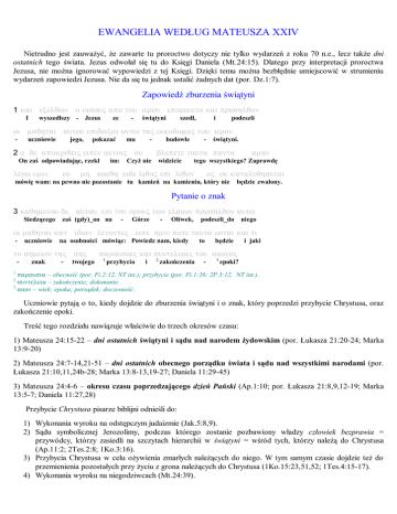 EWANGELIA WEDŁUG MATEUSZA XXIV Nietrudno jest zauważyć, że zawarte tu proroctwo dotyczy nie tylko wydarzeń z roku 70 n.e., lecz także dni ostatnich tego świata. Jezus odwołał się tu do Księgi Daniela (Mt.24:15). Dlatego przy interpretacji proroctwa Jezusa, nie można ignorować wypowiedzi z tej Księgi. Dzięki temu można bezbłędnie umiejscowić w strumieniu wydarzeń zapowiedzi Jezusa. Nie da się tu jednak ustalić żadnych dat (por. Dz.1:7). Zapowiedź zburzenia świątyni 1 kai exelywn o ihsouv apo tou ierou eporeueto kai proshlyon I wyszedłszy - Jezus ze - świątyni szedł, i podeszli oi mayhtai autou epideixai autw tav oikodomav tou ierou uczniowie - jego, pokazać mu - 2 o de apokriyeiv eipen autoiv ou On zaś odpowiadając, rzekł legw umin ou im: budowle - świątyni. blepete tauta panta Czyż nie widzicie amhn tego wszystkiego? Zaprawdę mh afeyh wde liyov epi liyon ov ou kataluyhsetai mówię wam: na pewno nie pozostanie tu kamień na kamieniu, który nie będzie zwalony. Pytanie o znak 3 kayhmenou de autou epi tou orouv twn elaiwn proshlyon autw Siedzącego zaś (gdy)_on na - Górze - Oliwek, podeszli_do niego oi mayhtai kat idian legontev eipe hmin pote tauta estai kai ti - uczniowie na osobności mówiąc: Powiedz nam, kiedy to shmeion thv shv - znak - twojego to będzie i jaki parousiav kai sunteleiav tou aiwnov 1 przybycia i 2 zakończenia - 3 epoki? 1 parousia – obecność (por. Fi.2:12, NT int.); przybycie (por. Fi.1:26; 2P.3:12, NT int.). sunteleia – zakończenie; dokonanie. 3 aiwn – wiek; epoka; porządek; doczesność. 2 Uczniowie pytają o to, kiedy dojdzie do zburzenia świątyni i o znak, który poprzedzi przybycie Chrystusa, oraz zakończenie epoki. Treść tego rozdziału nawiązuje właściwie do trzech okresów czasu: 1) Mateusza 24:15-22 – dni ostatnich świątyni i sądu nad narodem żydowskim (por. Łukasza 21:20-24; Marka 13:9-20) 2) Mateusza 24:7-14,21-51 – dni ostatnich obecnego porządku świata i sądu nad wszystkimi narodami (por. Łukasza 21:10,11,24b-28; Marka 13:8-13,19-27; Daniela 11:29-45) 3) Mateusza 24:4-6 – okresu czasu poprzedzającego dzień Pański (Ap.1:10; por. Łukasza 21:8,9,12-19; Marka 13:5-7; Daniela 11:27,28) Przybycie Chrystusa pisarze biblijni odnieśli do: 1) Wykonania wyroku na odstępczym judaizmie (Jak.5:8,9). 2) Sądu symbolicznej Jerozolimy, podczas którego zostanie pozbawiony władzy człowiek bezprawia = przywódcy, którzy zasiedli na szczytach hierarchii w świątyni = wśród tych, którzy należą do Chrystusa (Ap.11:2; 2Tes.2:8; 1Ko.3:16). 3) Przybycia Chrystusa w celu ożywienia zmarłych należących do niego. W tym samym czasie dojdzie też do przemienienia pozostałych przy życiu z grona należących do Chrystusa (1Ko.15:23,51,52; 1Tes.4:15-17). 4) Wykonania wyroku na niegodziwcach (Mt.24:39). Mateusza XXIV Wszystko to miało być widoczne, wręcz oczywiste dla uczniów Jezusa oraz dla ogółu (Mt.24:27; por. Mt.24:30). Dlatego nie potrzebny jest znak, który miałby to jeszcze potwierdzać. Znak, o który pytają nie miał więc potwierdzić przybycia Jezusa, lecz go poprzedzić. Jezus ostrzegł tu też przed uzurpatorami, którzy mieli podawać się za pomazańców (osoby namaszczone) i błędnie interpretować podany prze niego znak, wzbudzając u wielu złudną nadzieję. Ostrzeżenie przed uzurpatorami i błędnymi interpretacjami 4 kai apokriyeiv o ihsouv eipen autoiv blepete I odpowiadając - Jezus rzekł im: mh tiv umav planhsh Strzeżcie się, aby_nie ktoś was 5 polloi gar eleusontai epi tw onomati mou legontev egw eimi Liczni bowiem przyjdą w imieniu moim, - mówiąc zwiódł. o Ja jestem - cristov 2 namaszczony, pomazaniec kai pollouv planhsousin 6 mellhsete de akouein polemouv kai akoav polemwn i wielu zwiodą. orate mh uważajcie, nie 1 2 Będziecie zaś słyszeć_(o) wojnach yroeisye dei gar genesyai all oupw 1 róbcie alarmu, ma bowiem stać się, i wieści wojen, estin to telov ale jeszcze nie jest - koniec. yroew – głośno wołać; mówić; wypowiadać; ogłaszać; trwożyć się Cristov – pomazany; namaszczony; pomazaniec; Chrystus; hebr. xysm – Mesjasz; Uzurpatorzy, o których tu mowa mieli przyjść w imieniu Jezusa. Nie mieli więc podawać się za Jezusa lub Mesjasza. W ten sposób nie zwiedliby nikogo spośród chrześcijan. Podawać się mieli za osoby namaszczone, pomazańców. Nie ma żadnych dowodów na to, że w XIX lub XX wieku Bóg wylał na kogokolwiek swego ducha. Proroctwa, które to zapowiadają wypełnią się dopiero w przyszłości. Łukasz podaje dodatkowy, istotny szczegół charakteryzujący owych zwodzicieli: , liczni bowiem przyjdą w imieniu - moim, ‘ mówiąc: ‘Ja jestem’ ‘ i - ‘Wyznaczony czas przybliżył się’. Nie podążajcie za nimi. Ł.21:8 (sens: blisko jest) Jezus zapowiedział, że owi uzurpatorzy łudzić mieli bliskim końcem. Pod tym względem przypominają fałszywych proroków z czasów Jeremiasza, wzbudzających złudną nadzieję na bliski koniec niewoli babilońskiej (Je.28:1-3,9,15). Osoby należące do grona 144.000 nie miały mamić zwodniczymi obietnicami (Ap.14:5; por. Ez.13:6-9). Takie osoby miały poprawnie interpretować Biblię i bez fałszu śpiewać nową pieśń (Ap.14:3; por. 2Tes.2:1-3). Pierwszy znak - III wojna światowa 7 egeryhsetai gar eynov epi eynov kai basileia epi basileian Powstanie kai esontai i bowiem naród na naród limoi będą kai braki żywności 8 panta de tauta arch Wszystko zaś to i i seismoi królestwo na kata królestwo, topouv trzęsienia ziemi wzdłuż i wszerz regionów. wdinwn początek bólów porodu. Skąd wiadomo, że III wojna światowa będzie pierwszym zapowiedzianym przez Jezusa znakiem dnia Pańskiego? Wskazuje na to wyraźnie Księga Daniela, na którą powołał się Jezus. Nietrudno jest zauważyć, że o wojnie tej pisał Daniel w 11:29: bgn:b ,południe_na ab:w bwsy dewm:l 29 wkroczy_i powróci z powrotem wyznaczonego czasu_Według 2 Mateusza XXIV hn
