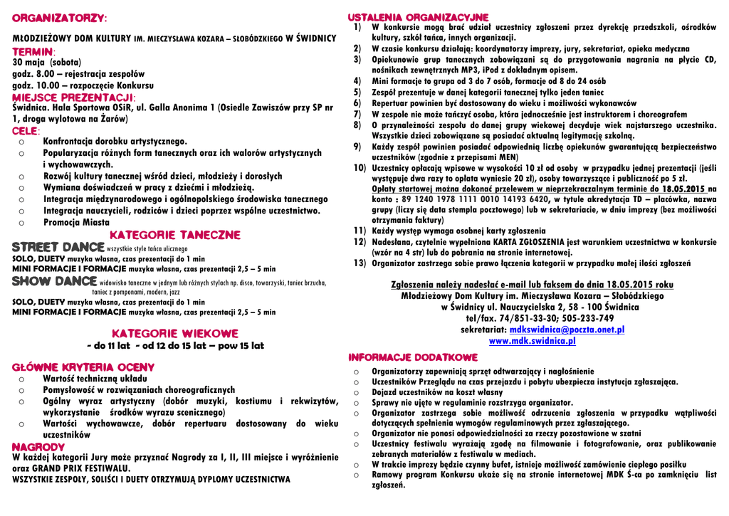 ORGANIZATORZY: MŁODZIEŻOWY DOM KULTURY IM. MIECZYSŁAWA KOZARA – SŁOBÓDZKIEGO W ŚWIDNICY TERMIN: 30 maja (sobota) godz. 8.00 – rejestracja zespołów godz. 10.00 – rozpoczęcie Konkursu MIEJSCE PREZENTACJI: Świdnica. Hala Sportowa OSiR, ul. Galla Anonima 1 (Osiedle Zawiszów przy SP nr 1, droga wylotowa na Żarów) CELE: o Konfrontacja dorobku artystycznego. o Popularyzacja różnych form tanecznych oraz ich walorów artystycznych i wychowawczych. o Rozwój kultury tanecznej wśród dzieci, młodzieży i dorosłych o Wymiana doświadczeń w pracy z dziećmi i młodzieżą. o Integracja międzynarodowego i ogólnopolskiego środowiska tanecznego o Integracja nauczycieli, rodziców i dzieci poprzez wspólne uczestnictwo. o Promocja Miasta KATEGORIE TANECZNE STREET DANCE wszystkie style tańca ulicznego SOLO, DUETY muzyka własna, czas prezentacji do 1 min MINI FORMACJE I FORMACJE muzyka własna, czas prezentacji 2,5 – 5 min SHOW DANCE widowisko taneczne w jednym lub różnych stylach np. disco, towarzyski, taniec brzucha, taniec z pomponami, modern, jazz SOLO, DUETY muzyka własna, czas prezentacji do 1 min MINI FORMACJE I FORMACJE muzyka własna, czas prezentacji 2,5 – 5 min KATEGORIE WIEKOWE - do 11 lat - od 12 do 15 lat – pow 15 lat GŁÓWNE KRYTERIA OCENY o Wartość techniczną układu o Pomysłowość w rozwiązaniach choreograficznych o Ogólny wyraz artystyczny (dobór muzyki, kostiumu i rekwizytów, wykorzystanie środków wyrazu scenicznego) o Wartości wychowawcze, dobór repertuaru dostosowany do wieku uczestników NAGRODY W każdej kategorii Jury może przyznać Nagrody za I, II, III miejsce i wyróżnienie oraz GRAND PRIX FESTIWALU. WSZYSTKIE ZESPOŁY, SOLIŚCI I DUETY OTRZYMUJĄ DYPLOMY UCZESTNICTWA USTALENIA ORGANIZACYJNE 1) W konkursie mogą brać udział uczestnicy zgłoszeni przez dyrekcję przedszkoli, ośrodków kultury, szkół tańca, innych organizacji. 2) W czasie konkursu działają: koordynatorzy imprezy, jury, sekretariat, opieka medyczna 3) Opiekunowie grup tanecznych zobowiązani są do przygotowania nagrania na płycie CD, nośnikach zewnętrznych MP3, iPod z dokładnym opisem. 4) Mini formacje to grupa od 3 do 7 osób, formacje od 8 do 24 osób 5) Zespół prezentuje w danej kategorii tanecznej tylko jeden taniec 6) Repertuar powinien być dostosowany do wieku i możliwości wykonawców 7) W zespole nie może tańczyć osoba, która jednocześnie jest instruktorem i choreografem 8) O przynależności zespołu do danej grupy wiekowej decyduje wiek najstarszego uczestnika. Wszystkie dzieci zobowiązane są posiadać aktualną legitymację szkolną. 9) Każdy zespół powinien posiadać odpowiednią liczbę opiekunów gwarantującą bezpieczeństwo uczestników (zgodnie z przepisami MEN) 10) Uczestnicy opłacają wpisowe w wysokości 10 zł od osoby w przypadku jednej prezentacji (jeśli występuje dwa razy to opłata wyniesie 20 zł), osoby towarzyszące i publiczność po 5 zł. Opłaty startowej można dokonać przelewem w nieprzekraczalnym terminie do 18.05.2015 na konto : 89 1240 1978 1111 0010 14193 6420, w tytule akredytacja TD – placówka, nazwa grupy (liczy się data stempla pocztowego) lub w sekretariacie, w dniu imprezy (bez możliwości otrzymania faktury) 11) Każdy występ wymaga osobnej karty zgłoszenia 12) Nadesłana, czytelnie wypełniona KARTA ZGŁOSZENIA jest warunkiem uczestnictwa w konkursie (wzór na 4 str) lub do pobrania na stronie internetowej. 13) Organizator zastrzega sobie prawo łączenia kategorii w przypadku małej ilości zgłoszeń Zgłoszenia należy nadesłać e-mail lub faksem do dnia 18.05.2015 roku Młodzieżowy Dom Kultury im. Mieczysława Kozara – Słobódzkiego w Świdnicy ul. Nauczycielska 2, 58 - 100 Świdnica tel/fax. 74/851-33-30; 505-233-749 sekretariat: [email protected] www.mdk.swidnica.pl INFORMACJE DODATKOWE o Organizatorzy zapewniają sprzęt odtwarzający i nagłośnienie o Uczestników Przeglądu na czas przejazdu i pobytu ubezpiecza instytucja zgłaszająca. o Dojazd uczestników na koszt własny o Sprawy nie ujęte w regulaminie rozstrzyga organizator. o Organizator zastrzega sobie możliwość odrzucenia zgłoszenia w przypadku wątpliwości dotyczących spełnienia wymogów regulaminowych przez zgłaszającego. o Organizator nie ponosi odpowiedzialności za rzeczy pozostawione w szatni o Uczestnicy festiwalu wyrażają zgodę na filmowanie i fotografowanie, oraz publikowanie zebranych materiałów z festiwalu w mediach. o W trakcie imprezy będzie czynny bufet, istnieje możliwość zamówienie ciepłego posiłku o Ramowy program Konkursu ukaże się na stronie internetowej MDK Ś-ca po zamknięciu list zgłoszeń. / jednostka delegująca/ data ………………….. KARTA ZGŁOSZENIA TANECZNY DEPTAK Dzień Street Dance - MDK Świdnica Nazwa grupy tanecznej /imię i nazwisko solisty/ imiona i nazwiska duetu TANECZNY DEPTAK Tytuł układu tanecznego Liczba uczestników, kategoria wiekowa, kategoria taneczna OGÓLNOPOLSKI KONKURS TANECZNY O PUCHAR PREZYDENTA MIASTA Czas trwania prezentacji Imię i nazwisko instruktora oraz choreografa ŚWIDNICA Telefon kontaktowy do kierownika zespołu 30 MAJA – DZIEŃ STREET DANCE 31 MAJA – DZIEŃ MAŻORETEK Potrzeby techniczne (wymienić) Imienna lista uczestników z datami urodzenia /w formie załącznika/ /Pieczątka i podpis dyrektora szkoły, placówki./ Rekwizyty •mażoretki – jeden lub dwa batony dla każdej z mażoretek Czas wykonywania programów •Formacje – układ na podium (wymiary 12x12m) min. 2.30 min. – max. 4.00 min .•Solo, duo/trio, miniformacje – min. 1.15 min – max. 1.30 min. .•Trenerzy są zobowiązani są do przygotowania nagrania na płycie CD, nośnikach zewnętrznych MP3, iPod z dokładnym opisem. Ocena i nagrody Kryteria ocen: • dobór repertuaru, - choreografia i kompozycja •technika tańca, - technika pracy z rekwizytem •podkład muzyczny •oprawa sceniczna i kostiumy •ogólny wyraz artystyczn