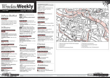 WrocławWeekly Free City Guide to Events, Music, Film, Theatre, Museum & More Issue #465 17.04.2015 - 23.04.2015 > get more online: www.WroclawWeekly.pl > [email protected] InFocus:ThisWeek Jazz nad Odrą 14-20.04.2015 “Jazz nad Odrą" is the biggest international jazz festival in Wrocław. For the complete program, please see: http:// www.jazznadodra.pl (PL/EN) InTheatres Współczesny (Contemporary) Theatre (ul. Rzeźnicza 12) Hopla, żyjemy! - Sat 20:15; Sun 18:15 Fragment nieistniejącego świata Tue & Wed 19:00 Tajemniczy ogród - Wed 19:15; Thu 18:15 Polski Theatre (ul. Zapolskiej 3) Burza - Thu 19:00 Polski Theatre / Kameralna (ul. Świdnicka 28) 20 najśmieszniejszych piosenek na świecie - Fri-Sun 19:00 Smycz -Wed & Thu 19:00 Polski Theatre / Świebodzki (pl. Orląt Lwowskich 20c) “Szkoła Błaznów" by Wrocław Mime Theatre - Fri 19:00 Courtney Love - Tue & Wed 18:00 Komedia Theatre (pl. Teatralny 4) Szalone Nożyczki - Fri 20:00 Rodzina Kerwoodów (Tom, Dick and Harry) - Sat 20:15; Sun 18:15 Zemsta - Mon 11:00 Psychoterapia Czyli Sex W Życiu Człowieka - Thu 20:30 Lalek (Puppet) Theatre (pl. Teatralny 4) Kids Krzywiryjek - Fri 10:00; Sat 15:00; Tue 10:00 Kids SAM - Fri 13:00; Sat 19:00; Sun 17:00; Tue 13:00 Kids Co krokodyl jada na obiad? - Thu 10:00 Wrocław Opera (ul. Świdnicka 35) “Napój miłosny (L’Elisir d’Amore)" by G. Donizetti - Fri 19:00 “Eugeniusz Oniegin" by P. Tchaikovsky - Sat 19:00 “Falstaff" by G. Verdi - Sun 17:00 Kids “Sid, wąż, który chciał śpiewać (Sid the Serpent Who Wanted to Sing)" by M. Fox - Tue 11:00, 13:00 “Łucja z Lammermooru (Lucia di Lammermoor)" by G. Donizetti - Wed 19:00 “Otello" by G. Verdi - Thu 19:00 CAPITOL Musical Theatre (ul. Piłsudskiego 72) Kocham cię. Ja ciebie też nie. Serge Gainsbourg - Fri 19:00 Jerry Springer The Opera - Sat 18:00; Sun 17:00 Concerts Friday 17.04 WROCŁAW PHILHARMONIC CONCERT HALL (ul. Piłsudskiego 19) NFM Symphonic Orchestra (Classical: 60/40/25PLN) - 19:00 STARY KLASZTOR (ul. Purkyniego 1) The Exploited (Punk: 70/60PLN) - 20:00 ALIBI (ul. Grunwaldzka 67) Indios Bravos (40/30PLN) - 20:00 Saturday 18.04 WROCŁAW PHILHARMONIA CONCERT HALL Wrocław Baroque Orchestra Leopoldinum (Classical: 50/30/20PLN) - 18:00 FIRLEJ (ul. Grabiszyńska 56) Adams (JP) (85PLN) - 19:00 KLUB ANIMA (ul. Pilczycka 47) Katarzyna Groniec - “Zoo" (60/50PLN) - 19:00 STARY KLASZTOR Sorry Boys (50/40/35PLN) - 20:00 OD ZMIERZCHU DO ŚWITU (“From Dusk Till Dawn" / ul. Krupnicza 15) TSA (Rock: 55/45PLN) - 20:00 ALIVE (ul. Kolejowa 12) Enclose & Juan Carlos Cano (Grunge/ Hard Rock: 25/20PLN) - 21:00 Sunday 19.04 STARY KLASZTOR Kasia Stankiewicz (35PLN) - 20:30 Monday 20.04 STARY KLASZTOR Myslovitz (5045//40/35PLN) - 20:00 Tuesday 21.04 4 pl. Jana Pawła II FIRLEJ Retox, Lunapar, So Slow (30PLN) - 20:00 STARY KLASZTOR Lari Lu (30PLN) - 20:00 2 8 Wednesday 22.04 WCK (Wystawowa 1) Imany (World: 150/125/100PLN) - 20:00 STARY KLASZTOR Joao De Sousa & Fado Polaco (World: 50/40/30/20PLN) - 20:00 1 Thursday 23.04 7 WROCŁAW PHILHARMONIC CONCERT HALL Konstanty A. Kulka & Tomasz Strahl (Classical: 50/30/20PLN) - 19:00 STARY KLASZTOR Endy Yden, Notopop (30PLN) - 20:00 Cinemas WRO Art Center (Widok 7) Kids “A w niedzielę lecimy na Księ- 3 1. 2. 3. 4. 5 6 Mleczarnia Café & Hostel, The White Stork Synagogue Galeria Entropia Stary Klasztor Współczesny (Contemporary) Theatre 5. 6. 7. 8. Polski Theatre: Scena Kameralna Lalek (Puppet) Theatre & Komedia Theatre Wrocław Opera Tourist Information Centre "The Meeting Point" życ!" - Sun 12:30 /Free Admission Kino Nowe Horyzonty (ul. Kazimierza Wielkiego 19a-21) For the current program, please see http://www.kinonh.pl/ DCF (ul. Piłsudskiego 64/a) http://dcf.wroclaw.pl/ 9 HELIOS http://www.heliosnet.pl MULTIKINO http://multikino.pl/ Exhibitions Galeria Arttrakt (ul. Ofiar Oświęcimskich 1/1) > Adam Martyniak “Ustrój Ruderalny" (10.04.15-06.05.15) Contact: Wrocław Tourist Information Center, Rynek 14, 50-101 Wrocław, tel. (+48 71) 344 31 11 ©WrocławWeekly 2015, Some Rights Reserved CC [BY-NC-ND] // [email protected]