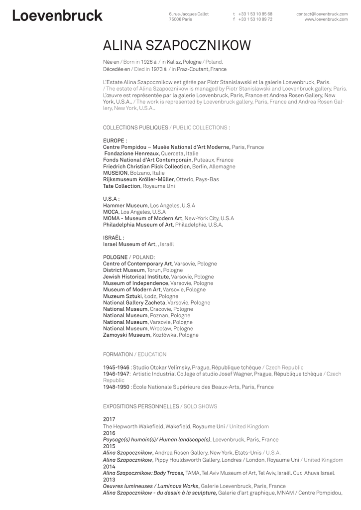 6, rue Jacques Callot 75006 Paris t +33 1 53 10 85 68 f +33 1 53 10 89 72 [email protected] www.loevenbruck.com ALINA SZAPOCZNIKOW Née en / Born in 1926 à / in Kalisz, Pologne / Poland. Décedée en / Died in 1973 à / in Praz-Coutant, France L’Estate Alina Szapocznikow est gérée par Piotr Stanislawski et la galerie Loevenbruck, Paris. / The estate of Alina Szapocznikow is managed by Piotr Stanislawski and Loevenbruck gallery, Paris. L’œuvre est représentée par la galerie Loevenbruck, Paris, France et Andrea Rosen Gallery, New York, U.S.A.. / The work is represented by Loevenbruck gallery, Paris, France and Andrea Rosen Gallery, New York, U.S.A.. COLLECTIONS PUBLIQUES / PUBLIC COLLECTIONS : EUROPE : Centre Pompidou – Musée National d’Art Moderne, Paris, France Fondazione Henreaux, Querceta, Italie Fonds National d’Art Contemporain, Puteaux, France Friedrich Christian Flick Collection, Berlin, Allemagne MUSEION, Bolzano, Italie Rijksmuseum Kröller-Müller, Otterlo, Pays-Bas Tate Collection, Royaume Uni U.S.A : Hammer Museum, Los Angeles, U.S.A MOCA, Los Angeles, U.S.A MOMA - Museum of Modern Art, New-York City, U.S.A Philadelphia Museum of Art, Philadelphie, U.S.A. ISRAËL : Israel Museum of Art, , Israël POLOGNE / POLAND: Centre of Contemporary Art, Varsovie, Pologne District Museum, Torun, Pologne Jewish Historical Institute, Varsovie, Pologne Museum of Independence, Varsovie, Pologne Museum of Modern Art, Varsovie, Pologne Muzeum Sztuki, Łodz, Pologne National Gallery Zacheta, Varsovie, Pologne National Museum, Cracovie, Pologne National Museum, Poznan, Pologne National Museum, Varsovie, Pologne National Museum, Wrocław, Pologne Zamoyski Museum, Kozłówka, Pologne FORMATION / EDUCATION 1945-1946 : Studio Otokar Velímsky, Prague, République tchèque / Czech Republic 1946-1947: Artistic Industrial College of studio Josef Wagner, Prague, République tchèque / Czech Republic 1948-1950 : École Nationale Supérieure des Beaux-Arts, Paris, France EXPOSITIONS PERSONNELLES / SOLO SHOWS 2017 The Hepworth Wakefield, Wakefield, Royaume Uni / United Kingdom 2016 Paysage(s) humain(s)/ Human landscape(s), Loevenbruck, Paris, France 2015 Alina Szapocznikow, Andrea Rosen Gallery, New York, Etats-Unis / U.S.A. Alina Szapocznikow, Pippy Houldsworth Gallery, Londres / London, Royaume Uni / United Kingdom 2014 Alina Szapocznikow: Body Traces, TAMA, Tel Aviv Museum of Art, Tel Aviv, Israël. Cur. Ahuva Israel. 2013 Oeuvres lumineuses / Luminous Works, Galerie Loevenbruck, Paris, France Alina Szapocznikow - du dessin à la sculpture, Galerie d’art graphique, MNAM / Centre Pompidou, 6, rue Jacques Callot 75006 Paris t +33 1 53 10 85 68 f +33 1 53 10 89 72 [email protected] www.loevenbruck.com Paris, France 2012 Alina Szapocznikow : Sculpture Undone, 1955-1972, Museum Of Modern Art, New York, Etats-Unis / U.S.A. Alina Szapocznikow : Sculpture Undone, 1955-1972, Wexner Center for the Arts, Colombus, Ohio, Etats-Unis / U.S.A. Alina Szapocznikow : Sculpture Undone, 1955-1972, Hammer Museum, Los Angeles, Etats-Unis / U.S.A. 2011 Alina Szapocznikow : Sculpture Undone, 1955-1972, WIELS Centre d’Art Contemporain, Bruxelles / Brussels, Belgique / Belgium Alina Szapocznikow (Dessins), Galerie Loevenbruck, Paris, France 2010 Alina Szapocznikow, My American Dream, Broadway Gallery 1602, New York, Etats-Unis / U.S.A. Alina Szapocznikow, Kunstparterre, Munich, Allemagne / Deutschland 2009 Alina Szapocznikow, Galerie Isabella Czarnowska, Berlin, Allemagne / Deutschland 2007 Alina Szapocznikow, Broadway Gallery 1602, New York, Etats-Unis / U.S.A. Alina Szapocznikow, Galerie Gisela Capitain, Cologne, Allemagne / Deutschland 2000 Alina Szapocznikow, Czeskie Muzeum Sztuki, Prague, République Tchèque / Czech Republic 1999 Alina Szapocznikow. 1926-1973, Muzeum Sztuki, Łódž, Pologne / Poland Alina Szapocznikow. 1926-1973, Muzeum Narodowe, Wrocław, Pologne / Poland 1998 Alina Szapocznikow. 1926-1973, Zacheta-Narodowa Galeria Sztuki, Varsovie / Warsaw, Pologne / Poland Alina Szapocznikow. 1926-1973, Muzeum Narodowe, Cracovie / Cracow, Pologne / Poland 1990 Alina Szapocznikow. 1926-1973, Biblioteka Polska, Paris, France 1989 Alina Szapocznikow. 1926-1973, Galeria KUL, Lublin, Pologne / Poland 1978 Alina Szapocznikow, Muzeum Okregów Ziemi Kaliskiej, Kalisz, Pologne / Poland Alina Szapocznikow, Galeria Foto Medium Art, Wrocław, Pologne / Poland Alina Szapocznikow, Salon Krytyków, BWA, Lublin, Pologne / Poland 1977 Alina Szapocznikow, Konsthall, Lund, Suède / Sweden Alina Szapocznikow, Salon Wystawowy, BWA, Białystok, Pologne / Poland 1976 Alina Szapocznikow, Salon BWA, Poznan, Pologne / Poland Alina Szapocznikow, Pałac Sztuki i Galeria Pryzmat,Cracovie / Cracow, Pologne / Poland Salon BWA, Bydgoszcz, Pologne / Poland Alina Szapocznikow, Muzem Narodowe, Dantzig / Gdansk, Pologne / Poland 1975 Retrospektive, Muzeum Sztuki, Lódž, Muzeum Narodowe, Varsovie, / Warsaw, Pologne / Poland Alina Szapocznikow, Dessins, Galerie Aurore, Genève, Suisse / Switzerland 1974 Alina Szapocznikow, Rysunki, Galeria Współczesna, Varsovie / Warsaw, Pologne / Poland 1973 Alina Szapocznikow, 19626 - 1973. Tumeurs, Herbier, Musée d´Art Moderne de la Ville de Paris, Paris, France 1971 Instant et chose, Galerie Aurore, Genève, Suisse / Switzerland 1970 Envahissement de Tumeurs, Stedelijk Museum, Amsterdam, Pays-Bas / Netherlands Nr. 1 cycle of Envahissement de Tumeurs, Artist studio, Malakoff, France 1969 Alina Szapocznikow, Port-Barcares, France 1968 Alina Szapocznikow, Galeria Cogeime, Bruxelles / Brussels, Belgique / Belgium 1967 Alina Szapocznikow, Galerie Florence Huston Brown, Paris, France 1961 Alina Szapocznikow, Galeria Kordegarda, Varsovie / Warsaw, Pologne/ Poland Alina Szapocznikow, Galeriji Likovnih Umjetnosti, Rijeka (avec / with Roman Ciešlewski), Pologne / Poland 1960 Alina Szapocznikow, BWA Arsenal, Poznan, Pologne / Poland 6, rue Jacques Callot 75006 Paris t +33 1 53 10 85 68 f +33 1 53 10 89 72