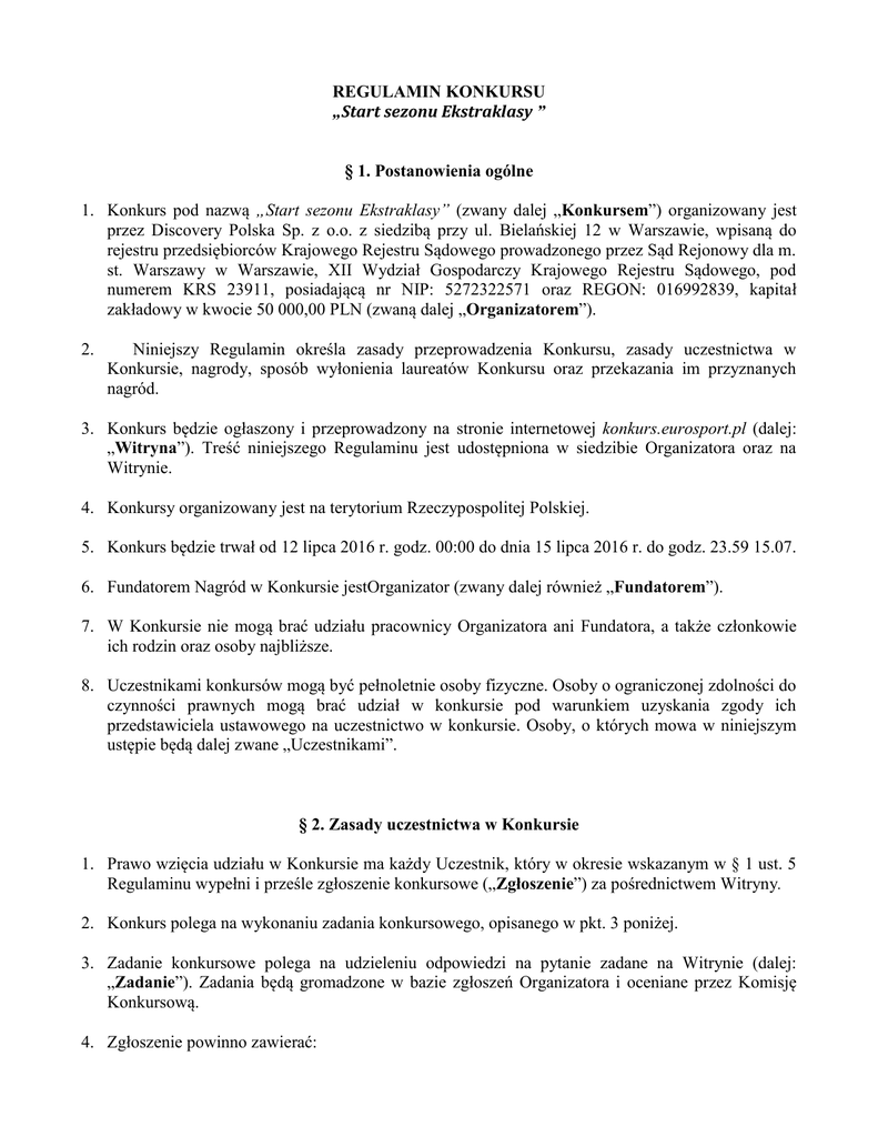 REGULAMIN KONKURSU „Start sezonu Ekstraklasy ” § 1. Postanowienia ogólne 1. Konkurs pod nazwą „Start sezonu Ekstraklasy” (zwany dalej „Konkursem”) organizowany jest przez Discovery Polska Sp. z o.o. z siedzibą przy ul. Bielańskiej 12 w Warszawie, wpisaną do rejestru przedsiębiorców Krajowego Rejestru Sądowego prowadzonego przez Sąd Rejonowy dla m. st. Warszawy w Warszawie, XII Wydział Gospodarczy Krajowego Rejestru Sądowego, pod numerem KRS 23911, posiadającą nr NIP: 5272322571 oraz REGON: 016992839, kapitał zakładowy w kwocie 50 000,00 PLN (zwaną dalej „Organizatorem”). 2. Niniejszy Regulamin określa zasady przeprowadzenia Konkursu, zasady uczestnictwa w Konkursie, nagrody, sposób wyłonienia laureatów Konkursu oraz przekazania im przyznanych nagród. 3. Konkurs będzie ogłaszony i przeprowadzony na stronie internetowej konkurs.eurosport.pl (dalej: „Witryna”). Treść niniejszego Regulaminu jest udostępniona w siedzibie Organizatora oraz na Witrynie. 4. Konkursy organizowany jest na terytorium Rzeczypospolitej Polskiej. 5. Konkurs będzie trwał od 12 lipca 2016 r. godz. 00:00 do dnia 15 lipca 2016 r. do godz. 23.59 15.07. 6. Fundatorem Nagród w Konkursie jestOrganizator (zwany dalej również „Fundatorem”). 7. W Konkursie nie mogą brać udziału pracownicy Organizatora ani Fundatora, a także członkowie ich rodzin oraz osoby najbliższe. 8. Uczestnikami konkursów mogą być pełnoletnie osoby fizyczne. Osoby o ograniczonej zdolności do czynności prawnych mogą brać udział w konkursie pod warunkiem uzyskania zgody ich przedstawiciela ustawowego na uczestnictwo w konkursie. Osoby, o których mowa w niniejszym ustępie będą dalej zwane „Uczestnikami”. § 2. Zasady uczestnictwa w Konkursie 1. Prawo wzięcia udziału w Konkursie ma każdy Uczestnik, który w okresie wskazanym w § 1 ust. 5 Regulaminu wypełni i prześle zgłoszenie konkursowe („Zgłoszenie”) za pośrednictwem Witryny. 2. Konkurs polega na wykonaniu zadania konkursowego, opisanego w pkt. 3 poniżej. 3. Zadanie konkursowe polega na udzieleniu odpowiedzi na pytanie zadane na Witrynie (dalej: „Zadanie”). Zadania będą gromadzone w bazie zgłoszeń Organizatora i oceniane przez Komisję Konkursową. 4. Zgłoszenie powinno zawierać: a) b) c) d) Imię i nazwisko Uczestnika, Adres e-mail Uczestnika, Telefon kontaktowy Uczestnika, Oświadczenie Uczestnika wyrażające zgodę na przetwarzanie jego danych osobowych o następującej treści: „Wyrażam zgodę na przetwarzanie moich danych osobowych na potrzeby niniejszego Konkursu przez Discovery Polska Sp. z o.o. z siedzibą przy ul. Bielańskiej 12 w Warszawie..” 5. Akceptując Regulamin Konkursu Uczestnik udziela Organizatorowi nieodpłatnej, niewyłącznej, nieograniczonej w czasie i terytorialnie licencji, z prawem do udzielania sublicencji, na nadawanie, reemitowanie i publiczne udostępnienie Zadania w telewizji i w Internecie w taki sposób, aby każdy mógł mieć do niego dostęp w miejscu i w czasie przez siebie wybranym oraz na wykorzystywanie Zadania dla celów reklamy i promocji Organizatora, jego produktów i usług z możliwością wprowadzania zmian w tekście przy jednoczesnym zachowaniu oryginalnego znaczenia Zadania. 6. Jeden Uczestnik może przesłać tylko jedno Zgłoszenie. 7. Prawidłowość Zgłoszeń ocenia 3-osobowa komisja konkursowa, składająca się z przedstawicieli Organizatora i Fundatora („Komisja Konkursowa”). Komisja Konkursowa odrzuca Zgłoszenie: a) pochodzące od osoby nie spełniającej warunków do bycia Uczestnikiem, b) pochodzące od osoby, o której mowa w § 1 ust. 8 Regulaminu, c) niepełne, nieczytelne, niekompletne, zawierające dane nieprawdziwe lub błędne, d) zawierające treści nieprzyzwoite, obraźliwe lub z innych względów niepożądane przez Organizatora, niezgodne z prawem lub nie odpowiadające wymogom dobrego smaku, e) w ramach którego odmówiono zaakceptowania lub nie zaakceptowano Regulaminu. 8. Uczestnik może dobrowolnie zrezygnować z udziału w Konkursie w każdym czasie, składając Organizatorowi oświadczenie o rezygnacji przesyłając pisemną rezygnację na adres Organizatora. Za datę rezygnacji uważa się dzień otrzymania przez Uczestnika pocztą elektroniczną wiadomości z potwierdzeniem przyjęcia rezygnacji. Wskutek rezygnacji Uczestnika z udziału w Konkursie, najpóźniej w dniu rezygnacji Uczestnika jego Zgłoszenie zostaje usunięte z bazy i wykluczone z Konkursu. Uczestnik, który zrezygnował z udziału w Konkursie, może ponownie do niego przystąpić, dokonując Zgłoszenia, na warunkach opisanych w niniejszym Regulaminie. 9. Uczestnik może zażądać usunięcia swoich danych osobowych z bazy danych Organizatora, stworzonej na potrzeby przeprowadzenia Konkursu. Żądanie to jest równoznaczne z rezygnacją z udziału w Konkursie. 10. Przedstawiając Zadanie do Konkursu, Uczestnik oświadcza jednocześnie, iż przysługują mu do niego wszelkie prawa, w szczególności prawa autorskie, a także że nie narusza ono jakichkolwiek dóbr osobistych osób trzecich. 11. Uczestnik zwolni Organizatora z odpowiedzialności oraz naprawi wszelkie szkody poniesione przez Organizatora, związane z jakimikolwiek naruszeniami prawa, w tym naruszeniami praw autorskich osób trzecich, zaistniałymi w związku z przedstawieniem przez Uczestnika Zadania i umieszczeniem go w Witrynie. § 3. Przyznanie nagród w Konkursie 1. Organizator przewiduje przyznanie w Konkursie nagród: a) Nagroda Pierwszego Stopnia: Koszulka Klubowa Wisły Płock z autografem piłkarzy o wartości 150 zł (słownie: sto pięćdziesiąt złotych) b) Nagroda Drugiego Stopnia: Szalik Klubowy Wisły Płock o wartości 30 zł (słownie: trzydzieści złotych) c) Nagroda Trzeciego Stopnia: Czapka Wisły Płock o wartości 20 zł (słownie: dwadzieści złotych) 2. Komisja Konkursowa będzie oceniała wszystkie nadesłane Zgłoszenias. Spośród autorów Zadań wybranych 