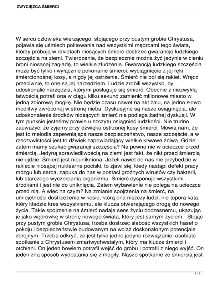 ZWYCIĘZCA ŚMIERCI W sercu człowieka wierzącego, stojącego przy pustym grobie Chrystusa, pojawia się uśmiech politowania nad wszystkimi mędrcami tego świata, którzy próbują w rakietach niosących śmierć dostrzec gwarancję ludzkiego szczęścia na ziemi. Twierdzenie, że bezpiecznie można żyć jedynie w cieniu broni niosącej zagładę, to wielkie złudzenie. Gwarancją ludzkiego szczęścia może być tylko i wyłącznie pokonanie śmierci, wyciągnięcie z jej ręki śmiercionośnej kosy, a nigdy jej ostrzenie. Śmierć nie boi się rakiet. Wręcz przeciwnie, to one są jej narzędziem. Ludzie zrobili wszystko, by udoskonalić narzędzia, którymi posługuje się śmierć. Obecnie z niezwykłą łatwością potrafi ona w ciągu kilku sekund zamienić milionowe miasto w jedną zbiorową mogiłę. Nie będzie czasu nawet na akt żalu, na jedno słowo modlitwy zwróconej w stronę nieba. Dyskusyjne są nasze osiągnięcia, ale udoskonalenie środków niosących śmierć nie podlega żadnej dyskusji. W tym punkcie jesteśmy prawie u szczytu osiągnięć ludzkości. Nie trudno zauważyć, że żyjemy przy dźwięku ostrzonej kosy śmierci. Mówią nam, że jest to melodia zapewniająca nasze bezpieczeństwo, nasze szczęście, a w rzeczywistości jest to dźwięk zapowiadający wielkie krwawe żniwa. Gdzie zatem mamy szukać gwarancji szczęścia? Na pewno nie w ucieczce przed śmiercią. Jedyną sprawiedliwością na ziemi jest fakt, że nikt przed śmiercią nie ujdzie. Śmierć jest nieunikniona. Jeżeli nawet do nas nie przybędzie w rakiecie niosącej nuklearne pociski, to zjawi się, kiedy nastąpi defekt pracy mózgu lub serca, zapuka do nas w postaci groźnych wirusów czy bakterii, lub starczego wyczerpania organizmu. Śmierć dysponuje wszystkimi środkami i jest nie do uniknięcia. Zatem wybawienie nie polega na ucieczce przed nią. A więc na czym? Na zmianie spojrzenia na śmierć, na umiejętności dostrzeżenia w kosie, którą ona niszczy ludzi, nie topora kata, który kładzie kres wszystkiemu, ale klucza otwierającego drogę do nowego życia. Takie spojrzenie na śmierć nadaje sens życiu doczesnemu, ukazując je jako wędrówkę w stronę nowego świata, który jest samym życiem. Stojąc przy pustym grobie Chrystusa, trzeba dostrzec słabość wszystkich haseł o pokoju i bezpieczeństwie budowanym na wciąż doskonalonym potencjale zbrojnym. Trzeba odkryć, że jest tylko jedno jedyne rozwiązanie: osobiste spotkanie z Chrystusem zmartwychwstałym, który ma klucze śmierci i otchłani. On jeden bowiem potrafił wejść do grobu i potrafił z niego wyjść. On jeden zna sposób wydostania się z mogiły. Nasze spotkanie ze śmiercią jest 1/2 ZWYCIĘZCA ŚMIERCI nieuniknione, ale jeżeli pójdziemy na jej spotkanie z Chrystusem, nie stracimy w niej swej tożsamości. Śmierć będzie tylko bramą, przejściem w nieutracalne życie, które rozpocznie się dopiero po niej. Jest rzeczą zdumiewającą, że ludzkość, bezradna wobec śmierci, nie gromadzi się wokół jedynego Człowieka, który odniósł nad nią zwycięstwo. To znak jakiejś wielkiej ślepoty ducha. Miliony ludzi poświęca życie na doskonalenie narzędzi śmierci, a jedynie nieliczni szukają Tego, kto jest w stanie od niej wybawić. Błogosławiony, kto przejrzał i dostrzegł Zwycięzcę śmierci, piekła i szatana. Spotkanie z Nim dokonuje się na płaszczyźnie wiary. Św. Tomasz Apostoł nie chciał uwierzyć, że Jezus pokonał śmierć. Jezus mu jasno powiedział: „Błogosławieni, którzy nie widzieli, a uwierzyli” /J 20, 29/. 2/2