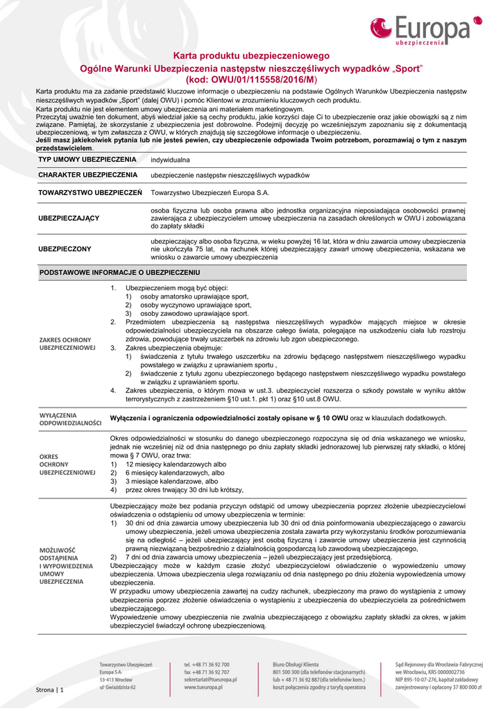 Karta produktu ubezpieczeniowego Ogólne Warunki Ubezpieczenia następstw nieszczęśliwych wypadków „Sport” (kod: OWU/01/115558/2016/M) Karta produktu ma za zadanie przedstawić kluczowe informacje o ubezpieczeniu na podstawie Ogólnych Warunków Ubezpieczenia następstw nieszczęśliwych wypadków „Sport” (dalej OWU) i pomóc Klientowi w zrozumieniu kluczowych cech produktu. Karta produktu nie jest elementem umowy ubezpieczenia ani materiałem marketingowym. Przeczytaj uważnie ten dokument, abyś wiedział jakie są cechy produktu, jakie korzyści daje Ci to ubezpieczenie oraz jakie obowiązki są z nim związane. Pamiętaj, że skorzystanie z ubezpieczenia jest dobrowolne. Podejmij decyzję po wcześniejszym zapoznaniu się z dokumentacją ubezpieczeniową, w tym zwłaszcza z OWU, w których znajdują się szczegółowe informacje o ubezpieczeniu. Jeśli masz jakiekolwiek pytania lub nie jesteś pewien, czy ubezpieczenie odpowiada Twoim potrzebom, porozmawiaj o tym z naszym przedstawicielem. TYP UMOWY UBEZPIECZENIA indywidualna CHARAKTER UBEZPIECZENIA ubezpieczenie następstw nieszczęśliwych wypadków TOWARZYSTWO UBEZPIECZEŃ Towarzystwo Ubezpieczeń Europa S.A. UBEZPIECZAJĄCY osoba fizyczna lub osoba prawna albo jednostka organizacyjna nieposiadająca osobowości prawnej zawierająca z ubezpieczycielem umowę ubezpieczenia na zasadach określonych w OWU i zobowiązana do zapłaty składki UBEZPIECZONY ubezpieczający albo osoba fizyczna, w wieku powyżej 16 lat, która w dniu zawarcia umowy ubezpieczenia nie ukończyła 75 lat, na rachunek której ubezpieczający zawarł umowę ubezpieczenia, wskazana we wniosku o zawarcie umowy ubezpieczenia PODSTAWOWE INFORMACJE O UBEZPIECZENIU 1. 2. ZAKRES OCHRONY UBEZPIECZENIOWEJ 3. 4. Ubezpieczeniem mogą być objęci: 1) osoby amatorsko uprawiające sport, 2) osoby wyczynowo uprawiające sport, 3) osoby zawodowo uprawiające sport. Przedmiotem ubezpieczenia są następstwa nieszczęśliwych wypadków mających miejsce w okresie odpowiedzialności ubezpieczyciela na obszarze całego świata, polegające na uszkodzeniu ciała lub rozstroju zdrowia, powodujące trwały uszczerbek na zdrowiu lub zgon ubezpieczonego. Zakres ubezpieczenia obejmuje: 1) świadczenia z tytułu trwałego uszczerbku na zdrowiu będącego następstwem nieszczęśliwego wypadku powstałego w związku z uprawianiem sportu , 2) świadczenie z tytułu zgonu ubezpieczonego będącego następstwem nieszczęśliwego wypadku powstałego w związku z uprawianiem sportu. Zakres ubezpieczenia, o którym mowa w ust.3. ubezpieczyciel rozszerza o szkody powstałe w wyniku aktów terrorystycznych z zastrzeżeniem §10 ust.1. pkt 1) oraz §10 ust.8 OWU. WYŁĄCZENIA ODPOWIEDZIALNOŚCI Wyłączenia i ograniczenia odpowiedzialności zostały opisane w § 10 OWU oraz w klauzulach dodatkowych. OKRES OCHRONY UBEZPIECZENIOWEJ Okres odpowiedzialności w stosunku do danego ubezpieczonego rozpoczyna się od dnia wskazanego we wniosku, jednak nie wcześniej niż od dnia następnego po dniu zapłaty składki jednorazowej lub pierwszej raty składki, o której mowa § 7 OWU, oraz trwa: 1) 12 miesięcy kalendarzowych albo 2) 6 miesięcy kalendarzowych, albo 3) 3 miesiące kalendarzowe, albo 4) przez okres trwający 30 dni lub krótszy, MOŻLIWOŚĆ ODSTĄPIENIA I WYPOWIEDZENIA UMOWY UBEZPIECZENIA Ubezpieczający może bez podania przyczyn odstąpić od umowy ubezpieczenia poprzez złożenie ubezpieczycielowi oświadczenia o odstąpieniu od umowy ubezpieczenia w terminie: 1) 30 dni od dnia zawarcia umowy ubezpieczenia lub 30 dni od dnia poinformowania ubezpieczającego o zawarciu umowy ubezpieczenia, jeżeli umowa ubezpieczenia została zawarta przy wykorzystaniu środków porozumiewania się na odległość – jeżeli ubezpieczający jest osobą fizyczną i zawarcie umowy ubezpieczenia jest czynnością prawną niezwiązaną bezpośrednio z działalnością gospodarczą lub zawodową ubezpieczającego, 2) 7 dni od dnia zawarcia umowy ubezpieczenia – jeżeli ubezpieczający jest przedsiębiorcą. Ubezpieczający może w każdym czasie złożyć ubezpieczycielowi oświadczenie o wypowiedzeniu umowy ubezpieczenia. Umowa ubezpieczenia ulega rozwiązaniu od dnia następnego po dniu złożenia wypowiedzenia umowy ubezpieczenia. W przypadku umowy ubezpieczenia zawartej na cudzy rachunek, ubezpieczony ma prawo do wystąpienia z umowy ubezpieczenia poprzez złożenie oświadczenia o wystąpieniu z ubezpieczenia do ubezpieczyciela za pośrednictwem ubezpieczającego. Wypowiedzenie umowy ubezpieczenia nie zwalnia ubezpieczającego z obowiązku zapłaty składki za okres, w jakim ubezpieczyciel świadczył ochronę ubezpieczeniową. Strona | 1 SKŁADKI I TERMINY PŁATNOŚCI Składka naliczana jest jednorazowo z góry za cały okres odpowiedzialności i płatna jest jednorazowo, z zastrzeżeniem zdania następnego. W przypadku, gdy okres odpowiedzialności trwa 12 miesięcy, oraz wysokość naliczonej składki jednorazowej przekracza kwotę: 1) 200 zł, to ubezpieczyciel dopuszcza możliwość płatności składki, na wniosek ubezpieczającego, w dwóch ratach, 2) 500 zł, to ubezpieczyciel dopuszcza możliwość płatności składki, na wniosek ubezpieczającego, w czterech ratach. Wysokość składki lub jej rat oraz terminy ich płatności określone zostaną w polisie. Składka lub pierwsza rata składki powinna zostać zapłacona w dniu złożenia wniosku o zawarcie umowy ubezpieczenia, chyba że w polisie zostanie wskazany inny termin zapłaty składki. Do zapłaty składki lub rat składek zobowiązany jest ubezpieczający. ZGŁOSZENIE ROSZCZENIA Zgłoszenia roszczenia można dokonać drogą elektroniczną przez stronę internetową ubezpieczyciela, telefonicznie lub pisemnie. 1. Wysokość sumy ubezpieczenia ustala się na wniosek ubezpieczającego mając na uwadze, że minimalna wysokość sumy ubezpieczenia wynosi 10.000 zł, a maksymalna wysokość sumy ubezpieczenia, do jakiej dany ubez