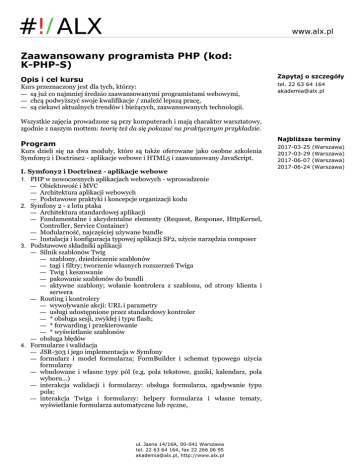 Zaawansowany programista PHP (kod: K-PHP-S) Zapytaj o szczegóły Opis i cel kursu Kurs przeznaczony jest dla tych, którzy: — są już co najmniej średnio zaawansowanymi programistami webowymi, — chcą podwyższyć swoje kwalifikacje / znaleźć lepszą pracę, — są ciekawi aktualnych trendów i bieżących, zaawansowanych technologii. tel. 22 63 64 164 [email protected] Wszystkie zajęcia prowadzone są przy komputerach i mają charakter warsztatowy, zgodnie z naszym mottem: teorię też da się pokazać na praktycznym przykładzie. Najbliższe terminy Program Kurs dzieli się na dwa moduły, które są także oferowane jako osobne szkolenia Symfony2 i Doctrine2 - aplikacje webowe i HTML5 i zaawansowany JavaScript. I. Symfony2 i Doctrine2 - aplikacje webowe 1. PHP w nowoczesnych aplikacjach webowych - wprowadzenie — Obiektowość i MVC — Architektura aplikacji webowych — Podstawowe praktyki i koncepcje organizacji kodu 2. Symfony 2 - z lotu ptaka — Architektura standardowej aplikacji — Fundamentalne i akcydentalne elementy (Request, Response, HttpKernel, Controller, Service Container) — Modularność, najczęściej używane bundle — Instalacja i konfiguracja typowej aplikacji SF2, użycie narzędzia composer 3. Podstawowe składniki aplikacji — Silnik szablonów Twig — szablony, dziedziczenie szablonów — tagi i filtry; tworzenie własnych rozszerzeń Twiga — Twig i keszowanie — pakowanie szablonów do bundli — aktywne szablony; wołanie kontrolera z szablonu, od strony klienta i serwera — Routing i kontrolery — wywoływanie akcji: URL i parametry — usługi udostępnione przez standardowy kontroler — * obsługa sesji, zwykłej i typu flash; — * forwarding i przekierowanie — * wyświetlanie szablonów — obsługa błędów 4. Formularze i walidacja — JSR-303 i jego implementacja w Symfony — formularz i model formularza; FormBuilder i schemat typowego użycia formularzy — wbudowane i własne typy pól (e.g. pola tekstowe, guziki, kalendarz, pola wyboru...) — interakcja walidacji i formularzy: obsługa formularza, zgadywanie typu pola; — interakcja Twiga i formularzy: helpery formularza i własne tematy, wyświetlanie formularza automatyczne lub ręczne, ul. Jasna 14/16A, 00-041 Warszawa tel. 22 63 64 164, fax 22 266 06 95 [email protected], http://www.alx.pl 2017-03-25 2017-03-29 2017-06-07 2017-06-24 (Warszawa) (Warszawa) (Warszawa) (Warszawa) — złożony model: formularze wbudowane, kolekcje formularzy wbudowanych, transformacje modelu; — dynamicznie modyfikowalny formularz — zabezpieczenie przeciwko CSRF 5. Uwierzytelnienie i autoryzacja — konfiguracja uwierzytelnienia - użytkownicy, grupy, role — dostęp do modułów aplikacji: zabezpieczanie ścieżek, metod, kontrolerów — dostęp do konkretnych danych — podstawowe strategie ACL (Access Control Lists) i Voters 6. Doctrine 2 — różne modele ORM i ich konsekwencje: Active Record kontra Transparent Persistence; — model pracy, wzorce projektowe (unit of work, identity map, repository / dao) — konfiguracja i integracja z własnym projektem — generowanie encji z bazy danych oraz bazy danych z encji — ręczne tworzenie i poprawianie mappingów: — encje, klucze główne (proste i złożone), generatory kluczy głównych — pola typu prostego i asocjacje: asoscjacje jedno- i dwukierunkowe, strona nadrzędna i podrzędna — podstawy pracy z encjami: dodawanie, usuwanie, modyfikacja danych w bazie — kwerendy: Doctrine Query Language, Criteria, repozytoria — Wydajność i optymalizacja - leniwe oraz gorliwe wczytywanie relacji, doczytywanie danych kwerendami i relacjami, strategie stronicowania, kaskadowanie operacji 7. Zagadnienia zaawansowane — rejestracja i wykorzystywanie serwisów, Service Container; alternatywne techniki: YAML, XML, kod — konfiguracja wprost i konfiguracja przez Container Extension — Expression Language — serwisy i ich zależności - dependency injection (constructor, setter, property) — serwisy w funkcji kontrolerów II. HTML5 i zaawansowany Javascript 1. Zaawansowany Javascript — błyskawiczne przypomnienie podstaw — zasięgowanie statyczne i dynamiczne, hoisting, — domknięcia leksykalne, — programowanie asynchroniczne, styl programowania z kontynuacjami (obiekty deferred, Ajax) — kwestie zasięgowania referencji this, praktyczne problemy — model obiektowy: — obiektowość bazująca na prototypach, — łańcuch prototypowo-konstruktorowy, — statyczność, — prywatność, — techniki używane we współczesnych bibliotekach — modularność 2. HTML5 - warstwa prezentacji — obiektowy model dokumentu, nowe elementy strukturalne i semantyczne (w tym nav, section, header, footer, article, aside), — podstawy multimediów: audio i video ul. Jasna 14/16A, 00-041 Warszawa tel. 22 63 64 164, fax 22 266 06 95 [email protected], http://www.alx.pl Zapytaj o szczegóły tel. 22 63 64 164 [email protected] Najbliższe terminy 2017-03-25 2017-03-29 2017-06-07 2017-06-24 (Warszawa) (Warszawa) (Warszawa) (Warszawa) — grafika rastrowa - canvas — tworzenie grafiki, rysowanie i kopiowanie kształtów, praca ze sprite'ami — przetwarzanie filmów w czasie rzeczywistym - canvas i video — canvas i kwestie bezpieczeństwa (stan tainted) — grafika wektorowa - SVG — różne sposoby osadzania SVG — model SVG: kształty, ścieżki, gradienty, wypełnienia, transformacje Zapytaj o szczegóły tel. 22 63 64 164 [email protected] afiniczne — łączenie grafiki rastrowej i wektorowej — CSS3 — użycie kompilatorów typu LESS — media query — zaawansowane selektory — efekty graficzne, przejścia i animacje 3. Biblioteki i techniki — natywny Drag and Drop — File API, obiekty BLOB — lokalna baza danych — Web Workers — Web Sockets — JQuery, Mustache - techniki podstawowe: — Ajax, serwisy JSON, — Szablony (logicless templating) — Underscore i Backbone, niskopoziomowe aplikacje MVC — Angula