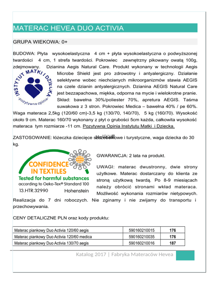 MATERAC HEVEA DUO ACTIVIA GRUPA WIEKOWA: 0+ BUDOWA: Płyta wysokoelastyczna 4 cm + płyta wysokoelastyczna o podwyższonej twardości 4 cm, 1 strefa twardości. Pokrowiec zdejmowany. zewnętrzny pikowany owatą 100g, Dzianina Aegis Natural Care. Produkt wykonany w technologii Aegis Microbe Shield jest pro zdrowotny i antyalergiczny. Działanie selektywne wobec niechcianych mikroorganizmów stawia AEGIS na czele dzianin antyalergicznych. Dzianina AEGIS Natural Care jest bezzapachowa, miękka, odporna na mycie i wielokrotne pranie. Skład: bawełna 30%/poliester 70%, apretura AEGIS. Taśma suwakowa z 3 stron. Pokrowiec Medica – bawełna 40% / pe 60%. Waga materaca 2,5kg (120/60 cm)-3,5 kg (130/70, 140/70), 5 kg (160/70). Wysokość około 9 cm. Materac 160/70 wykonany z płyt o grubości 5cm każda, całkowita wysokość materaca tym rozmiarze -11 cm. Pozytywna Opinia Instytutu Matki i Dziecka. ZASTOSOWANIE: łóżeczka dziecięce szczebelkowe i turystyczne, waga dziecka do 30 kg. GWARANCJA: 2 lata na produkt. UWAGI: materac dwustronny, dwie strony użytkowe. Materac dostarczany do klienta ze stroną użytkową twardą. Po 8-9 miesiącach należy obrócić stronami wkład materaca. Możliwość wykonania rozmiarów nietypowych. Realizacja do 7 dni roboczych. Nie zginamy i nie zwijamy do transportu i przechowywania. CENY DETALICZNE PLN oraz kody produktu: Materac piankowy Duo Activia 120/60 aegis Materac piankowy Duo Activia 120/60 medica Materac piankowy Duo Activia 130/70 aegis 590160210015 590160210035 590160210016 176 176 187 Katalog 2017 | Fabryka Materaców Hevea Materac piankowy Duo Activia 130/70 medica Materac piankowy Duo Activia 140/70 aegis Materac piankowy Duo Activia 140/70 medica Materac piankowy Duo Activia 160/70 aegis Materac piankowy Duo Activia 160/70 medica 590160210036 590160210023 590160210037 590160210042 590160210038 187 187 187 258 258 Katalog 2017 | Fabryka Materaców Hevea