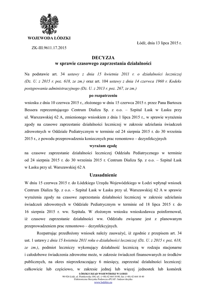 WOJEWODA ŁÓDZKI Łódź, dnia 13 lipca 2015 r. ZK-III.9611.17.2015 DECYZJA w sprawie czasowego zaprzestania działalności Na podstawie art. 34 ustawy z dnia 15 kwietnia 2011 r. o działalności leczniczej (Dz. U. z 2015 r. poz. 618, ze zm.) oraz art. 104 ustawy z dnia 14 czerwca 1960 r. Kodeks postępowania administracyjnego (Dz. U. z 2013 r. poz. 267, ze zm.) po rozpatrzeniu wniosku z dnia 10 czerwca 2015 r., złożonego w dniu 15 czerwca 2015 r. przez Pana Bartosza Bessera reprezentującego Centrum Dializa Sp. z o.o. – Szpital Łask w Łasku przy ul. Warszawskiej 62 A, zmienionego wnioskiem z dnia 1 lipca 2015 r., w sprawie wyrażenia zgody na czasowe zaprzestanie działalności leczniczej w zakresie udzielania świadczeń zdrowotnych w Oddziale Pediatrycznym w terminie od 24 sierpnia 2015 r. do 30 września 2015 r., z powodu przeprowadzenia koniecznych prac remontowo – dezynfekcyjnych wyrażam zgodę na czasowe zaprzestanie działalności leczniczej Oddziału Pediatrycznego w terminie od 24 sierpnia 2015 r. do 30 września 2015 r. Centrum Dializa Sp. z o.o. – Szpital Łask w Łasku przy ul. Warszawskiej 62 A Uzasadnienie W dniu 15 czerwca 2015 r. do Łódzkiego Urzędu Wojewódzkiego w Łodzi wpłynął wniosek Centrum Dializa Sp. z o.o. - Szpital Łask w Łasku przy ul. Warszawskiej 62 A w sprawie wyrażenia zgody na czasowe zaprzestania działalności leczniczej w zakresie udzielania świadczeń zdrowotnych w Oddziale Pediatrycznym w terminie od 18 lipca 2015 r. do 16 sierpnia 2015 r. ww. Szpitala. W złożonym wniosku wnioskodawca poinformował, iż czasowe zaprzestanie działalności ww. Oddziału związane jest z planowanym przeprowadzeniem prac remontowo – dezynfekcyjnych. Rozpatrując przedłożony wniosek należy zauważyć, iż zgodnie z przepisem art. 34 ust. 1 ustawy z dnia 15 kwietnia 2011 roku o działalności leczniczej (Dz. U. z 2015 r. poz. 618, ze zm.), podmiot leczniczy wykonujący działalność leczniczą w rodzaju stacjonarne i całodobowe świadczenia zdrowotne może, w zakresie świadczeń finansowanych ze środków publicznych, na okres nieprzekraczający 6 miesięcy, zaprzestać działalności leczniczej: całkowicie lub częściowo, w zakresie jednej lub więcej jednostek lub komórek ŁÓDZKI URZĄD WOJEWÓDZKI W ŁODZI 90-926 Łódź, ul. Piotrkowska 104, tel.: (+48) 42 664 10 00, fax: (+48) 42 664 10 40 Elektroniczna Skrzynka Podawcza ePUAP: /lodzuw/skrytka www.lodzkie.eu organizacyjnych przedsiębiorstwa tego podmiotu związanych bezpośrednio z udzielaniem tych świadczeń. Na podstawie art. 34 ust. 3 i 5 cytowanej ustawy o działalności leczniczej, kierownik podmiotu leczniczego występuje do wojewody z wnioskiem o udzielenie zgody, zawierającym określenie przyczyny, proponowany okres oraz zakres zaprzestania działalności. Czasowe zaprzestanie działalności wymaga zgody wojewody, stosownie do treści zapisu art. 34 ust. 2 ww. ustawy. Jednocześnie, wojewoda przed wyrażeniem zgody zasięga opinii dyrektora właściwego oddziału wojewódzkiego Narodowego Funduszu Zdrowia, zgodnie z przepisem art. 34 ust. 6 cytowanej ustawy o działalności leczniczej. Wojewoda wydaje zgodę albo odmawia jej wydania, w drodze decyzji administracyjnej, w terminie 30 dni od dnia złożenia wniosku, stosownie do treści art. 34 ust. 7 cytowanej ustawy. Mając na względzie powyższe przepisy prawa, w ramach wszczętego postępowania Wojewoda Łódzki zasięgnął opinii Dyrektora Łódzkiego Oddziału Wojewódzkiego Narodowego Funduszu Zdrowia w Łodzi. Ponadto Wojewoda zasięgnął opinii Konsultanta Wojewódzkiego w dziedzinie Pediatrii. Łódzki Oddział Wojewódzki Narodowego Funduszu Zdrowia pismem z 29 czerwca 2015 r., znak: WŚOZ-I.401.32.2015 negatywnie zaopiniował wniosek Szpitala. W przedłożonej opinii uzasadnił, że przedmiotowa decyzja wynika z faktu, iż w podobnym czasie zamknięte będą, z powodu remontów, oddziały pediatryczne w Zduńskowolskim Szpitalu Powiatowym Sp. z o.o. w Zduńskiej Woli (w terminie: 1 – 24 sierpnia 2015 roku) oraz w Szpitalu Wojewódzkim im. Jana Pawła II w Bełchatowie (w terminie: 1 - 16 sierpnia 2015 roku). Wymienione placówki sąsiadują bezpośrednio ze Szpitalem w Łasku. Ponadto w województwie łódzkim występują duże nadwykonania kontraktów w zakresie pediatrii. Z wymienionych powodów dostęp do leczenia dzieci w oddziałach pediatrycznych, na terenie województwa łódzkiego, może zostać znacznie ograniczony. Z uwagi na powyższe ŁOW NFZ zaproponował rozważyć inny termin przeprowadzenia prac remontowo-dezynfekcyjnych. W dniu 30 czerwca 2015 r. Dyrektor Wydziału Bezpieczeństwa i Zarządzania Kryzysowego Łódzkiego Urzędu Wojewódzkiego w Łodzi, działając z upoważnienia Wojewody Łódzkiego wystąpił do Centrum Dializa Sp. z o.o. – Szpital Łask w Łasku z prośbą o ustosunkowanie się do opinii ŁOW NFZ oraz o rozważenie możliwości zmiany terminu planowanego czasowego zaprzestania działalności Oddziału Pediatrycznego na inny – nie kolidujący z ww. podmiotami leczniczymi w Bełchatowie i Zduńskiej Woli. W odpowiedzi pismem z dnia 1 lipca 2015 r. Pan Bartosz Besser reprezentujący Centrum Dializa Sp. z o.o. – Szpital Łask w Łasku wskazał nowy termin planowanego czasowego zaprzestania działalności Oddziału Pediatrycznego w okresie od 24 sierpnia 2015 r. do 30 września 2015 r., występując jednocześnie z prośbą o wyrażenie na niego zgody. Uwzględniając powyższe, Dyrektor Wydziału Bezpieczeństwa i Zarządzania Kryzysowego ŁUW w Łodzi pismami z dnia 2 lipca 2015 r., znak: ZK-III.9611.17.2015, informując, że wnioskodawca zmienił termin planowanego czasowego zamknięcia ww. Oddziału wystąpił do Łódzkiego Oddziału Wojewódzkiego Narodowego Funduszu Zdrowia oraz do Konsultanta Wojewódzkiego w dziedzinie pediatrii o ponowne zajęcie stanowiska. Pismem z dnia 7 lipca 2015 r. znak: WŚOZ-I.401.34.2015 Łódzki Oddział Wojewódzki Narodowego Fundusz