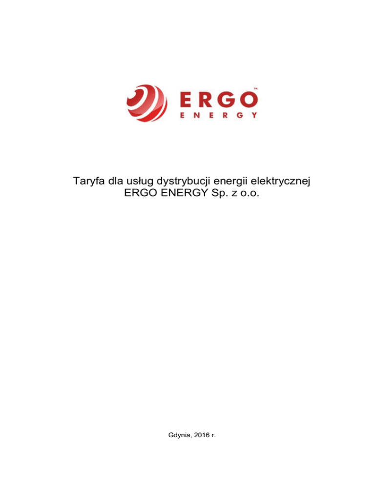 Taryfa dla usług dystrybucji energii elektrycznej ERGO ENERGY Sp. z o.o. Gdynia, 2016 r. SPIS TREŚCI 1. Informacje o taryfie ………………………………………………….…..………………. 3 2. Zasady rozliczeń za świadczone usługi dystrybucji …………….…………….…… 4 2.1. Zasady kwalifikacji odbiorców do grup taryfowych ..................................................... 4 2.2. Strefy czasowe stosowane w rozliczeniach z odbiorcami .......................................... 6 2.3. Okresy rozliczeniowe stosowane w rozliczeniach z odbiorcami i ogólne zasady rozliczeń ......................................................................................................... 6 2.4. Zasady korygowania wystawionych faktur ................................................................. 8 2.5. Zasady rozliczeń za energię elektryczną ................................................................... 8 3. Szczegółowe zasady rozliczeń usług dystrybucji …………………....……….…… 9 3.1. Opłaty za usługi dystrybucji energii elektrycznej ........................................................ 9 3.2. Moc umowna .............................................................................................................. 10 3.3. Rozliczenia z odbiorcami za ponadumowny pobór energii biernej ............................ 11 3.4. Bonifikaty za niedotrzymanie standardów jakościowych obsługi odbiorców i parametrów jakościowych energii ............................................................................ 13 4. Zasady ustalania opłat za przyłączanie podmiotów do sieci …………………..… 15 5. Opłaty za usługi wykonywane na dodatkowe zlecenie odbiorcy ……………..… 16 6. Opłaty za nielegalne pobieranie energii ……………………………………………… 17 7. Stawki opłat za usługi dystrybucji i stawki opłat abonamentowych 8. dla poszczególnych grup taryfowych ………………………………………………… 20 Ceny za energię elektryczną dla grupy taryfowej G …..…………………………… 20 Taryfa ERGO ENERGY Sp. z o.o. 2 1. Informacje o taryfie 1.1 Taryfa uwzględnia postanowienia: a) ustawy z dnia 10 kwietnia 1997 r. – Prawo energetyczne (Dz. U. z 2012 r., poz. 1059, z późn. zm.), zwanej dalej: „ustawą”; b) rozporządzenia Ministra Gospodarki z dnia 18 sierpnia 2011 r. w sprawie szczegółowych zasad kształtowania i kalkulacji taryf oraz rozliczeń w obrocie energią elektryczną (Dz. U. z 2013 r. poz. 1200), zwanego dalej: „rozporządzeniem taryfowym”; c) rozporządzenia Ministra Gospodarki z dnia 4 maja 2007 r. w sprawie szczegółowych warunków funkcjonowania systemu elektroenergetycznego (Dz. U. z 2007 r. Nr 93, poz. 623, z późn. zm.), zwanego dalej: „rozporządzeniem systemowym”; d) ustawy z dnia 29 czerwca 2007 r. o zasadach pokrywania kosztów powstałych u wytwórców w związku z przedterminowym rozwiązaniem umów długoterminowych sprzedaży mocy i energii elektrycznej (Dz. U. z 2007 r. Nr 130, poz. 905, z późn. zm.), zwanej dalej: „ustawą o rozwiązaniu KDT”; e) ustawy z dnia 20 lutego 2015 r. o odnawialnych źródłach energii (Dz. U. z 2015 r., poz. 478, z późn. zm.), zwanej dalej: „ustawą o OZE”, f) Informacji Prezesa Urzędu Regulacji Energetyki nr 62/2016, z dnia 22 listopada 2016 r. dotyczącej wysokości stawki opłaty OZE na rok kalendarzowy 2017. 1.2 Warunki stosowania Taryfy 1.2.1. Niniejsza Taryfa ustalona przez ERGO ENERGY Sp. z o.o., zwanego dalej: „Operatorem” obowiązuje odbiorców przyłączonych do sieci Operatora, w tym operatorów systemów dystrybucyjnych nieposiadających co najmniej dwóch sieciowych miejsc dostarczania energii elektrycznej połączonych siecią tego operatora i podmioty stosownie do zawartych umów i świadczonych im usług oraz w zakresie nielegalnego poboru energii elektrycznej. 1.2.2. Taryfa określa: a) grupy taryfowe i szczegółowe kryteria kwalifikowania odbiorców do tych grup; b) sposób ustalania opłat za przyłączenie do sieci Operatora, zaś w przypadku przyłączenia do sieci o napięciu znamionowym nie wyższym niż 1 kV także ryczałtowe stawki opłat; c) stawki opłat za świadczenie usługi dystrybucji i warunki ich stosowania, z uwzględnieniem podziału na stawki wynikające z: dystrybucji energii elektrycznej (składniki zmienne i stałe stawki sieciowej), korzystania z krajowego systemu elektroenergetycznego (stawki jakościowe), odczytywania wskazań układów pomiarowo-rozliczeniowych i ich bieżącej kontroli (stawki abonamentowe), przedterminowego rozwiązania kontraktów długoterminowych (stawki opłaty przejściowej), zapewnienia dostępności energii elektrycznej ze źródeł odnawialnych w krajowym systemie elektroenergetycznym (stawka opłaty OZE), d) cenę energii elektrycznej dla grupy taryfowej G, a także warunki jej stosowania, e) sposób ustalania bonifikat za niedotrzymanie parametrów jakościowych energii elektrycznej i standardów jakościowych obsługi odbiorców; f) sposób ustalania opłat za: ponadumowny pobór energii biernej, przekroczenia mocy umownej, nielegalny pobór energii elektrycznej; g) opłaty za usługi wykonywane na dodatkowe zlecenie odbiorcy; h) opłaty za wznowienie dostarczania energii elektrycznej po wstrzymaniu jej dostaw z przyczyn, o których mowa w art. 6b ust. 1, 2 i 4 ustawy. 1.2.3 Ustalone w niniejszej taryfie stawki opłat nie zawierają podatku od towarów i usług (VAT). Podatek VAT nalicza się zgodnie z obowiązującymi przepisami. 1.2.4. Operator pobiera od wytwórcy opłatę wynikającą ze stawki jakościowej od ilości energii zużywanej na własny użytek, zgodnie z § 24 ust. 1 rozporządzenia taryfowego oraz opłatę wynikającą ze stawki jakościowej obliczoną i pobieraną przez wytwórcę od jego odbiorców, zgodnie z § 25 ust. 3 rozporządzenia taryfowego. Taryfa ERGO ENERGY Sp. z o.o. 3 1