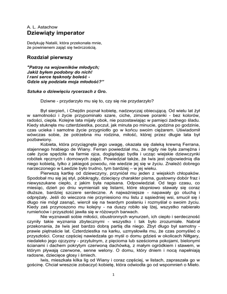 A. L. Astachow Dziewiąty imperator Dedykuję Natalii, która przekonała mnie, że powinienem zająć się twórczością. Rozdział pierwszy "Patrzę na wojowników młodych; Jakiż byłem podobny do nich! I rani serce tęsknoty boleść Gdzie się podziała moja młodość?” Sztuka o dziewięciu rycerzach z Gro. Dziwne - przydarzyło mu się to, czy się nie przydarzyło? Był sierpień, i Chejdin poznał kobietę, nadzwyczaj obiecującą. Od wielu lat żył w samotności i życie przypominało szare, ciche, zimowe poranki - bez kolorów, radości, ciepła. Kolejne lata mijały obok, nie pozostawiając w pamięci żadnego śladu. Kiedy stuknęła mu czterdziestka, poczuł, jak minuta po minucie, godzina po godzinie, czas ucieka i samotne życie przygniotło go w końcu swoim ciężarem. Uświadomił wówczas sobie, że potrzebna mu rodzina, miłość, której przez długie lata był pozbawiony. Kobieta, która przyciągnęła jego uwagę, okazała się daleką krewną Ferrana, stajennego hrabiego de Wiany. Ferran powiedział mu, że nigdy nie była zamężna i całe życie spędziła na farmie ojca, doglądając bydła i ucząc wiejskie dziewczynki robótek ręcznych i domowych zajęć. Powiedział także, że Iwis jest odpowiednią dla niego kobietą, tylko z jakiegoś powodu, nie wiedzie jej się w życiu. Znaleźć dobrego narzeczonego w Łaedzie było trudno, tym bardziej – w jej wieku. Pierwszą kartkę od dziewczyny, przyniósł mu jeden z wiejskich chłopaków. Spodobał mu się jej styl, półokrągły, dziecięcy charakter pisma, gustowny dobór fraz i niewyszukane ciepło, z jakim była napisana. Odpowiedział. Od tego czasu, co miesiąc, dzień po dniu wymieniali się listami, które stopniowo stawały się coraz dłuższe, bardziej szczere serdeczne. A najważniejsze - napawały go otuchą i odprężały. Jeśli do wieczora nie przyniesiono mu listu z sąsiedniej wsi, smucił się i długo nie mógł zasnąć, wiercił się na twardym posłaniu i rozmyślał o swoim życiu. Kiedy zaś przynoszono mu kolejny - na duszy robiło się lżej, wszystko nabierało rumieńców i przyszłość jawiła się w różowych barwach. Nie wyznawali sobie miłości, obustronnych wynurzeń, ich ciepło i serdeczność czyniły takie wyznania zbytecznymi - wszystko i tak było zrozumiałe. Nabrał przekonania, że Iwis jest bardzo dobrą partią dla niego. Zbyt długo był samotny prawie piętnaście lat. Czterdziestka na karku, uzmysłowiła mu, że czas pomyśleć o przyszłości. Coraz częściej nawiedzała go myśl o domu gdzieś w okolicach Niłłgary, niedaleko jego ojczyzny - przytulnym, z pięcioma lub sześcioma pokojami, bielonymi ścianami i dachem pokrytym czerwoną dachówką, z małym ogródkiem i stawem, w którym pływają czerwone, senne welony. O domu, który dniem i nocą napełniają radosne, dziecięce głosy i śmiech. Iwis, mieszkała kilka lig od Wiany i coraz częściej, w listach, zapraszała go w gościnę. Chciał wreszcie zobaczyć kobietę, która odwiodła go od wspomnień o Mieło. 1 Tylko, że małoletni spadkobierca hrabiego, stale znajdował dla swego mentora nowe zajęcia; polowanie z psami, z sokołami, ujeżdżanie koni, treningi z bronią i wszędzie dwunastoletni Fernan di Wirs, hrabia de Wiany, rozkazywał „swojemu najlepszemu w świecie poganinowi", by mu towarzyszył, ciągle myśląc o Iwis. Spotkanie odbyło się w połowie wiosny, w pierwszy prawdziwie słoneczny, od wielu miesięcy, dzień. Pomyślał nawet, że bogowie im sprzyjają, rozpędzając szarą, zachmurzoną zasłonę. Dziewczyna była zupełnie niepodobna do Mieło, ale na swój sposób miła, nawet bardzo; śmiała się, żartowała, brała jego rękę w swoje dłonie, a oczy jej były pełne blasku i ciepła. Wrócił z Wiany pod jej wrażeniem, myśląc, że wreszcie samotność zniknie z jego życia na zawsze. Po raz pierwszy od wielu lat, był prawdziwie szczęśliwy. List otrzymał po upływie tygodnia. Raptem, dwie linijki: „Zgodziłam się wyjść za mąż. Wszystko skończone". Jego serce, zostało po raz drugi w życiu rozbite. Przyśniła mu się pewnej nocy, wkrótce po tym, gdy się rozstali w sposób tak niespodziewany i niepojęty. Zobaczył ją w polu - stała odwrócona do niego plecami i wiatr targał jej ubraniem. - Iwis, dlaczego? - zapytał. - Czy nie zrozumiałeś? Powinnam była wyjść za mąż. Wszystkie kobiety starają się wyjść za mąż, za wszelką cenę. Byłeś głupi. Myślałeś, że stopnieję pod wpływem twoich wytwornych fraz, czułych słów którymi mnie określałeś, z powodu twoich męskich zalet? Byłeś zarozumiałym osłem. Jestem kobietą i wszystko mi jedno, jaki jesteś, ładny czy brzydki, mądry czy głupi, pijany czy trzeźwy, dobry czy zły. Mi jest potrzebny MÓJ mężczyzna, MOJA własność. - Dlaczego, wobec tego, przez tyle czasu dawałaś mi nadzieję? - Ponieważ jestem kobietą. Podoba mi się uwodzić mężczyzn, widzieć, jak coraz bardziej zakochują się, a potem rzucać ich, sprawiać im ból. Prawie fizycznie czuję smak krwi, która płynie z ich rozbitego serca! To smak zwycięstwa, smak kobiecego triumfu! - Jesteś po prostu śmieciem. - A ty głupcem. Naiwnym mazgajem. Na głowie masz siwiznę, a zachowałeś się, jak sztubak. Czyż nie pojąłeś, z kim masz do czynienia? Nagle odwróciła się, jej twarz zmieniła się w potworną maskę. Złośliwie chichocząc, potwór zakręcił się w jakimś bezmyślnym, złowieszczym tańcu, ruszając wprost na niego. Zasłonił się rękoma, szarpnął się do tyłu - i obudził się. Odniósł wrażenie, jakby się potknął. Pokręcił głową, rozglądając się i jednocześnie próbując strząsnąć z siebie resztki nieprzyjemnego snu. Po prostu, zdrzemnął się w siodle. Spał krótko - księżyc był jeszcze wysoko i w jego świetle zobaczył, że oddalił się od wzgórz, zaledwie na kilka setek łokci. Od Mare, gnał swojego ogiera bez wytchnienia, p