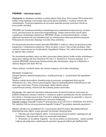 PREMISE – instrukcja użycia Dziękujemy za zakupienie produktu wysokiej jakości firmy Kerr. Przez ponad 100 lat firma Kerr buduje swoją reputację wytwarzając najwyższej jakości produkty o wysokiej wartości dla stomatologów. Przed przystąpieniem do używania materiału prosimy poświęcić chwilę na przeczytanie instrukcji. PREMISE jest światłoutwardzalnym stomatologicznym materiałem kompozytowym na bazie żywic, przeznaczonym do stosowania bezpośredniego. Dzięki zastosowaniu trzech typów wypełniaczy (technologia trójfazowa), PREMISE oferuje wysoką polerowalność, wysoką odporność mechaniczną oraz charakteryzuje się zmniejszonym skurczem polimeryzacyjnym. Wskazania do stosowania obejmują wszystkie klasy próchnicy. Nie ma potrzeby przechowywania materiału PREMISE w lodówce; zaleca się przechowywanie kompozytu w temperaturze pokojowej. Okres trwałości wynosi 3 lata od daty produkcji. Data ważności oznaczona jest na strzykawkach i kapsułkach Unidose. Nie wolno stosować materiału po upływie daty ważności. Do utwardzania produktu zaleca się także stosowanie dobrej jakości źródła światła widzialnego o dużej mocy (takiego jak Kerr Demetron 501 lub L.E. Demetron I). Prosimy pamiętać, że w systemie PREMISE zastosowano kamforochinon jako fotoinicjator; ulega on wzbudzeniu w zakresie długości fali około 465 nm. Należy dołożyć wszelkich starań, aby chronić kompozyt od światła widzialnego. PROSIMY PAMIĘTAĆ: Zakupili Państwo materiał kompozytowy konfekcjonowany w strzykawkach lub kapsułkach Unidose™. Obydwa rodzaje dozowników charakteryzują się pewnymi wymaganiami dotyczącymi obchodzenia się z nimi, których przestrzeganie zapewni doskonałą jakość materiału przez cały okres jego stosowania. Prosimy przestrzegać odpowiednich zaleceń wymienionych poniżej, właściwych dla wybranej postaci dozownika. Strzykawki. Aby zapewnić optymalne funkcjonowanie strzykawek podczas stosowania: po podaniu kompozytu zmniejsz ciśnienie w strzykawce poprzez przekręcenie tłoczka strzykawki o dwa obroty w kierunku przeciwnym. Pozwoli to uniknąć gromadzenia się materiału w zatyczce strzykawki oraz zapewni bezproblemowe używanie kompozytu. Kapsułki Unidose. Kapsułki Unidose™ przeznaczone są do UŻYCIA U JEDNEGO PACJENTA. Nie zamykaj i/lub nie używaj ponownie kapsułki Unidose™ po podaniu materiału pacjentowi. PRZED APLIKACJĄ KOMPOZYTU: ZALECENIA DOTYCZĄCE PRAWIDŁOWEGO POSTĘPOWANIA PRZY ZAKŁADANIU SYSTEMU WIĄŻĄCEGO • Odizoluj ząb od przyległych zębów. Używaj przezroczystych pasków separujących ząb (formówek). Zdecydowanie zaleca się stosowanie koferdamu. • Wykazano, że na zębinie wilgotnej – nie zaś na suchej czy przesuszonej – można uzyskać większą siłę połączenia współczesnych systemów łączących (takich jak OptiBond Solo Plus). UWAGA: „Wilgotny” nie oznacza zanieczyszczenia krwią lub śliną. • Należy ściśle przestrzegać kolejności zakładania podanej w tej ulotce. • Określ dokładnie powierzchnie, które mają zostać pokryte systemem łączącym. • Zaleca się wytrawienie zębiny. • Prosimy upewnić się, że doprowadzane sprężone powietrze jest wolne od oleju oraz innych zanieczyszczeń. OPTIBOND SOLO PLUS I OPTIBOND SOLO PLUS SAMOWYTRAWIAJĄCY PRIMER Jeśli zakupili Państwo materiał PREMISE w postaci zestawu Standard Kit, to zauważą Państwo, że do zestawu dołączono system łączący OptiBond Solo Plus. Jest to system wiążący zalecany do stosowania z wszystkimi kompozytami firmy Kerr. OptiBond Solo Plus zawiera jako wypełniacz 15% szkła barowego, o średnicy cząsteczek 0,4 mikrona – takiego, jakie znajduje się w kompozycie Kerr Point 4. Ta szczególna technologia zapewnia wysoki stopień ochrony przed mikroprzeciekiem, gwarantując przy tym dużą siłę wiązania do wielu różnych rodzajów powierzchni. Wypełniacz ten stanowi nie tylko wzmocnienie strefy hybrydowej, lecz penetruje także do kanalików zębinowych, tworząc prawdziwe „wiązanie strukturalne”. W materiale OptiBond Solo Plus substancje adhezyjne rozpuszczone są w etanolu, co znacznie zmniejsza konieczność pracochłonnego nakładania wielu warstw i wcierania, charakterystycznego dla klejów acetonowych. OptiBond Solo Plus zalecany jest do stosowania w wiązaniu bezpośrednim i pośrednim (w połączeniu z systemami lutującymi). OptiBond Solo Plus dostępny jest w butelkach oraz jednorazowych kapsułkach. System kapsułek (Unidose™) firmy Kerr był pierwszym systemem tego rodzaju, zaplanowanym jako krok w kierunku zapewnienia świeżego materiału dla każdej procedury wiązania oraz jako najlepsze z możliwych zabezpieczenie przed zakażeniem. Rozwiązanie to jest chronione patentem U.S. Patent 5,860,806. OptiBond Solo Plus można stosować z techniką całkowitego wytrawiania („total etch”) lub samowytrawiania („self etch”). Dla wygody dołączono kwas fosforowy, do stosowania przy całkowitym wytrawianiu, oraz butelkę primera OptiBond Solo Plus Samowytrawiający Primer – w przypadku, gdy preferują Państwo technikę samowytrawiania. Poniżej podano zalecenia dla obydwu technik. POŁĄCZENIE KOMPOZYTU PREMISE DO SZKLIWA I ZĘBINY PRZY UŻYCIU OPTIBOND SOLO PLUS. TECHNIKA CAŁKOWITEGO WYTRAWIANIA 1. Odizoluj i osusz ząb. 2. Nanieś wytrawiacz Kerr Gel Etchant* na szkliwo i zębinę i pozostaw na 15 sekund. Opłucz dokładnie upewniając się, że wytrawiacz został usunięty w całości. 3. Osusz lekko, nie przesuszaj. 4. W przypadku stosowania materiału OptiBond Solo Plus dozowanego z butelki, wstrząśnij krótko butelkę przed użyciem. W przypadku stosowania materiału OptiBond Solo Plus w postaci kapsułek Unidose, chwycić kapsułkę za skrzydełka. Każdą część przekręcić w odwrotnym kierunku aż do całkowitego otwarcia. Dłuższą część należy wyrzucić. 5. Wcieraj OptiBond Solo Plus w powierzchnię szkliwa i zębiny delikatnymi ruc