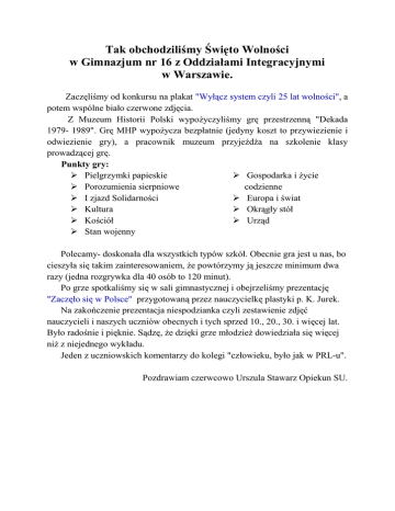Tak obchodziliśmy Święto Wolności w Gimnazjum nr 16 z Oddziałami Integracyjnymi w Warszawie. Zaczęliśmy od konkursu na plakat "Wyłącz system czyli 25 lat wolności", a potem wspólne biało czerwone zdjęcia. Z Muzeum Historii Polski wypożyczyliśmy grę przestrzenną "Dekada 1979- 1989". Grę MHP wypożycza bezpłatnie (jedyny koszt to przywiezienie i odwiezienie gry), a pracownik muzeum przyjeżdża na szkolenie klasy prowadzącej grę. Punkty gry: Pielgrzymki papieskie Gospodarka i życie Porozumienia sierpniowe codzienne I zjazd Solidarności Europa i świat Kultura Okrągły stół Kościół Urząd Stan wojenny Polecamy- doskonała dla wszystkich typów szkół. Obecnie gra jest u nas, bo cieszyła się takim zainteresowaniem, że powtórzymy ją jeszcze minimum dwa razy (jedna rozgrywka dla 40 osób to 120 minut). Po grze spotkaliśmy się w sali gimnastycznej i obejrzeliśmy prezentację "Zaczęło się w Polsce" przygotowaną przez nauczycielkę plastyki p. K. Jurek. Na zakończenie prezentacja niespodzianka czyli zestawienie zdjęć nauczycieli i naszych uczniów obecnych i tych sprzed 10., 20., 30. i więcej lat. Było radośnie i pięknie. Sądzę, że dzięki grze młodzież dowiedziała się więcej niż z niejednego wykładu. Jeden z uczniowskich komentarzy do kolegi "człowieku, było jak w PRL-u". Pozdrawiam czerwcowo Urszula Stawarz Opiekun SU.