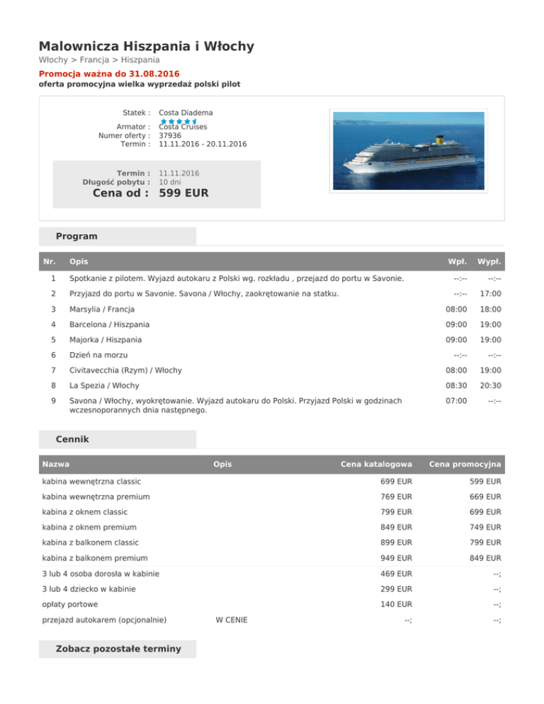 Malownicza Hiszpania i Włochy Włochy > Francja > Hiszpania Promocja ważna do 31.08.2016 oferta promocyjna wielka wyprzedaż polski pilot Statek : Armator : Numer oferty : Termin : Termin : Długość pobytu : Costa Diadema Costa Cruises 37936 11.11.2016 - 20.11.2016 11.11.2016 10 dni Cena od : 599 EUR Program Nr. Opis Wpł. Wypł. 1 Spotkanie z pilotem. Wyjazd autokaru z Polski wg. rozkładu , przejazd do portu w Savonie. --:-- --:-- 2 Przyjazd do portu w Savonie. Savona / Włochy, zaokrętowanie na statku. --:-- 17:00 3 Marsylia / Francja 08:00 18:00 4 Barcelona / Hiszpania 09:00 19:00 5 Majorka / Hiszpania 09:00 19:00 6 Dzień na morzu --:-- --:-- 7 Civitavecchia (Rzym) / Włochy 08:00 19:00 8 La Spezia / Włochy 08:30 20:30 9 Savona / Włochy, wyokrętowanie. Wyjazd autokaru do Polski. Przyjazd Polski w godzinach wczesnoporannych dnia następnego. 07:00 --:-- Cennik Nazwa Cena katalogowa Cena promocyjna kabina wewnętrzna classic 699 EUR 599 EUR kabina wewnętrzna premium 769 EUR 669 EUR kabina z oknem classic 799 EUR 699 EUR kabina z oknem premium 849 EUR 749 EUR kabina z balkonem classic 899 EUR 799 EUR kabina z balkonem premium 949 EUR 849 EUR 3 lub 4 osoba dorosła w kabinie 469 EUR --; 3 lub 4 dziecko w kabinie 299 EUR --; opłaty portowe 140 EUR --; --; --; przejazd autokarem (opcjonalnie) Zobacz pozostałe terminy Opis W CENIE Nie ma innych terminów. Informacje dodatkowe cena obejmuje: ● ● ● ● ● ● ● ● ● ● rejs statkiem Costa Diadema (zakwaterowanie w kabinie wybranej kategorii); przejazd autokarem do portu wg rozkładu; pełne wyżywienie - do dyspozycji restauracja bufetowa działająca ok. 10 h dziennie (śniadanie, lunch, przekąski, podwieczorek) oraz restauracja a la carte (śniadanie, lunch, obiadokolacja); serwis bagażowy i kabinowy; napoje z dystrybutorów w restauracji bufetowej - kawa, herbata, woda oraz soki do śniadań; korzystanie z urządzeń sportowo - rekreacyjnych znajdujących się na pokładzie statku (basen, jacuzzi, centrum fitness, boiska wielofunkcyjne); korzystanie z ręczników basenowych i leżaków; udział w imprezach organizowanych na statku (przedstawienia w teatrze, koncerty, nauka tańca, animacje); ubezpieczenie KL, NW, BAGAŻU; KL 30 000 €, KR 6000 PLN, NWI 16 000 PLN, BP 1 800 PLN; opiekę polskiego pilota . cena nie obejmuje: ● ● ● ● ● opłat portowych; opłat serwisowych dla załogi statku - 10,00 € osoba/dzień, 5,00 dziecko 3-14 lat/dzień; korzystania z punktów usługowych na statku m. in.: (fryzjer, pralnia, fotograf, spa, internet) oraz wydatków osobistych; korzystania z barów oraz napojów zamawianych w restauracji a la carte; pakiet napojów All Inclusive - Cena pakietu 26€ (pakiet bez koktajli) lub 29€ (pakiet z koktajlami) /dzień/osoba dorosła i 16€/dzień/dziecko. Warunkiem skorzystania z pakietu all inclusive jest wykupienie pakietu przez wszystkich pasażerów w kabinie na czas całego rejsu. uwagi: Kabiny 3/4 osobowe nie są dostępne we wszystkich kategoriach, a ich liczba jest ograniczona - sprzedaż tylko po potwierdzeniu. Grupa realizowana przy min. 20 osobach. Kategoria Classic - kabiny usytuowane na niższych pokładach. Możliwość zamówienia do kabiny śniadania za dopłatą. Kategoria Premium - kabiny usytuowane na wyższych pokładach, - bezpłatne śniadanie kontynentalne do kabiny, - możliwość wyboru tury kolacji oraz restauracji. dojazd własny: ● w przypadku dojazdu własnego zniżka w wysokości 100€/os., możliwość rezerwacji parkingu w porcie. przelot samolotem: ● przy przelocie samolotem z Warszawy (lub innego lotniska w Polsce) możliwy transfer na/z lotniska do portu (dodatkowo płatny). Wylot w godzinach wczesnoporannych w dniu zaokrętowania. wycieczki fakultatywne: Malownicza Hiszpania i Włochy Opublikowane informacje nie stanowią oferty handlowej w rozumieniu kodeksu cywilnego