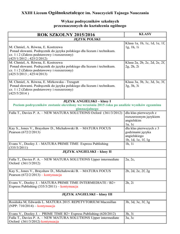 XXIII Liceum Ogólnokształcące im. Nauczycieli Tajnego Nauczania Wykaz podręczników szkolnych przeznaczonych do kształcenia ogólnego KLASY ROK SZKOLNY 2015/2016 JĘZYK POLSKI M. Chmiel, A. Równa, E. Kostrzewa Ponad słowami. Podręcznik do języka polskiego dla liceum i technikum. cz. 1 i 2 (Zakres podstawowy i rozszerzony) (425/1/2012 ; 425/2/2012) M. Chmiel, A. Równa, E. Kostrzewa Ponad słowami. Podręcznik do języka polskiego dla liceum i technikum. cz. 1 i 2 (Zakres podstawowy i rozszerzony) (425/3/2013 ; 425/4/2013) M. Chmiel, A. Równa, E. Mirkowska - Treugutt Ponad słowami. Podręcznik do języka polskiego dla liceum i technikum. cz. 1 i 2 (Zakres podstawowy i rozszerzony) (425/5/2014 ) Klasa 1a, 1b, 1c, 1d, 1e, 1f, 1g, 1h, 1i Klasa 2a, 2b, 2c, 2d, 2e, 2f, 2g, 2h, 2i Klasa 3a, 3b, 3c, 3d, 3e, 3f, 3g, 3h, 3i JĘZYK ANGIELSKI – klasy I Poziom podręczników zostanie określony we wrześniu 2015 roku po analizie wyników egzaminu gimnazjalnego Falla T., Davies P. A. – NEW MATURA SOLUTIONS Oxford (361/3/2012) dla klas pierwszych z rozszerzonym językiem angielskim 1a, 1c Kay S., Jones V., Brayshaw D., Michałowski B. – MATURA FOCUS dla klas pierwszych z 3 Pearson (672/2/2013) godzinami języka angielskiego 1b, 1d, 1e, 1f, 1g Evans V., Dooley J. - MATURA PRIME TIME Express Publishing 1h, 1i (335/3/2011) JĘZYK ANGIELSKI – klasy II Falla T., Davies P. A. – NEW MATURA SOLUTIONS Upper intermediate Oxford (361/3/2012) 2a, 2c, Kay S., Jones V., Brayshaw D., Michałowski B. – MATURA FOCUS Pearson (672/2/2013) – kontynuacja 2b, 2d, 2e, 2f, 2g Evans V., Dooley J. - MATURA PRIME TIME INTERMEDIATE / B2+ Express Publishing (335/3/2011) – kontynuacja 2h, 2i JĘZYK ANGIELSKI – klasy III Rosińska M, Edwards L. MATURA 2015. REPETYTORIUM Macmillan (NPP: 710/2014) – kontynuacja 3b, 3d, 3e, 3f, 3g Evans V., Dooley J. - PRIME TIME B2+ Express Publishing (620/2012) Falla T., Davies P. A. – NEW MATURA SOLUTIONS Upper intermediate Oxford (361/3/2012) kontynuacja 3h, 3i 3a, 3c JĘZYK NIEMIECKI Poziom podręczników dla klas pierwszych zostanie określony we wrześniu 2015 roku po analizie wyników egzaminu gimnazjalnego B. Sekulski, N Drabich, T. Gajownik, C. Serzysko „Infos 1” lub „Infos 2” 1d, 1e, 1h 451/1,2/2012/2015; 451/3,4/2012/2015 S. Dwornikowska, K. Szachowska „Welttour 1” Język niemiecki dla szkół ponadgimnazjalnych. Podręcznik z zeszytem ćwiczeń. Kurs dla początkujących (459/1/2012) Nowa Era S. Dwornikowska, K. Szachowska „Welttour 2” Język niemiecki dla szkół ponadgimnazjalnych. Podręcznik z zeszytem ćwiczeń. (459/2/2012) Nowa Era 2d S. Dwornikowska, K. Szachowska „Welttour 2” Język niemiecki dla szkół ponadgimnazjalnych. Podręcznik z zeszytem ćwiczeń. (459/2/2012) Nowa Era 2e, 2h(1gr.) S. Dwornikowska, K. Szachowska „Welttour 2” Język niemiecki dla szkół ponadgimnazjalnych. Podręcznik z zeszytem ćwiczeń. (459/2/2012) Nowa Era S. Dwornikowska, K. Szachowska „Welttour 3” Język niemiecki dla szkół ponadgimnazjalnych. Podręcznik z zeszytem ćwiczeń. Nowa Era (459/3/2013) 3b, 3f, 3i, 3h S. Dwornikowska, K. Szachowska „Welttour 3” Język niemiecki dla szkół ponadgimnazjalnych. Podręcznik z zeszytem ćwiczeń. Nowa Era (459/3/2013) 3a, 2h(2gr.) Alina Dorota Jarząbek, Danuta Koper: Język niemiecki. „Motive Deutsch neu 2”, „Motive Deutsch neu 3”. Podręcznik z ćwiczeniami. Kurs dla kontynuujących naukę. WSiP (683/2/2014 (683/3/2014) 3d, 3e, 3g Alina Dorota Jarząbek, Danuta Koper: Język niemiecki. „Motive Deutsch neu3”, „Motive Deutsch neu 4”. Podręcznik z ćwiczeniami. Kurs dla kontynuujących naukę. WSiP (683/3/2014 (683/4/2015) 3c JĘZYK HISZPAŃSKI Castro Viudez, Rodero Diez, Espańol en marcha A1, wyd. SGEL (249/1/2009) Klasy pierwsze 2 godz/ tyg Castro Viudez, Rodero Diez, Espańol en marcha A1 i A2, wyd. SGEL (249/1/2009) Klasy drugie 2 godz/ tyg 6 godz/ tyg Castro Viudez, Rodero Diez, Espańol en marcha 3 (B1), wyd. SGEL (249/3/2012) Castro Viudez, Rodero Diez, Espańol en marcha A2, wyd. SGEL (249/1/2009) Kl 3c 5 godz/ tyg Klasy trzecie 2 godz/ tyg JĘZYK FRANCUSKI En action! Fabienne Gallon, Celine Himber, wyd. Hachette (745/1/2015) Francofolie Expess 1 Regine Boutegege, Magdalena Supryn-Klepcarz, wyd. WSz.PWN (382/1/2011) Francofolie Expess 1, 2 Regine Boutegege, Magdalena Supryn-Klepcarz, wyd. WSz.PWN (382/1/2011 JĘZYK WŁOSKI 1b 2b kontynuacja 3 d, 3 i kontynuacja Federica Colombo, ARRIVEDERCI! 1, wyd. EDILINGUA (441/1/2012) HISTORIA S. Roszak, J. Kłaczkow, Poznać przeszłość. Wiek XX. Zakres podstawowy. Wyd. Nowa Era (525/2012). R. Kulesza, K. Kowalewski, Zrozumieć przeszłość. Starożytność i średniowiecze. Zakres rozszerzony. Wyd. Nowa Era (642/1/2013) P. Klint, P. Galik, Zrozumieć przeszłość. Dzieje nowożytne. Zakres rozszerzony. Wyd. Nowa Era (642/2/2013 1b P. Galik, Zrozumieć przeszłość. Lata 1815-1939. Zakres rozszerzony. Wyd. Nowa Era. (624/3/2014) J. Kłaczkow, A. Zielińska, Zrozumieć przeszłość. Dzieje najnowsze po 1939 roku. Zakres rozszerzony. Wyd. Nowa Era (642/4/2015). 3a, 3b MATEMATYKA Matematyka. Podręcznik do liceów i techników klasa 1; Zakres podstwowy 2012. Numer: 412/1/2012 Zbiór zadań do liceów i techników klasa 1. Zakres podstawowy. 2012 Matematyka. Wydawnictwo Pazdro. Marcin Kurczab, Elżbieta Kurczab, Elżbieta Świda Matematyka. Podręcznik do liceów i techników klasa 1; Zakres podstawowy i rozszerzony. Nowa podstawa programowa 2012. numer: 563/1/2012 Matematyka. Zbiór zadań do liceów i techników klasa 1. Zakres podstawowy i rozszerzony. Nowa podstawa programowa 2012 Wydawnictwo Pazdro. Marcin Kurczab, Elżbieta Kurczab, Elżbieta Świda 1a, 1b, 1c, 1d, 1e, 1f, 1g, 1h, 1i 2a, 1a,1b,1c,1d.1f.1h 1g,1e,1i Matematyka. Podręcznik do liceów i techników klasa 2; Zakres podstawowy 2a,2b,2c,2d.2f.2h Nowa podstawa programowa 2012. Numer: 412/2/2012 Matematyka. Zbiór zadań do liceów i techników klasa 2. Zakres p
