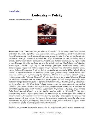 Auto Świat Łódeczką w Polskę 20.06.2001 | Artykuł z wydania 25/01 str. 14 Barchetta (wym. "barketta") to po włosku "łódeczka". Ta ze znaczkiem Fiata, trzeba przyznać, że bardzo zgrabna - ale, delikatnie mówiąc, starszawa. Kiedy wypuszczono ją sześć lat temu na rynek, stanowiła nie lada sensację, jako że Fiat już od dawna nie próbował tworzyć rasowych roadsterów. Więc Barchetta ze swą subtelną linią i pięknie zaprojektowanymi detalami nadwozia oraz kokpitu doskonale się wpasowała w oczekiwania klientów wielbiących włoską szkołę designu. Na dodatek pod długim, klinowatym "nosem" krył się tu od samego początku naprawdę dobry silnik, zapewniający więcej niż zadowalające osiągi i przyzwoitą ekonomikę użytkowania. Ale to było sześć lat temu. Z nie do końca zrozumiałych powodów Włosi aż tak długo czekali z wprowadzeniem do polskiej oferty tego sympatycznego autka, które choć niszowe, nabywców z pewnością by znalazło. Można było zamówić model Coupé, reklamowany jako "piccolo Ferrari", ale nie Barchettę. I tak w całej Europie klienci (a właściwie klientki, bo ten samochód postrzegany był od samego początku jako kobiecy) mogły zadawać szyku w zgrabnym kabrioleciku, a Polki najwyżej wzdychały do jego zdjęć. No cóż, Fiat Auto Poland tłumaczy się, że wprowadzanie na niezbyt chłonny rynek samochodów niszowych wymaga ogromnych nakładów, a nadzieje na sprzedaż sięgają kilku sztuk rocznie. Oczywiście, to prawda - dlaczego więc można było kupić model Coupé, a teraz będzie można także i "łódeczkę"? No cóż, najwyraźniej ścieżki myśli specjalistów od marketingu są niedostępne dla zwykłych śmiertelników. Przestańmy więc wybrzydzać na politykę i przyjrzyjmy się jeszcze raz samochodowi. A jest czemu, bo włoscy inżynierowie naprawdę potrafią. Barchettę zbudowano na płycie podłogowej Fiata Punto, czego jednak nikt nie byłby w stanie się domyślić, gdyby o tym oficjalnie nie informowano. Pięknie narysowana karoseria nawiązuje do najpiękniejszych czasów motoryzacji, Źródło artykułu : www.auto-swiat.pl nie tracąc - mimo sześcioletniej przecież już produkcji właściwie bez zmian stylistycznych - nic ze swej nowoczesności. Piękne detale zawsze stanowiły włoską specjalność, także i Barchetta absolutnie nie rozczarowuje pod tym względem. Przykłady można by mnożyć długo, ale wystarczy wspomnieć o wspaniałych lusterkach zewnętrzych pokrytych matowanym chromem czy designerskim, ale nie przeładowanym ani przerysowanym kokpicie. W kabinie znajdziemy dwa świetnie wyprofilowane fotele o bardzo dobrym podparciu bocznym, a także seryjnie radioodtwarzacz CE z możliwością odtwarzania plików MP3 oraz system stereo z subwooferem. Fiat Barchetta jest typowym roadsterem, a więc autem odkrytym. Ale fabrycznie wyposażonym w miękki, składany dach, chowający się całkowicie pod specjalną pokrywą za oparciami foteli. Na zamówienie dostępny jest też hardtop: sztywny, zdejmowany dach z ogrzewaną szklaną szybą tylną. Zawieszenie ma zdecydowanie sportową charakterystykę, a zarówno przednia, jak i tylna oś połączona jest z nadwoziem za pośrednictwem półram pomocniczych oraz elastycznych elementów tłumiących. Przednie koła prowadzone są na kolumnach McPhersona z trójkątnymi wahaczami poprzecznymi, tylne zaś na wahaczach wzdłużnych. Układ jezdny uzupełniają piętnastocalowe koła wykonane z lekkich stopów oraz opony 195/55R15. Aby podkreślić tak starannie wypracowany sportowy charakter, w modelu tym zastosowano bardzo precyzyjny układ kierowniczy o małym przełożeniu (2,5 obrotu kierownicy między skrajnymi położeniami kół) oraz tarczowe hamulce na wszystkich kołach (z przodu wentylowane) z systemem przeciwpoślizgowym ABS najnowszej generacji. Żeby sprostać wyzwaniom, jakie niesie ze sobą taka konstrukcja nadwozia i karoserii, Fiat montuje pod maską Barchetty czterocylindrowy, 1,8-litrowy silnik benzynowy z szesnastozaworową głowicą. Umieszczona poprzecznie jednostka napędowa przekazuje moc na koła przednie, a rozwijając 130 KM zapewnia bardzo dobre przyśpieszenia (0-100 km/h w ciągu 8,9 s). Co ciekawe, jak na usportowiony silnik dość wysoki jest tu moment obrotowy o wartości 164 Nm. Osiągany jest znamionowo przy 4300 obr./min, ale aż 90 procent tej wartości kierowca ma do dyspozycji pomiędzy 2000 a 6000 obr./min. Oznacza to, że w tym autku równie realny jest spokojny cruising, jak też wyścigowa jazda na najwyższych obrotach. Źródło artykułu : www.auto-swiat.pl