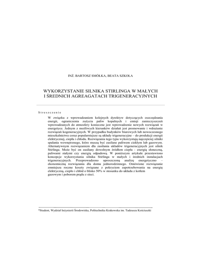 INŻ. BARTOSZ SMÓŁKA, BEATA SZKOŁA WYKORZYSTANIE SILNIKA STIRLINGA W MAŁYCH I ŚREDNICH AGREAGATACH TRIGENERACYJNYCH Streszczenie W związku z wprowadzaniem kolejnych dyrektyw dotyczących oszczędzania energii, ograniczenia zużycia paliw kopalnych i emisji zanieczyszczeń wprowadzanych do atmosfery konieczne jest wprowadzenie nowych rozwiązań w energetyce. Jednym z możliwych kierunków działań jest promowanie i wdrażanie rozwiązań kogeneracyjnych. W przypadku budynków biurowych lub nowoczesnego mieszkalnictwa coraz popularniejsze są układy trigeneracyjne – do produkcji energii elektrycznej, ciepła i chłodu. Rozwiązania tego typu wykorzystują najczęściej silniki spalania wewnętrznego, które muszą być zasilane paliwem ciekłym lub gazowym. Alternatywnym rozwiązaniem dla zasilania układów trigeneracyjnych jest silnik Stirlinga. Może być on zasilany dowolnym źródłem ciepła - energią słoneczną, paliwami stałymi czy energią odpadową. W poniższym artykule przestawiono koncepcje wykorzystania silnika Stirlinga w małych i średnich instalacjach trigeneracyjnych. Przeprowadzono uproszczoną analizę energetyczno – ekonomiczną rozwiązania dla domu jednorodzinnego. Omówione rozwiązanie zmniejsza roczne koszty związane z pokryciem zapotrzebowania na energię elektryczną, ciepło i chłód o blisko 50% w stosunku do układu z kotłem gazowym i poborem prądu z sieci. *Student, Wydział Inżynierii Środowiska, Politechnika Krakowska im. Tadeusza Kościuszki 1. Układy trigeneracyjne 1.1. Idea zastosowania układów trójgeneracyjnych Rosnące ceny paliw kopalnych jak również zmniejszanie się ich dostępności, między innymi w wyniku konfliktów politycznych, prowadzą do poszukiwania nowych rozwiązań opartych na wykorzystaniu energii pochodzącej ze źródeł odnawialnych. Dodatkowym aspektem poszukiwań jest zwiększenie stabilności oraz niezależności energetycznej przez rozproszenie źródeł produkcji i zwiększenie ich różnorodności. Dążąc do pokrycia jednoczesnego zapotrzebowania na energię elektryczną, ciepło i chłód, szczególnie w budynkach biurowych, przemysłowych czy w nowoczesnym budownictwie, coraz częściej stosuje się układy trójgeneracyjne. Pozwalają one wytworzyć powyższe strumienie energii w jednym procesie technologicznym, co pozwala na uzyskanie większej sprawności produkcji użytecznych form energii w stosunku do energetyki rozdzielonej. 1.2. Budowa klasycznego układu trigeneracyjnego Zasada działania układu oparta jest o szereg przemian termodynamicznych. Na klasyczny układ trigeneracyjny składa się silnik spalinowy tłokowy zasilany paliwem gazowym bądź olejem opałowym lub turbina gazowa, układ odzysku ciepła oraz ziębiarka absorpcyjna. W celu wyrównania pracy układu w czasie stosuje się zasobniki ciepła, zimna oraz akumulatory. W układach trigeneracyjnych stosujemy dwa rodzaje chłodziarek absorpcyjnych : bromolitowe, gdzie czynnikiem roboczym jest woda i amoniakalne, gdzie czynnikiem roboczym jest amoniak. Chłodziarki adsorpcyjne bromolitowe ze względu na wytwarzanie czynnika chłodniczego o temperaturze na poziomie 5°C znajdują zastosowanie w układach klimatyzacji. Natomiast ziębiarki amoniakalne ze względu na produkcję czynnika o temperaturze poniżej 0°C mają zastosowanie w układach przemysłowych. Medium zasilającym ziębiarki adsorpcyjne są spaliny, para nasycona lub gorąca woda 1.3. Korzyści wynikające ze stosowania systemów trigeneracyjnych Stosowanie układów trigeneracyjnych niesie wraz z sobą wiele korzyści, zarówno dla środowiska naturalnego jak i potencjalnych odbiorców. Oto niektóre z nich: - wyższa sprawność wytwarzania użytecznych form energii, - mniejsze zużycie paliw pierwotnych, - niższa emisja gazów cieplarnianych, - większa niezależność od sieci energetycznej i zasilanie zastępcze na wypadek awarii sieci - wydłużenie czasu pracy urządzeń cieplnych. 2. Silnik Stirlinga 2.1. Idea działania Silnik Stirlinga jest tłokową maszyną cieplną pracującą w obiegu zamkniętym o zasilaniu zewnętrznym. Jego działanie opiera się na sprężaniu i rozprężaniu gazu roboczego przy jednoczesnym dostarczaniu ciepła do części ciepłej cylindra oraz odbieraniu ciepła od części zimnej. Sprawność silnika jest tym większa im większa jest różnica temperatur pomiędzy częścią ciepłą oraz zimną. Istnieje kilka podstawowych konstrukcji silnika Stirlinga : α, β, γ czy rotacyjny. Zewnętrzne zasilanie pozwala nam na zasilanie silnika dowolnym paliwem. 2.2. Przykładowe zastosowanie silników Stirlinga Podstawowymi zaletami silnika Stirlinga przemawiającymi za jego zastosowaniem są m.in. : ciągła praca, niski poziom hałasu, różnorodność w możliwości zasilania. Silnik Stirlinga stosować możemy w wielu obszarach m.in. : - energetyce, - urządzeniach chłodniczych, klimatyzacyjnych, kriogenicznych, - przemyśle morskim, - przemyśle samochodowym. 3. Koncepcja agregatu trigeneracyjnego 3.1. Opis rozwiązania Celem opracowania jest przestawienie koncepcji agregatu trigeneracyjnego dla małych i średnich budynków. Proponowane rozwiązanie składa się z : - komory paleniska, - silnika Stirlinga z umieszczoną w komorze sondą do odbioru ciepła, omywaną przez spaliny, - generatora prądu oraz akumulatora, - wężownicy wodnej umieszczonej w górnej części paleniska, - buforu ciepła, - zasobnika cwu, - bromolitowej chłodziarki absorpcyjnej, - zasobnika chłodu, - opcjonalnej instalacji solarnej wspomagającej układ. Nadrzędną opcją sterowania agregatem jest zapewnienie pokrycia zapotrzebowania na ciepło oraz chłód a wielkość produkcji energii elektrycznej jest drugorzędna. Spaliny omywają w pierwszej kolejności silnik a następnie wężownicę wodną w celu zapewnienia odpowiedniej temperatury wody trafiającej na bufor ciepła. Chłodna część silnika jest omywana przez wodę wracającą z buf