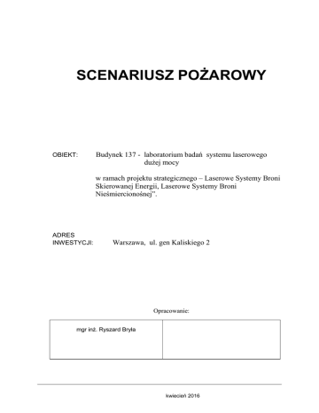SCENARIUSZ POŻAROWY OBIEKT: Budynek 137 - laboratorium badań systemu laserowego dużej mocy w ramach projektu strategicznego – Laserowe Systemy Broni Skierowanej Energii, Laserowe Systemy Broni Nieśmiercionośnej”. ADRES INWESTYCJI: Warszawa, ul. gen Kaliskiego 2 Opracowanie: mgr inż. Ryszard Bryła kwiecień 2016 Teren położony w strefie ochrony konserwatorskiej, zarządzany przez Wojskową Akademię Techniczną. Budynek zlokalizowany na działce nr ewidencyjny10/5, obręb 6-08-11. Dojazd do budynku drogami wewnętrznymi. Zjazd na teren WAT-u istniejący z ulicy Gen. Sylwestra Kaliskiego 2. SCENARIUSZ ROZWOJU ZDARZEŃ 1. Dane o przedmiocie inwestycji 2. Przedmiot, cel i zakres opracowania 3. Podstawa opracowania 4. Materiały wyjściowe 5. Opis budynku 6. Charakterystyka pożarowa zespołu budynków 6.1.Kwalifikacja pożarowa 6.2.Strefy pożarowe 6.3.Warunki ewakuacji 6.4.Urządzenia przeciwpożarowe 7. Ogólne założenia do scenariusza rozwoju zdarzeń w czasie pożaru i organizacja alarmowania. 8. Przykładowy scenariusz rozwoju pożaru. 9. Ustalenia końcowe 10. Podstawa prawna 2 1.Dane o przedmiocie inwestycji. Projektuje się rozbudowę budynku nr 137 . Projektowana rozbudowa o wymiarach 15x10.5m, parterowa, niepodpiwniczona, strop podwieszany. Dach dwuspadowy pokryty blachą trapezową powlekaną. Budynek zaprojektowano w technologii murowanej. Dach części rozbudowanej w konstrukcji stalowej. Dach nad budynkiem istniejącym - konstrukcja drewniana projektowana. Wejścia główne do budynku zadaszone. Projekt przewiduje adaptację pomieszczeń magazynowych i technicznych na zaplecze biurowe związane z działalnością edukacyjną i obsługą rzeczowego zadania. Projektuje się 3 pokoje biurowe, pomieszczenie socjalne, toaletę, śluzę i pomieszczenie lasera, pomieszczenie instalacji elektrycznych oraz salę ćwiczeń laserowych. 2.Przedmiot, cel i zakres opracowania Przedmiotem opracowania jest scenariusz rozwoju zdarzeń w czasie pożaru sterowania technicznymi urządzeniami przeciwpożarowymi dla rozbudowanego budynku nr 137 zwany dalej „scenariuszem”. Koncepcja zabezpieczenia przeciwpożarowego budynku musi zawierać odpowiednie algorytmy współdziałania systemów technicznych (przeciwpożarowych i bytowych), ściśle uzależnione od możliwych scenariuszy pożarowych, które mogą wystąpić w budynku. Odpowiednia reakcja systemów technicznych na pożar w budynku umożliwia uzyskanie optymalnego poziomu bezpieczeństwa ludzi i mienia. Na poziom bezpieczeństwa ludzi w środowisku pożaru wpływają wysokie stężenia gazów toksycznych, narażenie na oparzenia oraz urazy mechaniczne. System zabezpieczeń przeciwpożarowych jest dobierany tak, aby w przypadku pożaru: − użytkownicy budynku nie byli narażeni na inhalację toksycznych gazów pożarowych w dawkach mogących spowodować szkodliwe skutki, − gęstość optyczna dymu w pomieszczeniach i na drogach ewakuacyjnych umożliwiła orientacje w budynku, znajdowanie wyjść ewakuacyjnych, − użytkownicy budynku nie byli narażeni na oddziaływanie cieplne gazów pożarowych i płomieni w natężeniu mogącym zagrozić życiu i zdrowiu, − ekipy ratownicze straży pożarnej prowadzące działanie gaśnicze w budynku nie były narażone na zawalenie elementów konstrukcji. 3.Podstawa opracowania Podstawą merytoryczną opracowania jest zapis § 5 ust. 1 pkt. 11 rozporządzenia Ministra Spraw Wewnętrznych i Administracji z dnia 16 lipca 2009 r. w sprawie uzgadniania projektu budowlanego pod względem ochrony przeciwpożarowej (Dz. U. 2009r. Nr 119, poz.998) oraz inne aktualnie obowiązujące przepisy i normy, podane na końcu opracowania. Scenariusz opracowany został indywidualnie dla przedmiotowej inwestycji i zawiera procedury oraz kolejność działań, a także sekwencje pracy urządzeń przeciwpożarowych w razie powstania pożaru. Odnoszący się do budynku scenariusz pozwala określić możliwości: 3 − rozpoznania i wykrycia źródła pożaru lub innego zdarzenia noszącego znamiona pożaru przez personel obsługi lub użytkowników budynku; − zaalarmowania straży pożarnej, w przypadku gdy służby ochrony budynku stwierdzą, że zagrożenie nie może zostać opanowane własnymi siłami; − bezpiecznej ewakuacji użytkowników oraz mienia ze strefy objętej pożarem, do przestrzeni zabezpieczonej przed pożarem i jego skutkami w taki sposób, aby ewakuowani nie byli narażeni na działanie dymu i gorących gazów, a także aby dym i gorące gazy nie wydostały się poza strefę objętą pożarem; − rozpoczęcia akcji gaśniczej przez służby ratownicze; − bezpiecznej ewakuacji ludzi z pozostałych stref, nie objętych pożarem; − zabezpieczenia mienia i samego budynku. 4.Materiały wyjściowe Opracowanie oparto na następujących materiałach wyjściowych: 1) dokumentacja budowlana obiektu, 2) program inwestycji 3) wyjaśnienia Inwestora. 5 Opis budynku Ogólna charakterystyka Projektuje się rozbudowę budynku nr 137 . Projektowana rozbudowa o wymiarach 15x10.5m, parterowa, niepodpiwniczona, strop podwieszany. Dach dwuspadowy pokryty blachą trapezową powlekaną. Budynek zaprojektowano w technologii murowanej. Dach części rozbudowanej w konstrukcji stalowej. Dach nad budynkiem istniejącym - konstrukcja drewniana projektowana. Wejścia główne do budynku zadaszone. Projekt przewiduje adaptację pomieszczeń magazynowych i technicznych na zaplecze biurowe związane z działalnością edukacyjną i obsługą rzeczowego zadania. Projektuje się 3 pokoje biurowe, pomieszczenie socjalne, toaletę, śluzę i pomieszczenie lasera, pomieszczenie instalacji elektrycznych oraz salę ćwiczeń laserowych. Dane liczbowe budynku po rozbudowie: pow. zabudowy pow. zabudowy w obrysie ścian zewnętrznych pow. schodów i ramp zewnętrznych pow. użytkowa kubatura projektowane dojścia dojazdy z kostki betonowej 356.8m2 333.2m2 23.6m2 261.6m2 1498m3 118m2 6.Charakterystyka pożarowa budynk