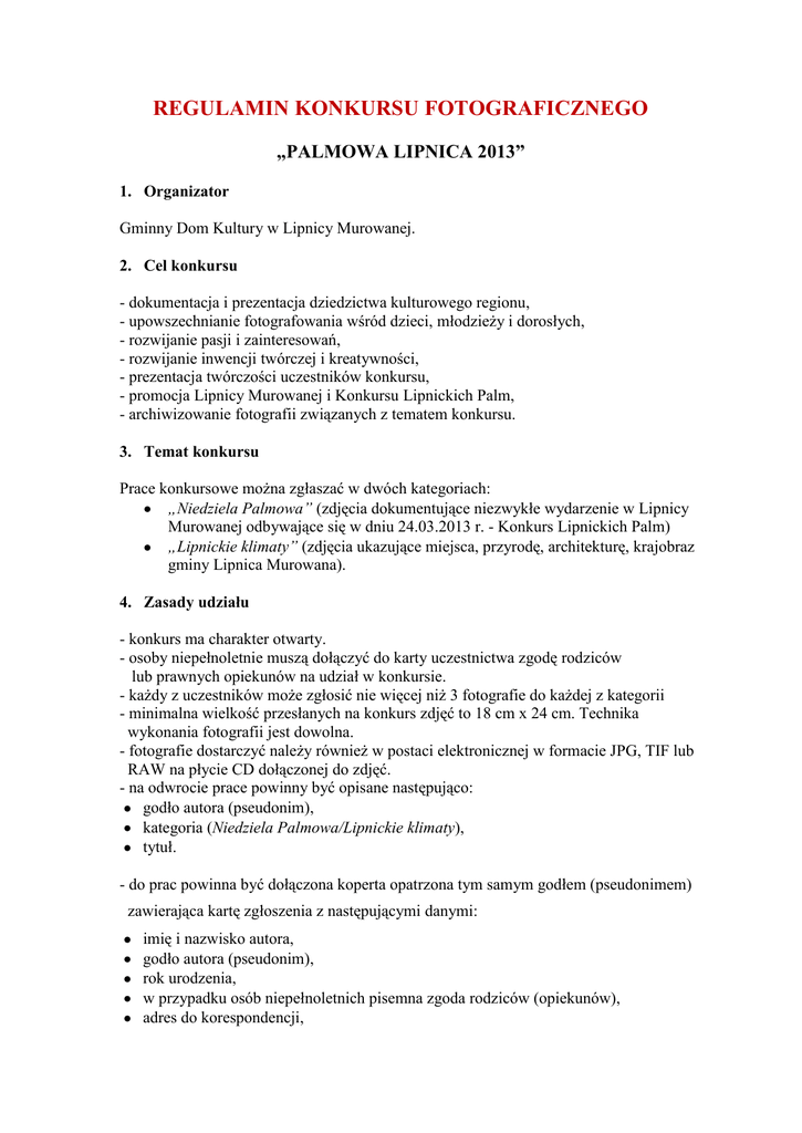 REGULAMIN KONKURSU FOTOGRAFICZNEGO „PALMOWA LIPNICA 2013” 1. Organizator Gminny Dom Kultury w Lipnicy Murowanej. 2. Cel konkursu - dokumentacja i prezentacja dziedzictwa kulturowego regionu, - upowszechnianie fotografowania wśród dzieci, młodzieży i dorosłych, - rozwijanie pasji i zainteresowań, - rozwijanie inwencji twórczej i kreatywności, - prezentacja twórczości uczestników konkursu, - promocja Lipnicy Murowanej i Konkursu Lipnickich Palm, - archiwizowanie fotografii związanych z tematem konkursu. 3. Temat konkursu Prace konkursowe można zgłaszać w dwóch kategoriach: „Niedziela Palmowa” (zdjęcia dokumentujące niezwykłe wydarzenie w Lipnicy Murowanej odbywające się w dniu 24.03.2013 r. - Konkurs Lipnickich Palm) „Lipnickie klimaty” (zdjęcia ukazujące miejsca, przyrodę, architekturę, krajobraz gminy Lipnica Murowana). 4. Zasady udziału - konkurs ma charakter otwarty. - osoby niepełnoletnie muszą dołączyć do karty uczestnictwa zgodę rodziców lub prawnych opiekunów na udział w konkursie. - każdy z uczestników może zgłosić nie więcej niż 3 fotografie do każdej z kategorii - minimalna wielkość przesłanych na konkurs zdjęć to 18 cm x 24 cm. Technika wykonania fotografii jest dowolna. - fotografie dostarczyć należy również w postaci elektronicznej w formacie JPG, TIF lub RAW na płycie CD dołączonej do zdjęć. - na odwrocie prace powinny być opisane następująco: godło autora (pseudonim), kategoria (Niedziela Palmowa/Lipnickie klimaty), tytuł. - do prac powinna być dołączona koperta opatrzona tym samym godłem (pseudonimem) zawierająca kartę zgłoszenia z następującymi danymi: imię i nazwisko autora, godło autora (pseudonim), rok urodzenia, w przypadku osób niepełnoletnich pisemna zgoda rodziców (opiekunów), adres do korespondencji, adres e-mail, numer telefonu kontaktowego, płyta CD z fotografiami w postaci elektronicznej. - prace przesłane do konkursu nie podlegają zwrotowi, a zgłoszenie zdjęć do konkursu jest równoznaczne z przejściem majątkowych praw autorskich na rzecz Organizatora bez prawa do wynagrodzenia twórcy - prace konkursowe należy dostarczyć do dnia 14 czerwca 2013r. na adres: Gminny Dom Kultury w Lipnicy Murowanej 32-724 Lipnica Murowana 74 z dopiskiem „Konkurs fotograficzny” - Zgłoszenie fotografii na konkurs oznacza równocześnie akceptację warunków konkursu i regulaminu. Nadesłanie prac na konkurs jest równoznaczne z deklaracją, iż zdjęcia nie naruszają dóbr osobistych i materialnych oraz praw autorskich osób trzecich i zostały wykonane samodzielnie przez osobę zgłaszającą prace, a osoby portretowane wyrażają zgodę na publikowanie swojego wizerunku. Przesłanie prac jest równoznaczne ze zgodą na bezpłatne ich publikowanie w działaniach promujących fotografię, konkurs, Lipnicę Murowaną, przedsięwzięcia Urzędu Gminy i organizatora – Gminnego Domu Kultury w Lipnicy Murowanej. 5. Organizacja i przebieg konkursu Powołane przez organizatora jury będzie czuwać nad prawidłowym przebiegiem konkursu oraz wyłoni zwycięzców, którym zostaną przyznane nagrody i wyróżnienia w każdej z kategorii. Termin rozstrzygnięcia konkursu: do dnia 05.07.2013r. Termin otwarcia wystawy i wręczenia nagród: do dnia 27.07.2013 r. 6. Nagrody Organizatorzy przewidują dla zwycięzców i uczestników konkursu: pamiątkowe dyplomy, nagrody finansowe oraz nagrody rzeczowe wg posiadanego stanu. O wynikach konkursu, terminie otwarcia wystawy i wręczenia nagród uczestnicy zostaną powiadomieni pocztą elektroniczną lub telefonicznie. Informacja ta będzie również umieszczona na stronie www.lipnicamurowana.pl Serdecznie zapraszamy